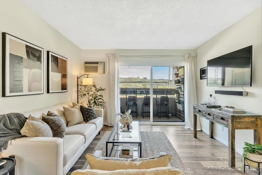Situated on the top floor in the highly sought-after Allied Gardens/Del Cerro neighborhood, this exquisitely upgraded one bedroom, one bath residence offers an exceptional blend of style, comfort, and tranquility.. The thoughtfully renovated kitchen showcases sleek countertops, modern appliances, and refined finishes which open seamlessly into a bright and inviting living space featuring wood flooring throughout. Recent enhancements include fresh interior paint, new windows, and an updated sliding glass door. Step onto your private balcony to take in serene, panoramic views of the surrounding mountains and nearby golf course. Additional highlights include in-unit laundry, a ceiling fan for added comfort, and a dedicated parking space. Residents enjoy access to a well-maintained community featuring a pool and spa, while the exterior has recently undergone extensive upgrades, including refreshed balconies and stairwells, adding to the property’s overall appeal. Situated on the top floor in the highly sought-after Allied Gardens/Del Cerro neighborhood, this exquisitely upgraded one bedroom, one bath residence offers an exceptional blend of style, comfort, and tranquility.. The thoughtfully renovated kitchen showcases sleek countertops, modern appliances, and refined finishes which open seamlessly into a bright and inviting living space featuring wood flooring throughout. Recent enhancements include fresh interior paint, new windows, and an updated sliding glass door. Step onto your private balcony to take in serene, panoramic views of the surrounding mountains and nearby golf course. Additional highlights include in-unit laundry, a ceiling fan for added comfort, and a dedicated parking space. Residents enjoy access to a well-maintained community featuring a pool and spa, while the exterior has recently undergone extensive upgrades, including refreshed balconies and stairwells, adding to the property’s overall appeal.