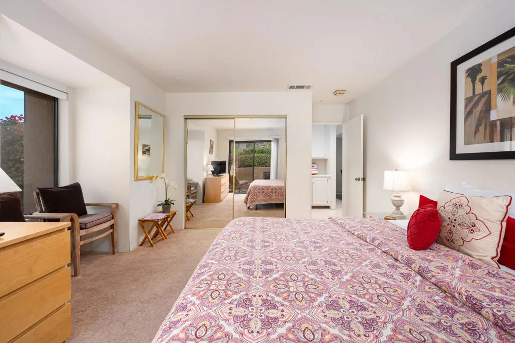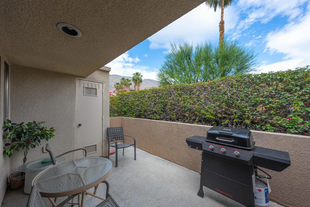 One of only a few single-level, bungalow-style units in the entire community, this 2-bedroom, 2-bath condo offers no neighbor above and features two private patios with stunning mountain views. It is among the most desirable layouts Plaza Villas has to offer and rarely comes to market.The location is unmatched at this price point. Just steps from Agua Caliente Casino and The Spa at Sec-he, minutes from the Palm Springs Convention Center, and a short walk to the restaurants, boutiques, and nightlife of Palm Canyon Drive, you will not find a more centrally located community and unit.Plaza Villas permits 7-night minimum short-term rentals, making this an exceptional income-generating opportunity in one of the desert's most active vacation rental markets. The resort-style community features two pools and spas, tennis and pickleball courts, gated security, and HOA coverage that includes water, trash, cable, and internet, keeping ownership effortless whether you're here full-time, seasonally, or as an investor.Priced competitively with standard 2-bedroom units in the complex, yet offering a layout, privacy, and lifestyle that cannot be replicated. Motivated seller. Don't miss it.