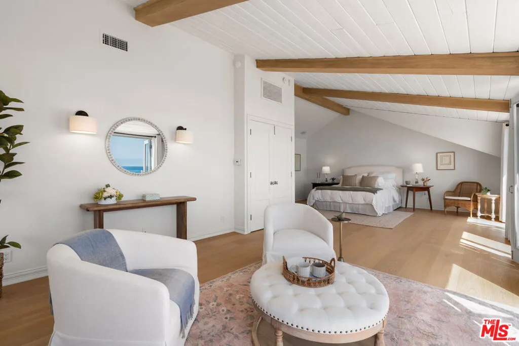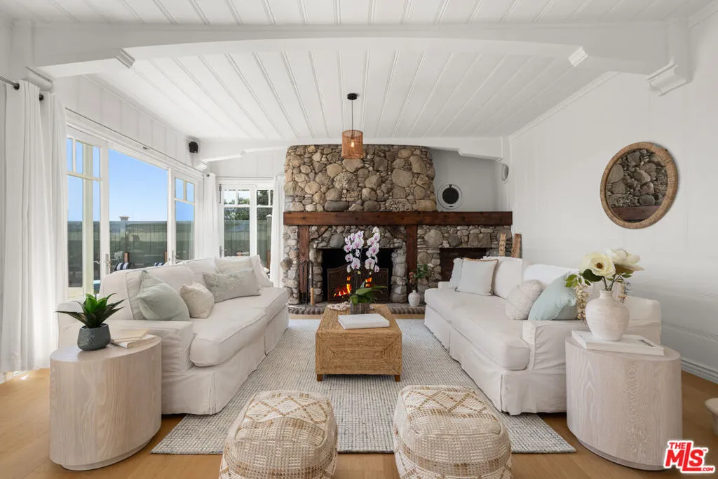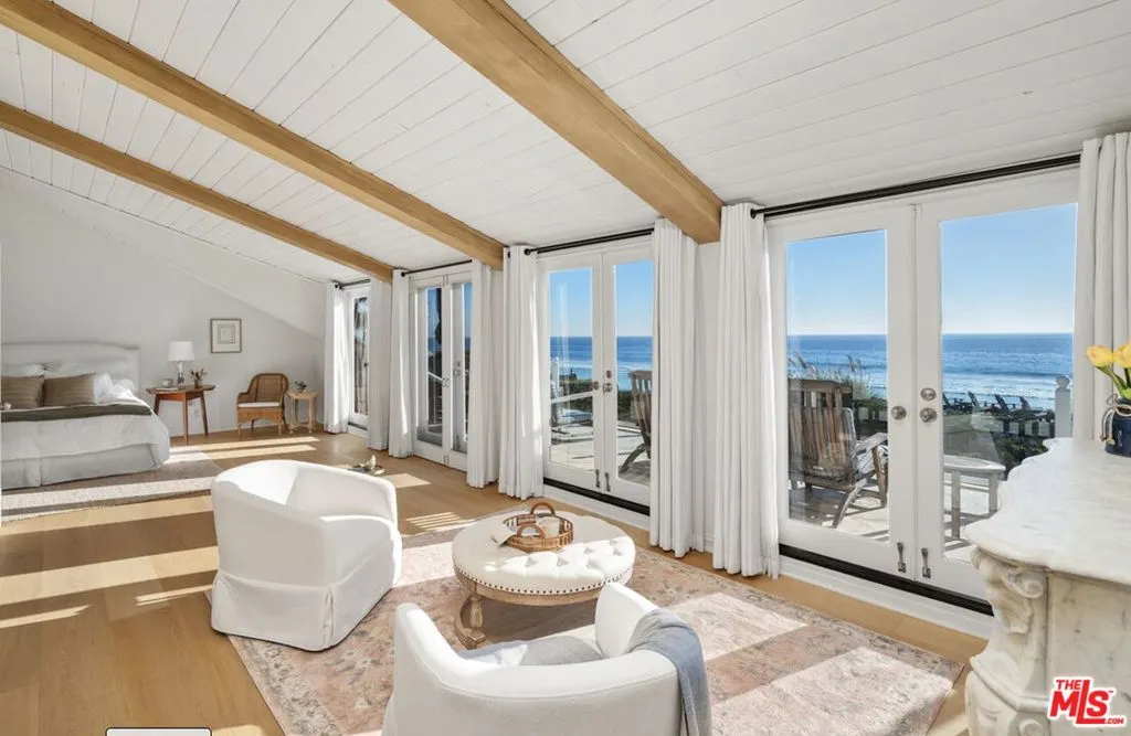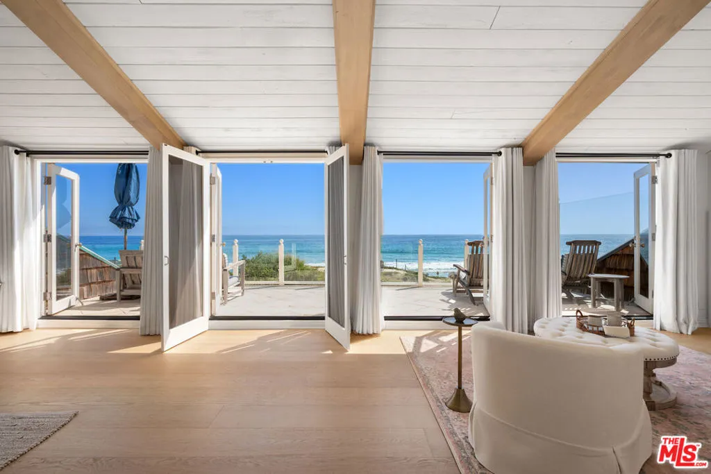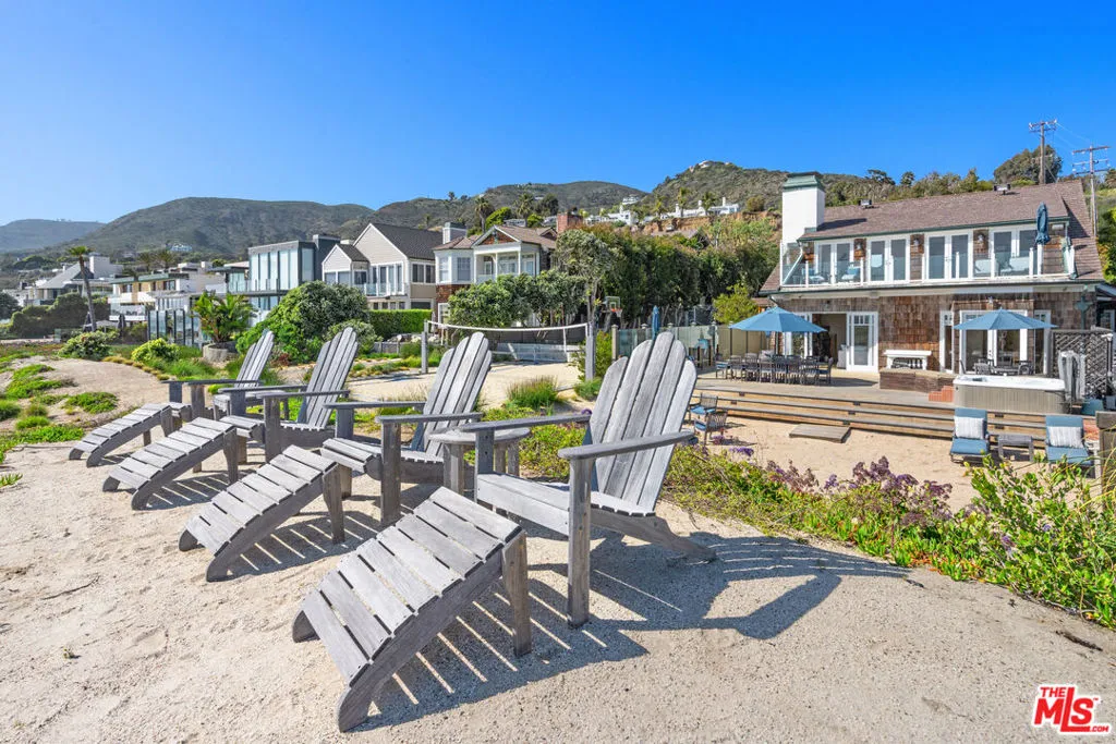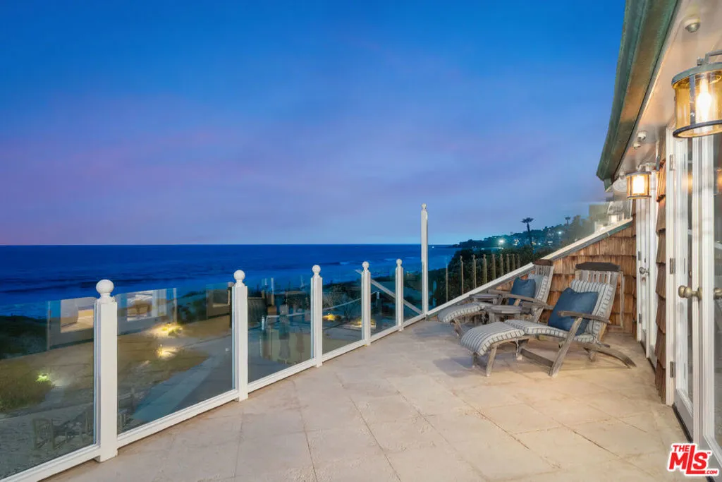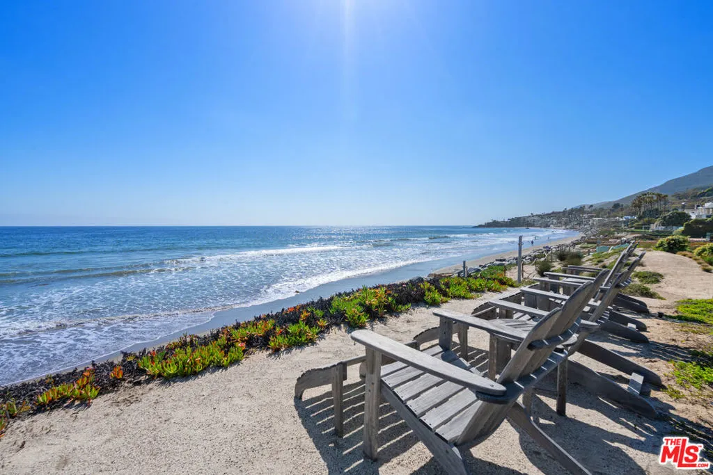 Quintessential 5 bedroom, 5 bath Cape Cod beach home on approx. 50' of sandy beach. Located on desirable Broad Beach Road, you'll find a gated stone entry stairway that leads you through a flower filled garden and into this warm, inviting home. Invite your friends and family to enjoy the large entertaining ocean front deck, where you can bask in the sunshine, BBQ, soak in the spa and enjoy seaside dining. Inside, the open living area features a light, bright living room with wood floors, white painted wood ceilings, custom stone fireplace, and a dining area, all opening to the expansive deck. Between the living area and the huge, gourmet kitchen/breakfast area with separate island you'll enjoy a cozy TV or "hang out" area. The spacious upstairs primary bedroom suite opens to an ocean view deck where you can relax and enjoy the view while you listen to the sound of the surf. It includes a sitting area with fireplace, a luxurious bathroom, a walk-in closet and another bedroom suite upstairs. Two additional bedrooms downstairs share a bathroom and are perfect for kids or guests. A full separate guest house adds to the comfort, convenience and charm of this home. Located just moments from Vintage Market, Malibu Brewery, Kristy's restaurant and many other stores and shops, schools, Bonsall Canyon and Zuma Beach.
