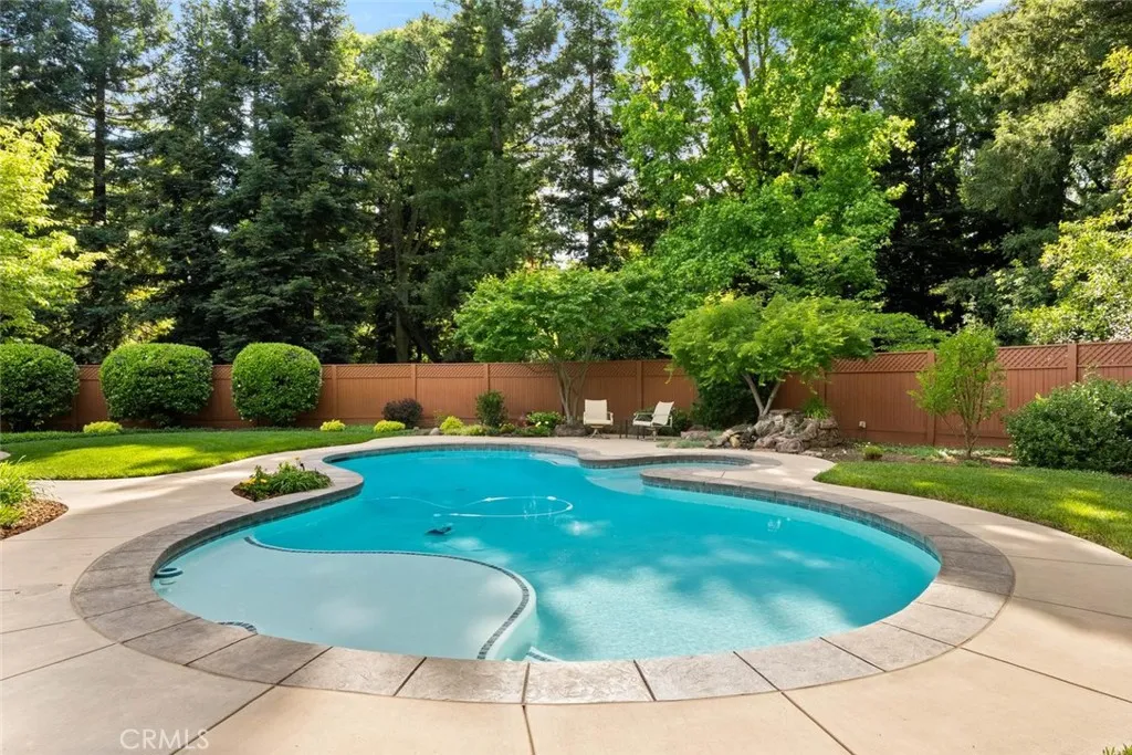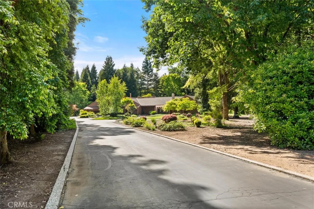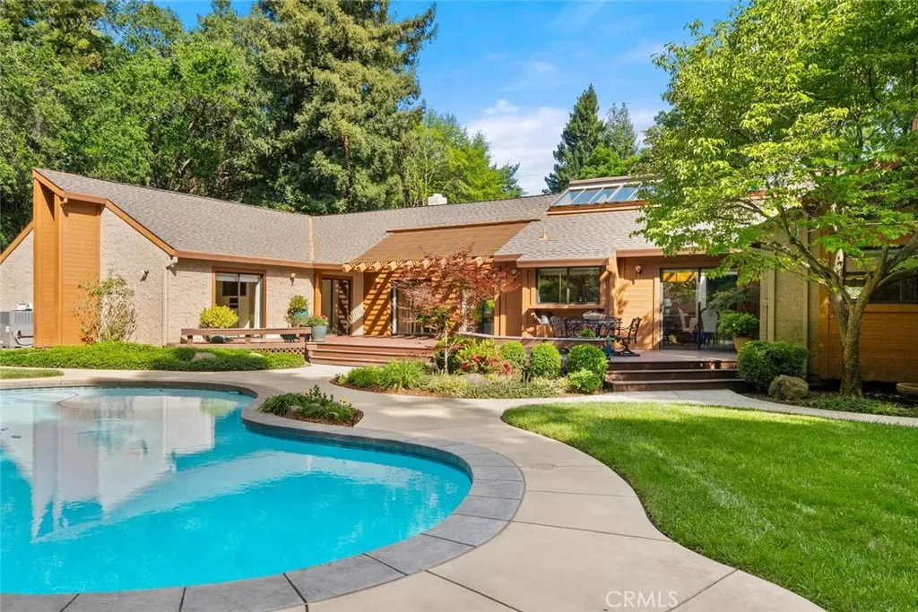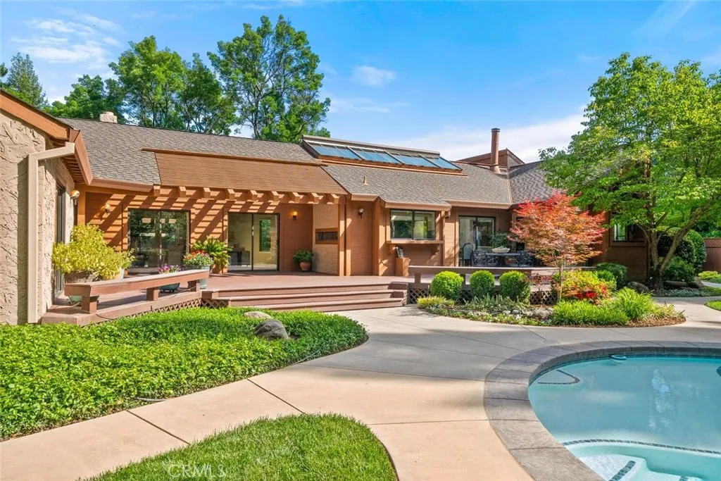 This custom designed 3 bedroom, and 2.5 bath home has been held by its original owner since the day it was built, and now it is available for the very first time. Designed by Lenn Goldmann, the residence sits behind a gated entry along a private circular driveway on one of Chico's most desirable streets, offering a rare combination of thoughtful design, quality construction, and exceptional outdoor living. Beyond the gate, the property opens into what feels like a private park. Mature, lush landscaping creates a serene setting, while the backyard features a pool with a waterfall ideal for entertaining. The outdoor space alone sets this home apart from anything else currently on the market. Inside, skylights throughout fill the home with natural light, equipped with automated covers for effortless control of brightness. A split floor plan provides comfortable separation between the bedrooms and main living areas, while wood beam ceilings add warmth and character. Three generously sized bedrooms are complemented by a dedicated office. Owned solar panels keep energy costs low, and the quality of the build remains evident throughout a testament to craftsmanship that has stood the test of time. The neighborhood further elevates this property. The Chico Creek Nature Center is moments away, and Bidwell Park from the popular One Mile area to the expansive trails of Upper Bidwell provides unmatched outdoor recreation. Golfers will appreciate Canyon Oaks Country Club and Bidwell Park Golf Course, while the Five Mile Recreation Area offers additional space to explore. Homes like this simply do not come to market. If you have been waiting for something truly special in Chico, this is your moment.
