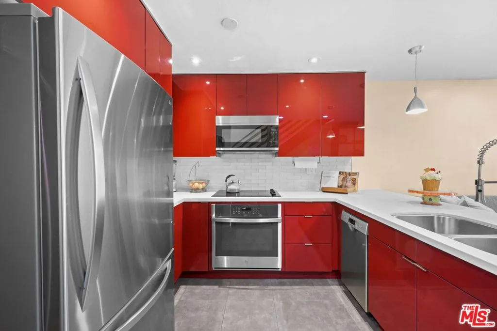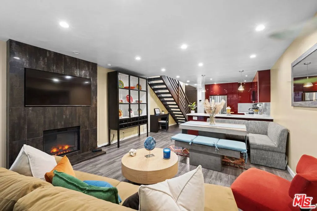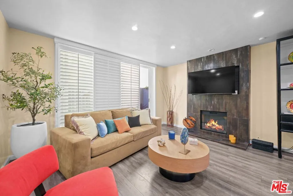 Welcome to 5951 Canterbury Drive #20, a rare corner end-unit in the highly desirable Los Cerros Townhomes of Culver City. This beautifully remodeled two-story townhouse offers 2 bedrooms and 1.5 bathrooms with no neighbors above or below with only one common wall, blending privacy with comfort. The open-concept layout features engineered hardwood floors, recessed lighting, a ceramic electric fireplace with a pull-out TV unit, and a seamless flow between the living, dining, and kitchen areas. A sliding glass door opens to a private patio, perfect for enjoying fresh air and al fresco dining. The fully updated kitchen boasts high-gloss lacquered cabinetry, quartz countertops, ceramic tile flooring, and stainless steel appliances including a refrigerator, microwave, dishwasher, and drop-in oven with stovetop. Upstairs, both bedrooms are spacious and filled with natural light, complemented by energy-efficient windows and modern remodeled bathrooms. Additional highlights include custom wooden railings, new plumbing, a tankless water heater, alarm system, and two side-by-side parking spaces with storage in the secured underground garage. Enjoy community amenities like a heated pool and easy access to Culver City's best dining, shopping, and entertainment all while tucked away in a peaceful, well-maintained neighborhood.