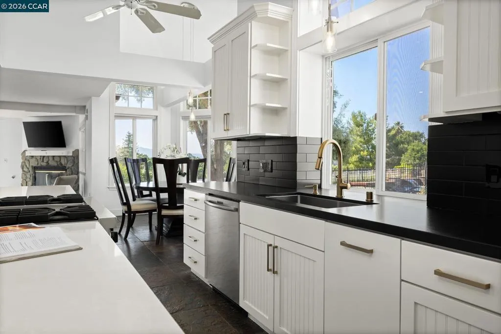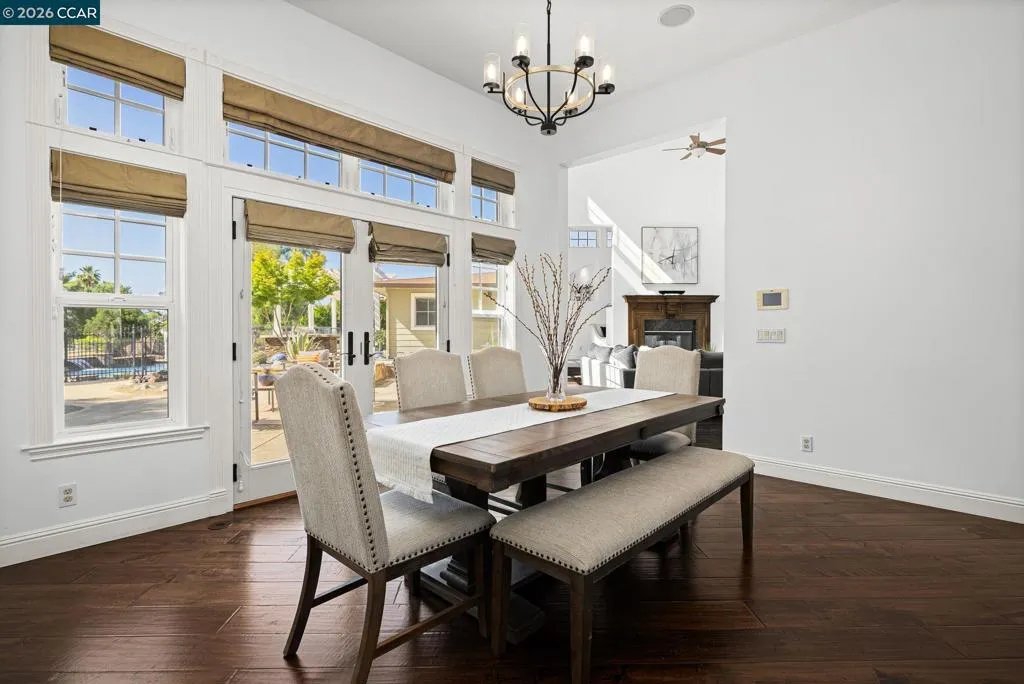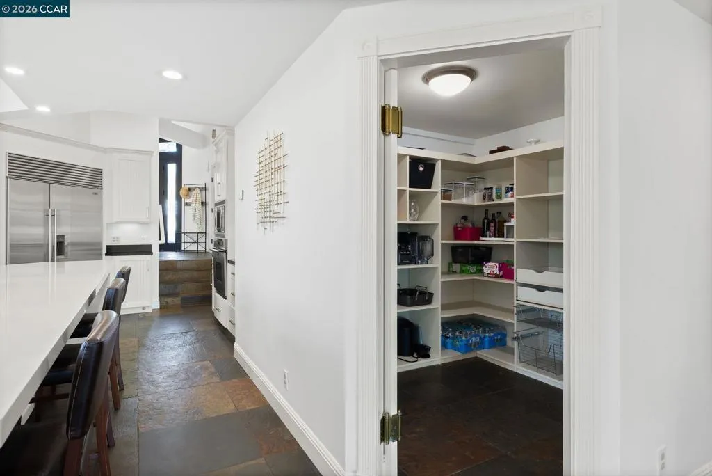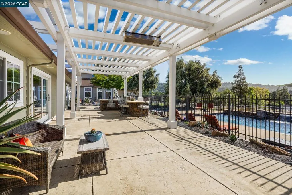Private gated Northgate estate set on over an acre with a flat lot that backs to an open space setting, a detached ADU, resort-style saltwater pool & sweeping hillside views. Offering a 4,783 sq ft main residence (4 bed, 3.5 bath) & a 2,133 sq ft ADU (2 bed, 1.5 bath), the property delivers exceptional scale, privacy & flexibility. A welcoming entry leads to soaring ceilings, expansive windows & a grand-scale living room anchored by a two-way fireplace, connecting to an intimate sitting area. Natural light & volume define the space, with multiple doors extending to the backyard. A built-in wine & beverage bar is positioned between the living & dining rooms. The dining room connects directly to the outdoor areas, complemented by additional built-in cabinetry for storage & architectural detail. A nearby half bath & interior access to the cellar add convenience. The kitchen balances everyday function with entertaining, featuring a large center island with seating, quartz countertops, extensive cabinetry, a built-in refrigerator, gas cooktop & double ovens. A walk-in pantry, utility room & main-level laundry streamline daily use, while a built-in desk area provides flexible workspace. The kitchen flows into a casual dining area & family room with fireplace, creating a natural gathering space. A main-level bedroom ensuite with direct deck access offers flexibility for guests, extended living or a private office. Upstairs, the primary suite is privately positioned with hillside views, a fireplace, sitting area, dual walk-in closets & a large-scale bath with dual sinks, toilets & soaking tubs. Additional bedrooms are generously sized with bright exposures & share an updated hall bath. The ADU adds substantial value & versatility with a 2 bedroom, 1.5 baths, full kitchen, living area, 8-seat theater room & access to a separate garage with laundry hookups & a hydraulic lift. The outdoor setting centers around a saltwater pool & spa with pebble finish, waterfall, fountains & slide. A covered outdoor kitchen with built-in BBQ & bar seating overlooks the pool & surrounding hills, while patios, lawn areas & mature landscaping create distinct areas for entertaining & everyday use. The property also includes a detached flex space positioned between the main home & ADU, ideal for hobbies, gardening or storage. Located near top-rated schools, Shell Ridge Open Space, hiking & biking trails, shopping & dining.