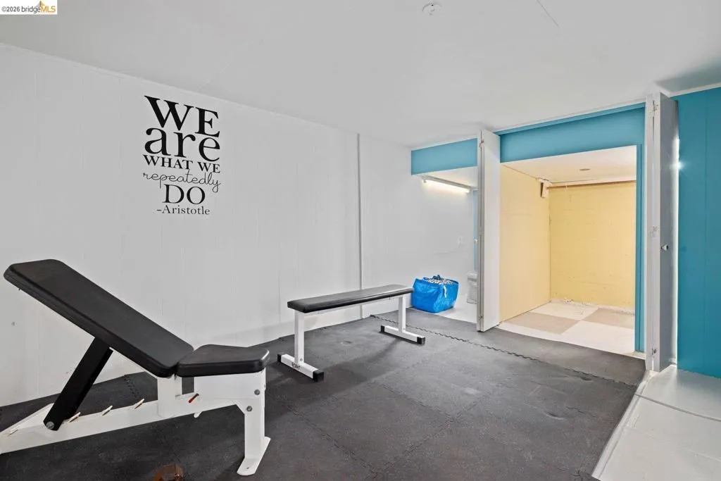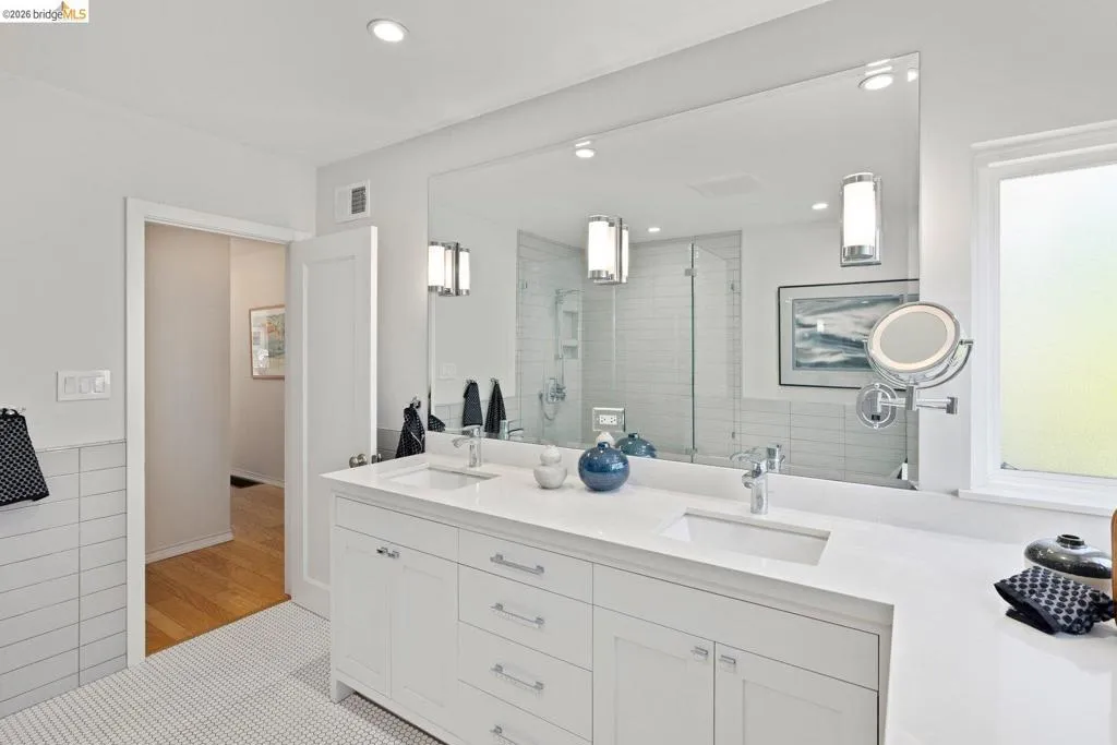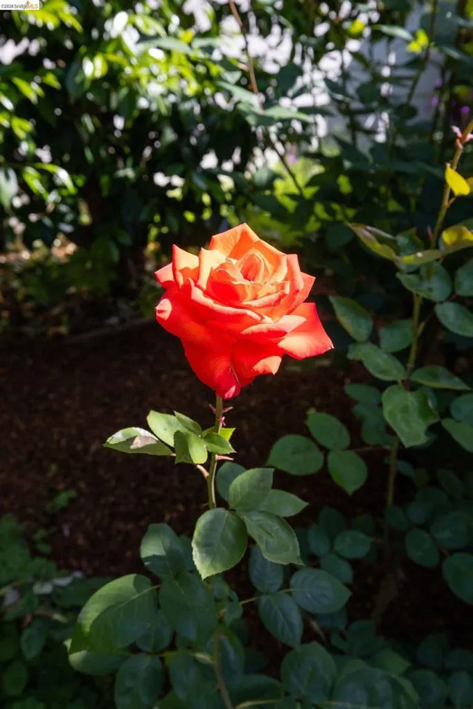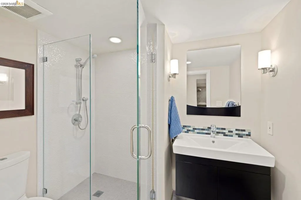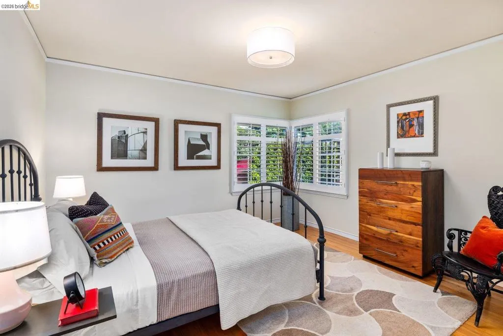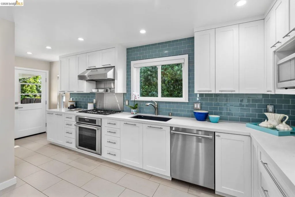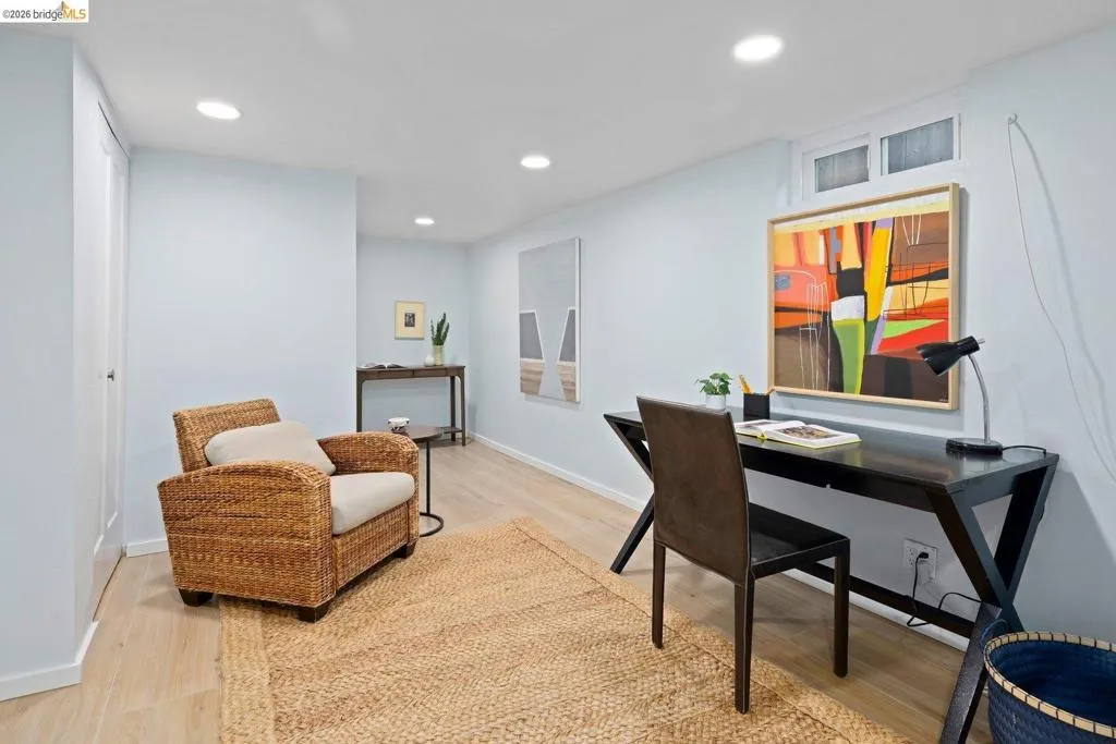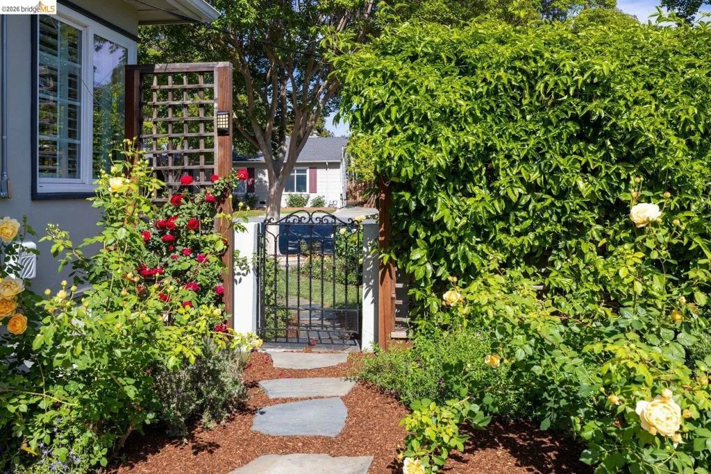Open Houses April 29: 11AM-2PM. May 1: 5-7PM May 2 & 3: 2–4 PM. Refined living in San Leandro’s sought-after Creekside neighborhood. This home lives much larger than its two-bedroom count suggests, offering a thoughtful blend of comfort, style, location, and versatility—just moments from downtown, shopping, restaurants, and BART. A gated front courtyard and large tiled porch create a warm welcome. Inside, rich hardwood floors and natural light through dual-pane windows define the main living spaces. The inviting living room is anchored by a beautifully positioned corner fireplace, ideal for both cozy evenings and lively gatherings. The chef’s kitchen blends function and design with high-end stainless steel appliances, including a Thermador five-burner gas range with warming lamps and a built-in Miele steam oven. A gorgeous subway tile backsplash and abundant cabinetry complete the space. The updated main bathroom offers a spacious layout with dual sinks, a separate soaking tub, and a rain shower. The main bedroom features a generous walk-in closet, while the second bedroom overlooks the rose garden. Downstairs, the home expands in both function and livability. Centered around a built-in wet bar, this level offers multiple rooms ideal for a home office, gym, guest space, or media use, along with abundant storage. A large laundry room and second full bathroom add to the flexibility. The backyard is both functional and inspiring, featuring level space, raised planter beds, mature fruit trees, and established roses. A stone patio with built-in seating and a retractable awning is ideal for outdoor dining. An arbor supports a thriving annual hops crop, adding a unique and personal touch. Thoughtful upgrades throughout include owned solar with dual Tesla Powerwalls, offering energy efficiency and backup power. Additional improvements include upgraded copper plumbing and a recently replaced sewer lateral. Views: Ridge
