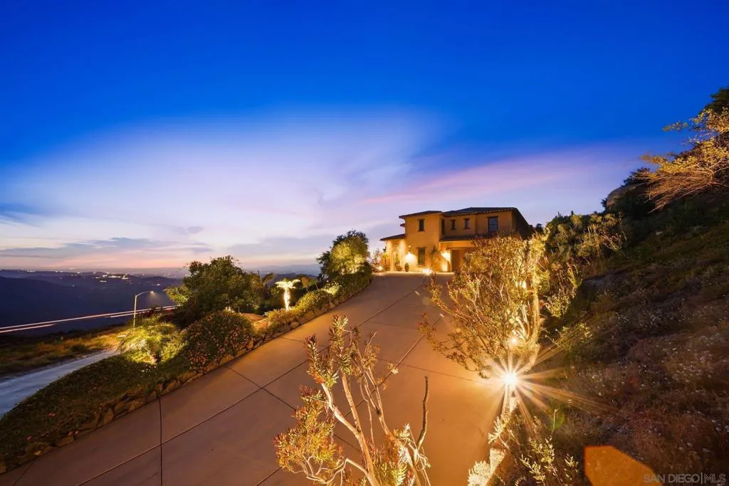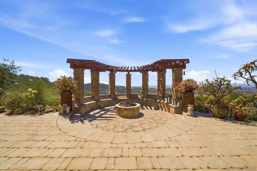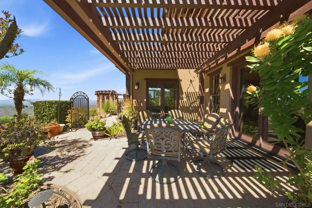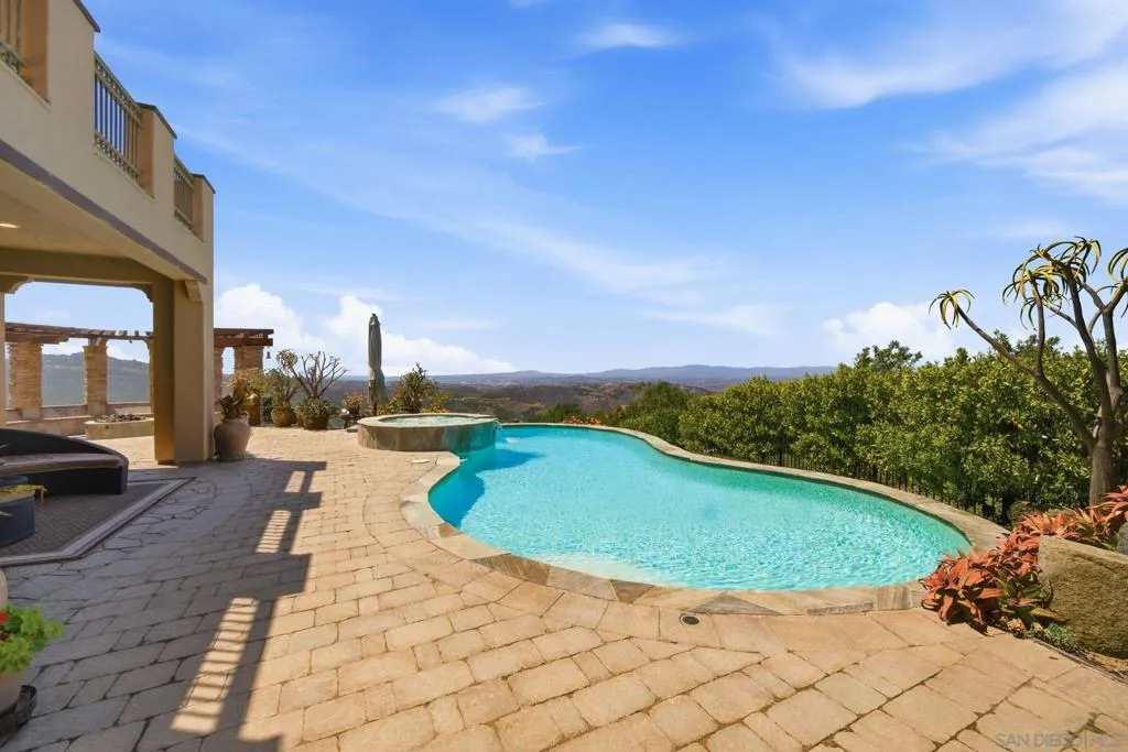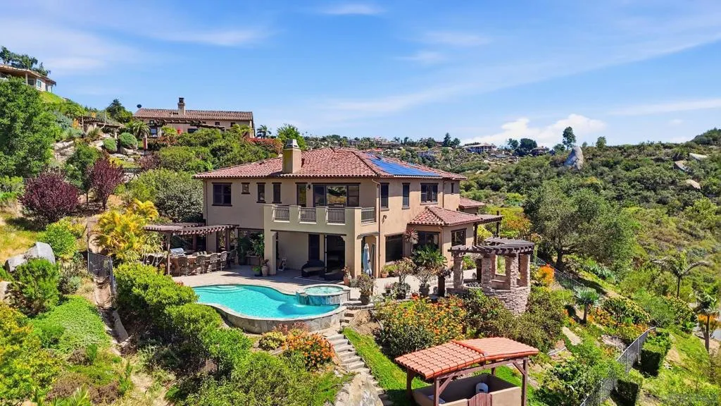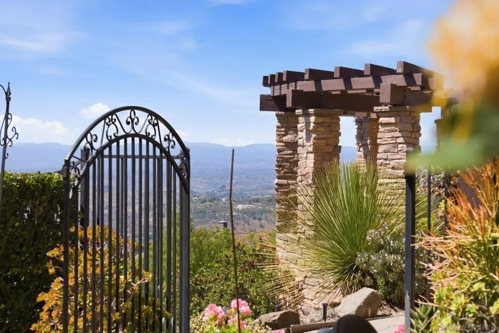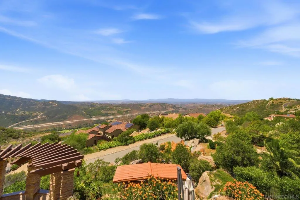 Perched high above North County in the exclusive guard-gated community of Rimrock Estates, this extraordinary residence captures breathtaking panoramic views stretching from rolling mountains to the Pacific Ocean. Set among the serene hills of Escondido, Rimrock is known for its expansive estate homes, unmatched privacy, and elevated vantage points that deliver some of the most dramatic sunsets in all of San Diego County. Designed to embrace its stunning surroundings, the home offers a seamless blend of indoor and outdoor living, with expansive living spaces, walls of glass, and thoughtfully positioned view decks that frame the ever-changing coastal horizon. The open-concept layout is both functional and refined, creating an effortless flow for everyday living and elevated entertaining. The heart of the home is a beautifully appointed kitchen that opens to spacious gathering areas, all oriented to maximize natural light and sweeping views. Generous living spaces provide flexibility for hosting, relaxing, or creating the ultimate retreat. The bedroom layout is designed for comfort and privacy, highlighted by a luxurious primary suite that serves as a peaceful escape, complete with spa-inspired finishes and scenic outlooks. Secondary bedrooms are well-sized and ideal for family, guests, or office use. Additional features include owned solar and a large BBQ area. Outdoor living is where this property truly shines— from sunrise over the mountains to glowing sunsets over the ocean. Whether entertaining or unwinding, the setting feels like a private resort above it all!