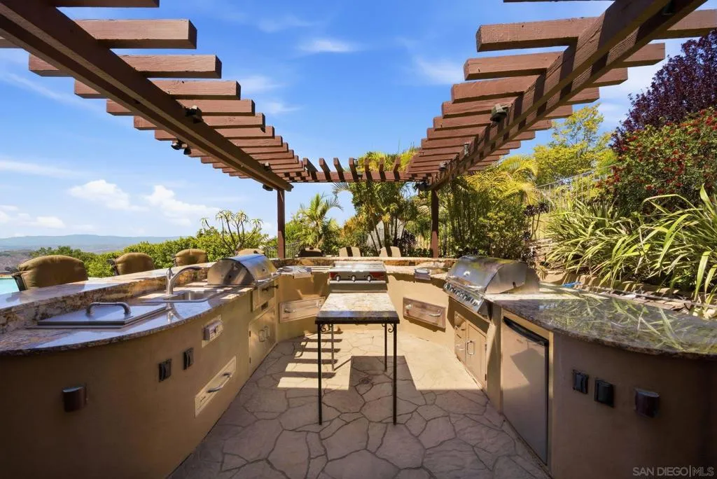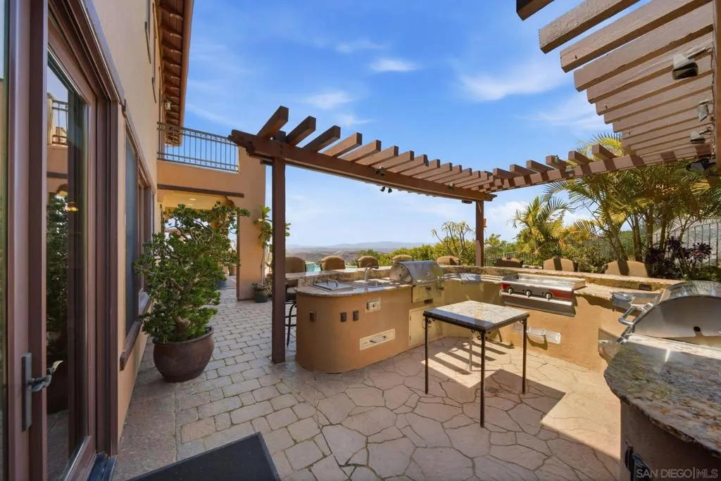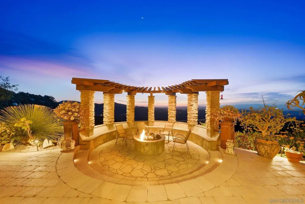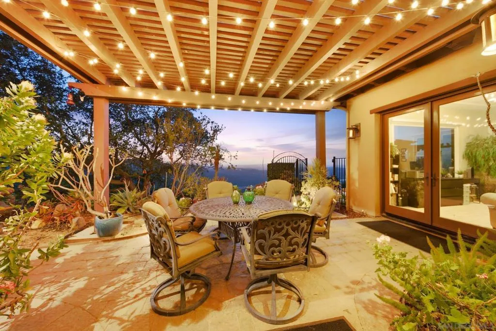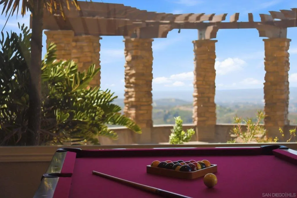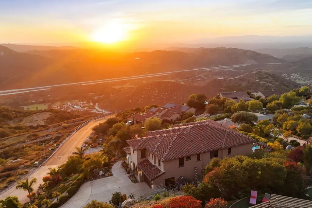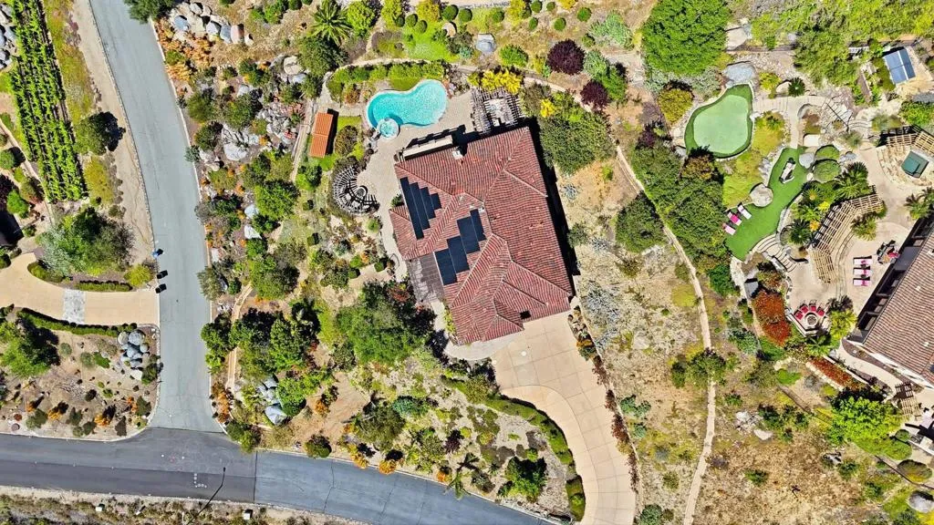 Perched high above North County in the exclusive guard-gated community of Rimrock Estates, this extraordinary residence captures breathtaking panoramic views stretching from rolling mountains to the Pacific Ocean. Set among the serene hills of Escondido, Rimrock is known for its expansive estate homes, unmatched privacy, and elevated vantage points that deliver some of the most dramatic sunsets in all of San Diego County. Designed to embrace its stunning surroundings, the home offers a seamless blend of indoor and outdoor living, with expansive living spaces, walls of glass, and thoughtfully positioned view decks that frame the ever-changing coastal horizon. The open-concept layout is both functional and refined, creating an effortless flow for everyday living and elevated entertaining. The heart of the home is a beautifully appointed kitchen that opens to spacious gathering areas, all oriented to maximize natural light and sweeping views. Generous living spaces provide flexibility for hosting, relaxing, or creating the ultimate retreat. The bedroom layout is designed for comfort and privacy, highlighted by a luxurious primary suite that serves as a peaceful escape, complete with spa-inspired finishes and scenic outlooks. Secondary bedrooms are well-sized and ideal for family, guests, or office use. Additional features include owned solar and a large BBQ area. Outdoor living is where this property truly shines— from sunrise over the mountains to glowing sunsets over the ocean. Whether entertaining or unwinding, the setting feels like a private resort above it all!