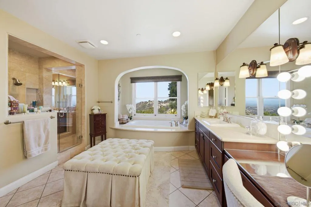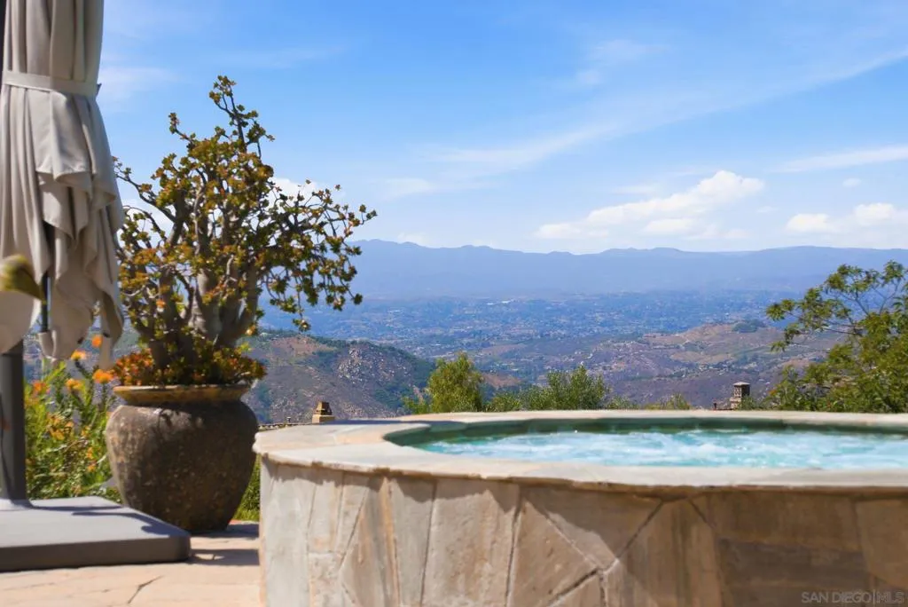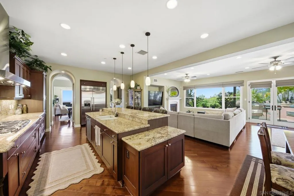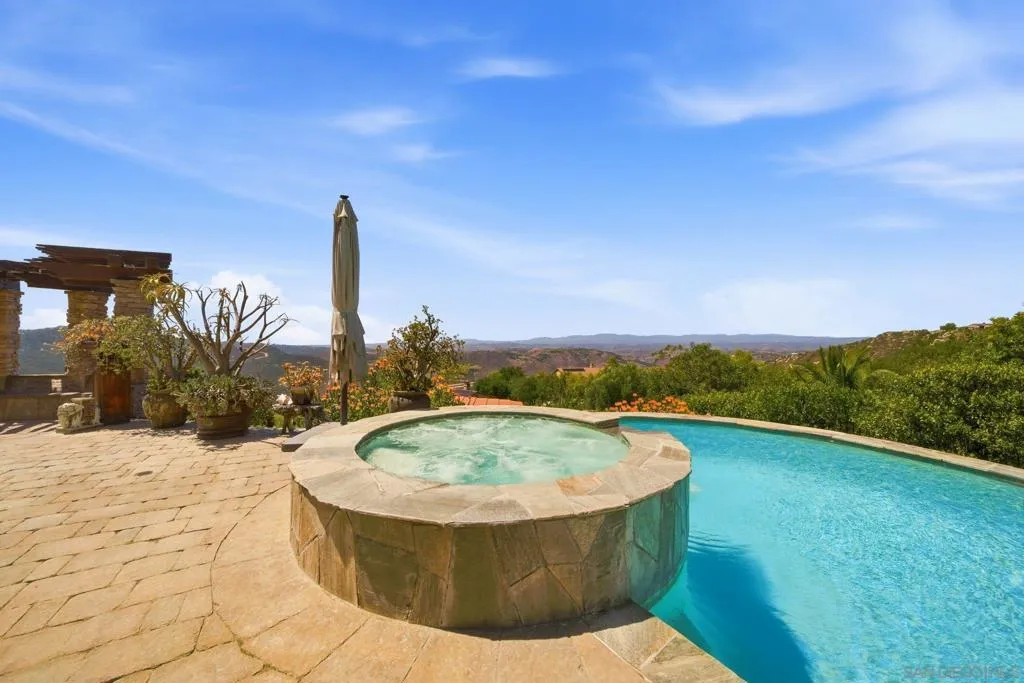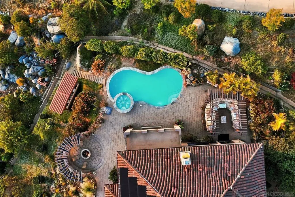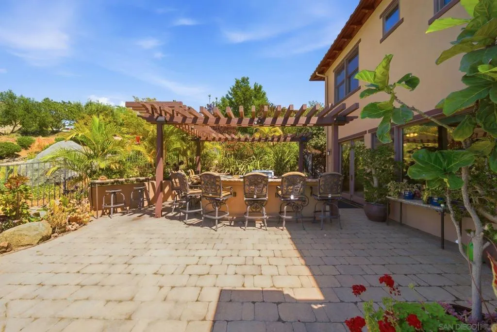 Perched high above North County in the exclusive guard-gated community of Rimrock Estates, this extraordinary residence captures breathtaking panoramic views stretching from rolling mountains to the Pacific Ocean. Set among the serene hills of Escondido, Rimrock is known for its expansive estate homes, unmatched privacy, and elevated vantage points that deliver some of the most dramatic sunsets in all of San Diego County. Designed to embrace its stunning surroundings, the home offers a seamless blend of indoor and outdoor living, with expansive living spaces, walls of glass, and thoughtfully positioned view decks that frame the ever-changing coastal horizon. The open-concept layout is both functional and refined, creating an effortless flow for everyday living and elevated entertaining. The heart of the home is a beautifully appointed kitchen that opens to spacious gathering areas, all oriented to maximize natural light and sweeping views. Generous living spaces provide flexibility for hosting, relaxing, or creating the ultimate retreat. The bedroom layout is designed for comfort and privacy, highlighted by a luxurious primary suite that serves as a peaceful escape, complete with spa-inspired finishes and scenic outlooks. Secondary bedrooms are well-sized and ideal for family, guests, or office use. Additional features include owned solar and a large BBQ area. Outdoor living is where this property truly shines— from sunrise over the mountains to glowing sunsets over the ocean. Whether entertaining or unwinding, the setting feels like a private resort above it all!