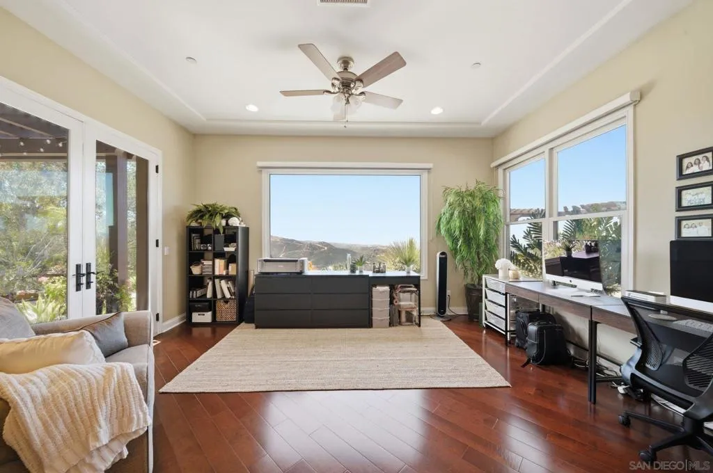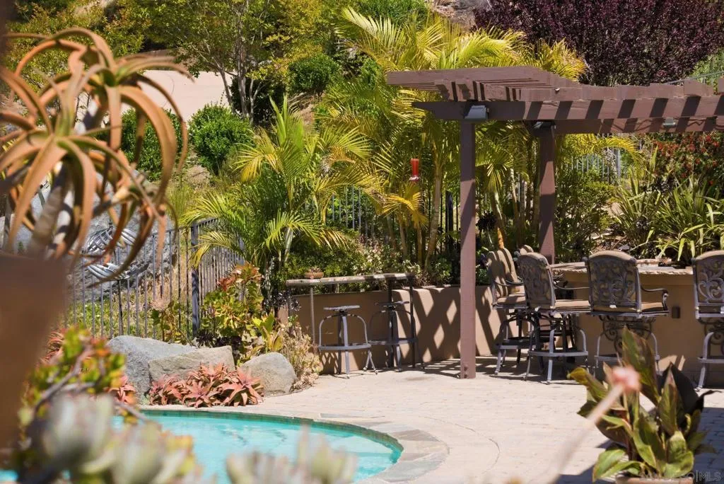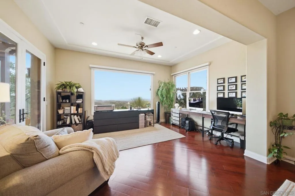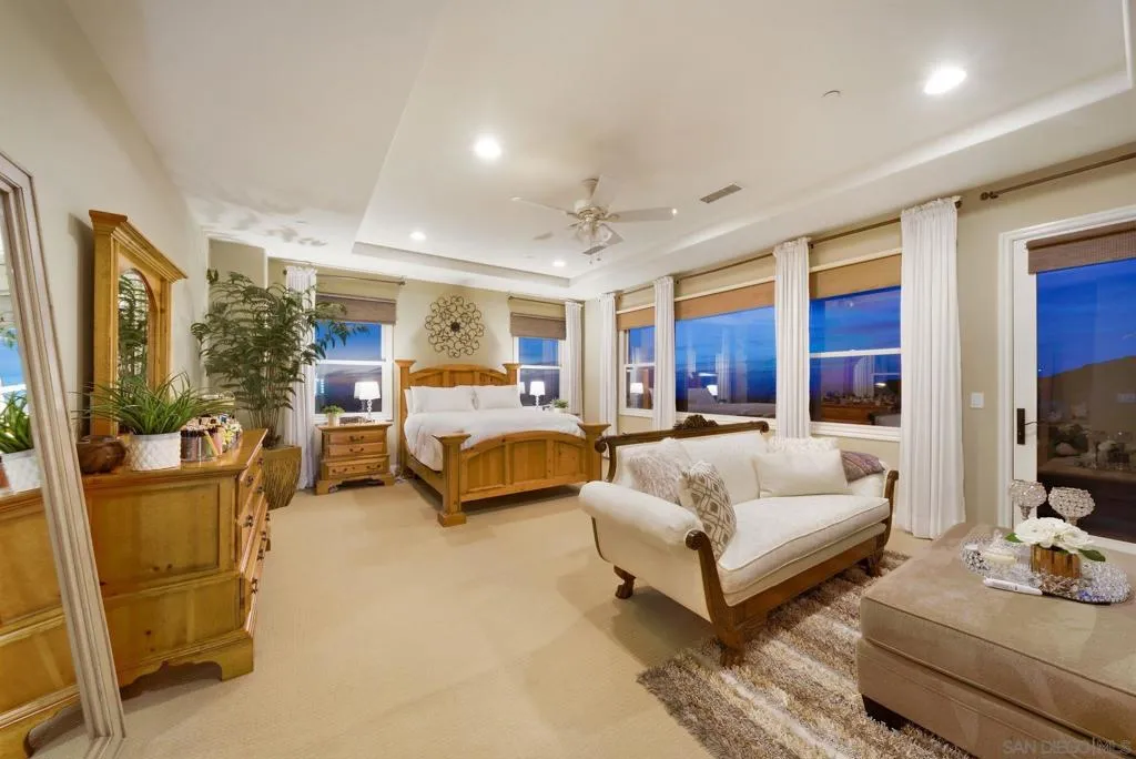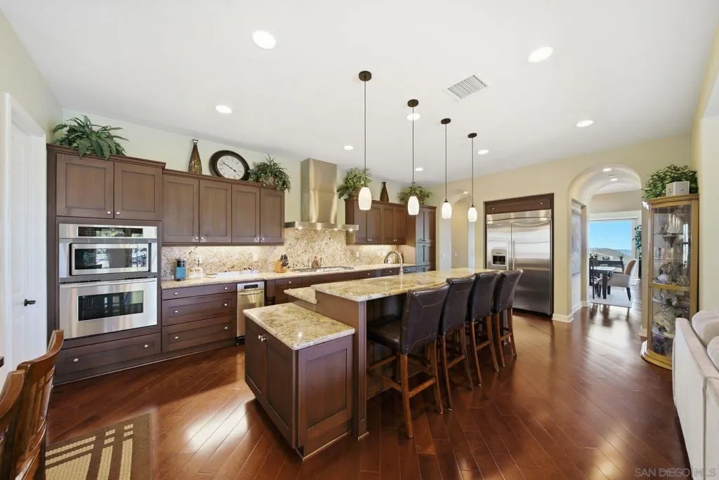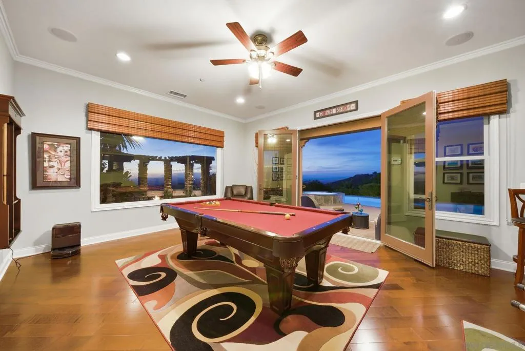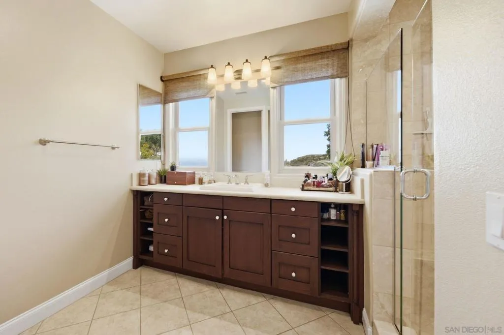 Perched high above North County in the exclusive guard-gated community of Rimrock Estates, this extraordinary residence captures breathtaking panoramic views stretching from rolling mountains to the Pacific Ocean. Set among the serene hills of Escondido, Rimrock is known for its expansive estate homes, unmatched privacy, and elevated vantage points that deliver some of the most dramatic sunsets in all of San Diego County. Designed to embrace its stunning surroundings, the home offers a seamless blend of indoor and outdoor living, with expansive living spaces, walls of glass, and thoughtfully positioned view decks that frame the ever-changing coastal horizon. The open-concept layout is both functional and refined, creating an effortless flow for everyday living and elevated entertaining. The heart of the home is a beautifully appointed kitchen that opens to spacious gathering areas, all oriented to maximize natural light and sweeping views. Generous living spaces provide flexibility for hosting, relaxing, or creating the ultimate retreat. The bedroom layout is designed for comfort and privacy, highlighted by a luxurious primary suite that serves as a peaceful escape, complete with spa-inspired finishes and scenic outlooks. Secondary bedrooms are well-sized and ideal for family, guests, or office use. Additional features include owned solar and a large BBQ area. Outdoor living is where this property truly shines— from sunrise over the mountains to glowing sunsets over the ocean. Whether entertaining or unwinding, the setting feels like a private resort above it all!