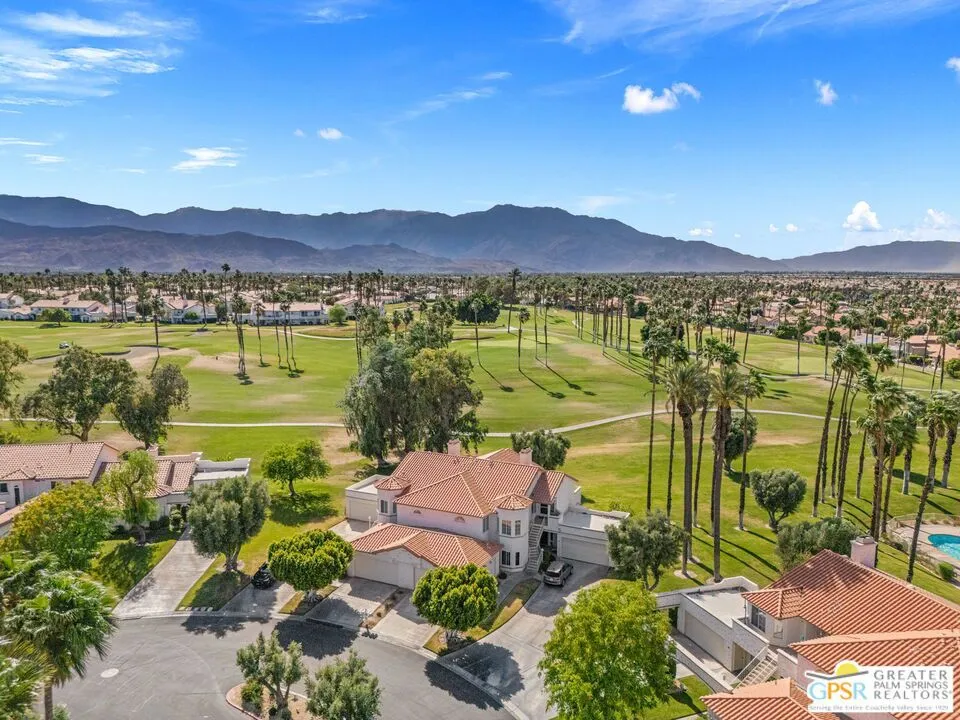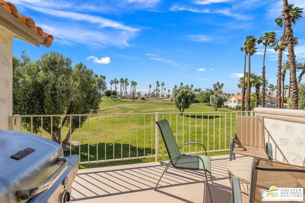 Positioned on the golf course behind the gates of Desert Falls Country Club, this upper-level villa offers panoramic fairway and mountain views, short-term rentals are permitted, and it is conveniently located in central Palm Desert. The open living area is anchored by a classic gas fireplace and a built-in wet bar, with large sliding glass doors that extend the living space to a balcony overlooking the greens. The kitchen features rich wood cabinetry, updated granite countertops, and a pass-through window that seamlessly connects to the dining area. The primary suite includes a semi-circular sunburst window, mirrored closets, a spacious en-suite bath with a walk-in shower, and direct access to the main balcony. A comfortable guest bedroom and a second full bath complete the layout. Two-car garage parking is included. Desert Falls Country Club amenities include a Championship Golf Course, fitness center, tennis and pickleball courts, and 29 pools and spas throughout the community.