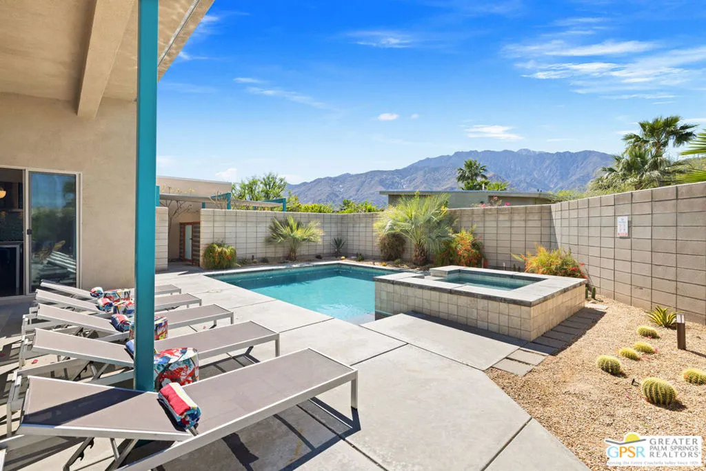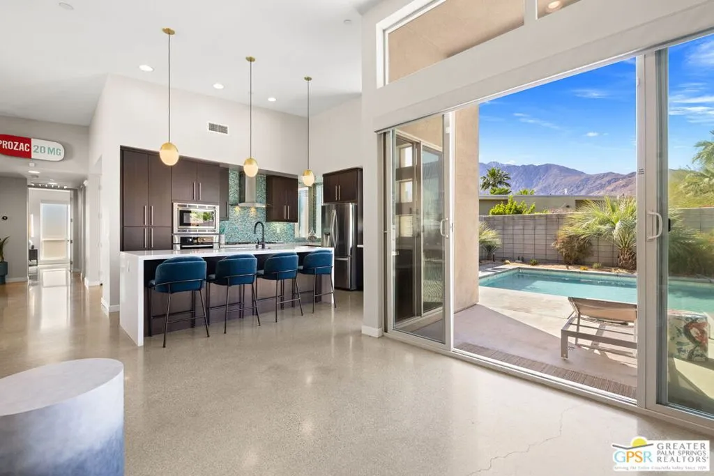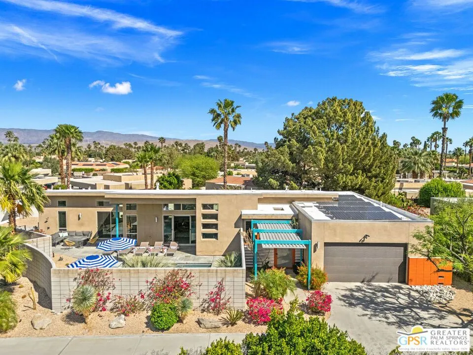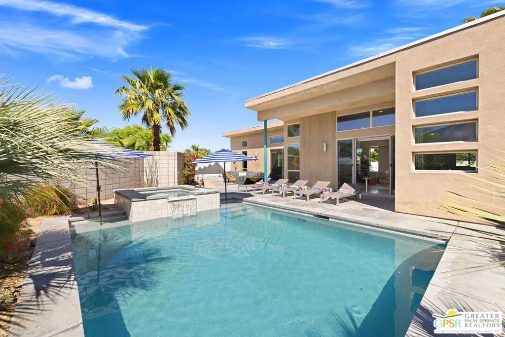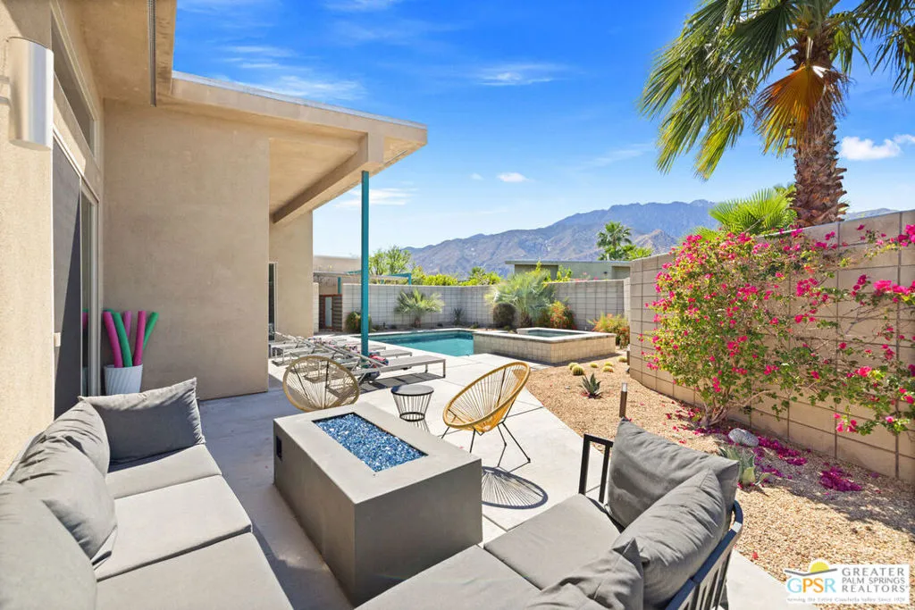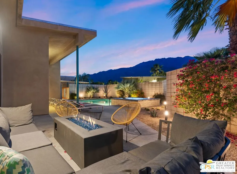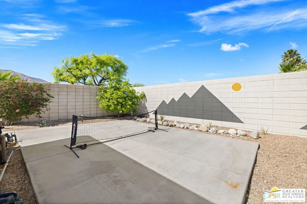 Big views. Bold style. A standout Murano residence positioned at the end of a cul de sac delivers the kind of Palm Springs living people come here for, with excellent short term rental flexibility for investors and part time use. Set on an oversized lot with mountain views, this west facing property pairs clean modern lines with a resort style setting. Vaulted ceilings and polished concrete floors frame a huge open living space anchored by a floating linear fireplace. Expansive glass doors open to the outdoors, creating an easy indoor outdoor connection. The kitchen is a showstopper with an XL quartz waterfall island, bar seating, specialty lighting, and a premium appliance suite including Bosch. The layout offers great separation with two primary suites, including a main retreat that opens to the backyard with a spa style bath featuring soaking tub, walk in shower, dual vanities, and a custom walk in closet, while a third bedroom adds flexibility. Outdoors, the ultra private backyard shines with a heated PebbleTec saltwater pool and spa, piped natural gas fire pit, and outdoor dining under string lights, plus a regulation size bocce court and private pickleball court alongside citrus trees including Pomelo and Meyer lemon. Owned solar with 16 panels, tankless water heater, solar shades, 2 zone HVAC, and a 220 volt EV charging station enhance efficiency. Attached two car garage. NO HOA FEES and Fee Land you own.