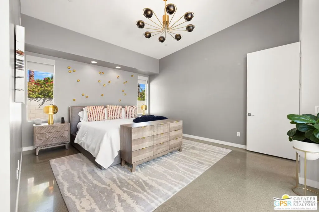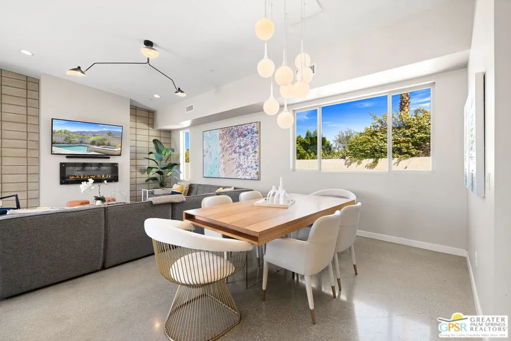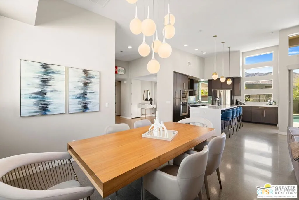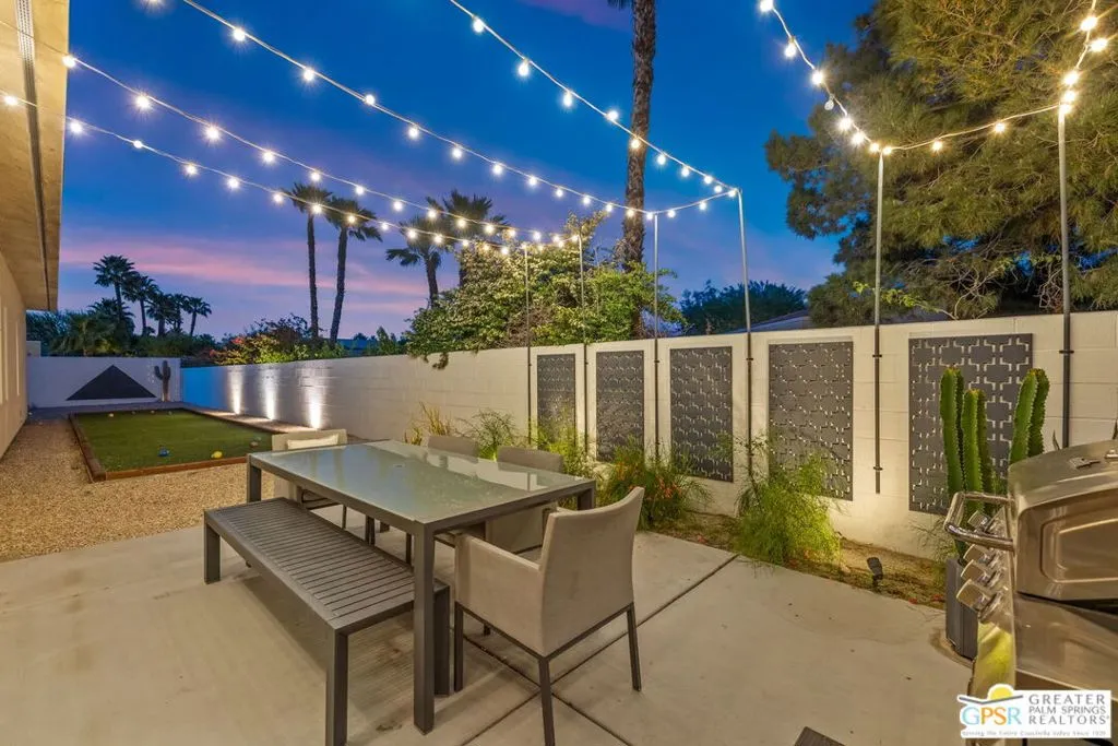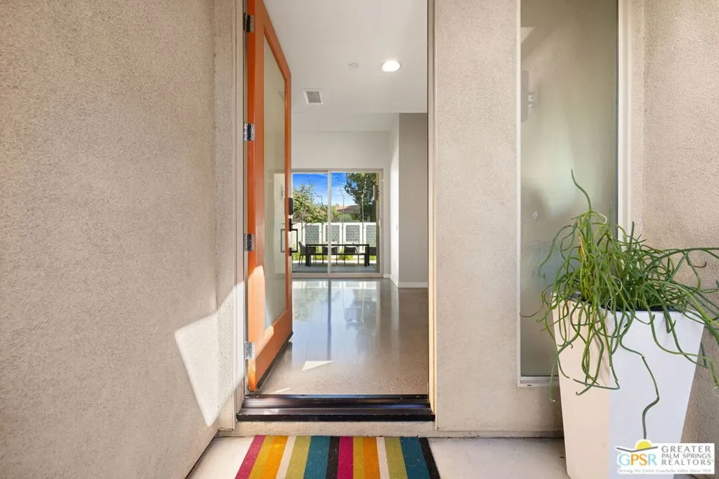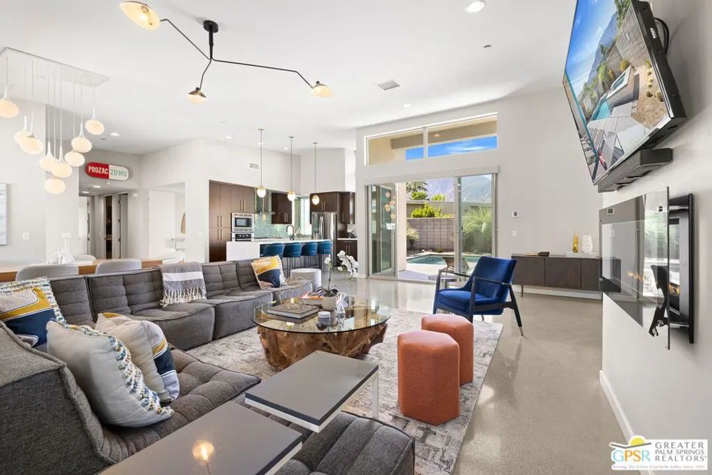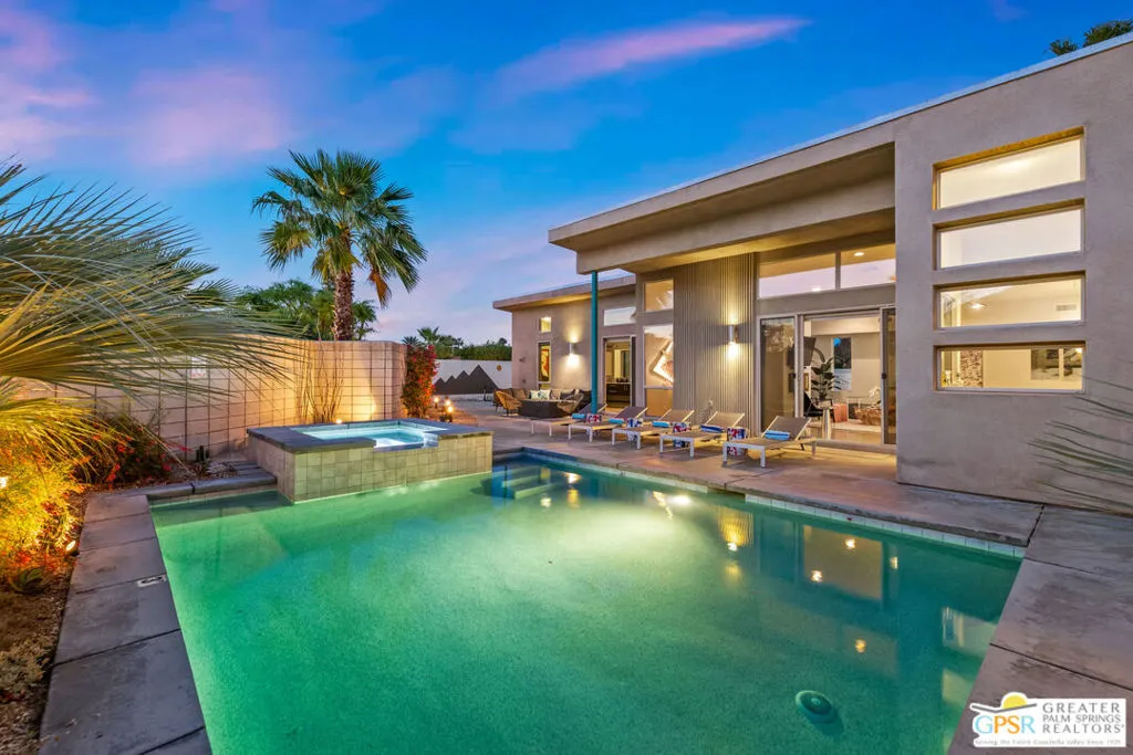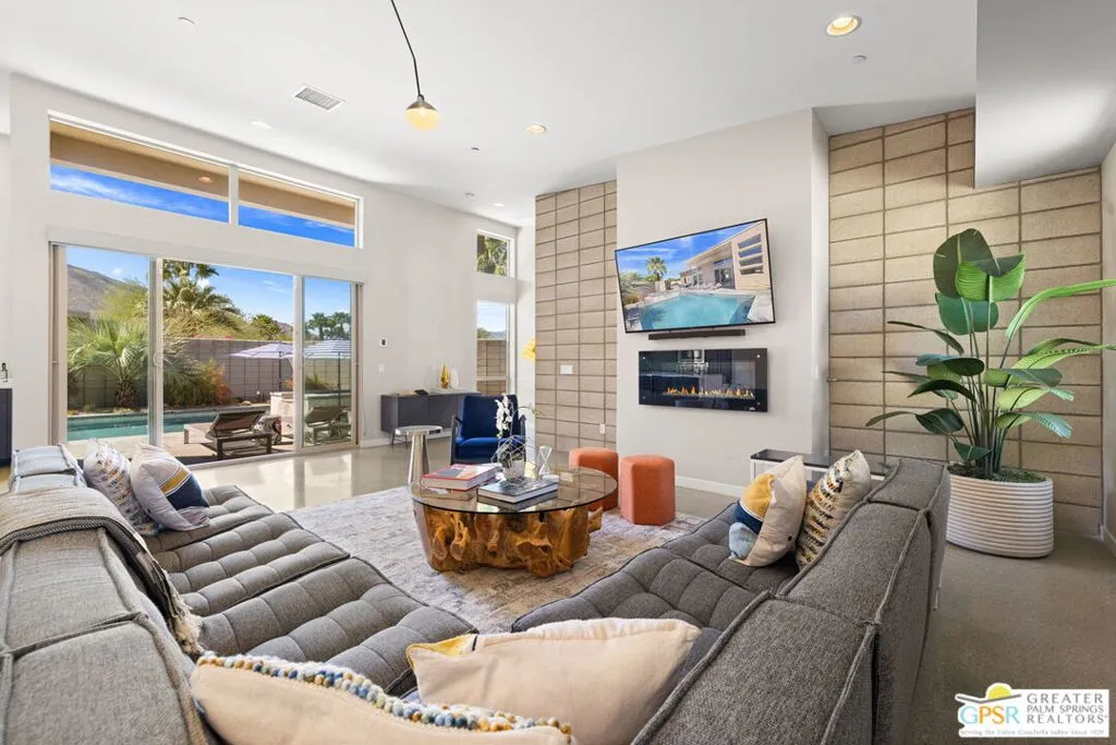 Big views. Bold style. A standout Murano residence positioned at the end of a cul de sac delivers the kind of Palm Springs living people come here for, with excellent short term rental flexibility for investors and part time use. Set on an oversized lot with mountain views, this west facing property pairs clean modern lines with a resort style setting. Vaulted ceilings and polished concrete floors frame a huge open living space anchored by a floating linear fireplace. Expansive glass doors open to the outdoors, creating an easy indoor outdoor connection. The kitchen is a showstopper with an XL quartz waterfall island, bar seating, specialty lighting, and a premium appliance suite including Bosch. The layout offers great separation with two primary suites, including a main retreat that opens to the backyard with a spa style bath featuring soaking tub, walk in shower, dual vanities, and a custom walk in closet, while a third bedroom adds flexibility. Outdoors, the ultra private backyard shines with a heated PebbleTec saltwater pool and spa, piped natural gas fire pit, and outdoor dining under string lights, plus a regulation size bocce court and private pickleball court alongside citrus trees including Pomelo and Meyer lemon. Owned solar with 16 panels, tankless water heater, solar shades, 2 zone HVAC, and a 220 volt EV charging station enhance efficiency. Attached two car garage. NO HOA FEES and Fee Land you own.