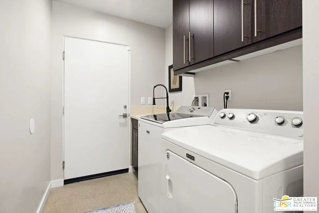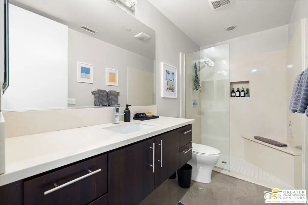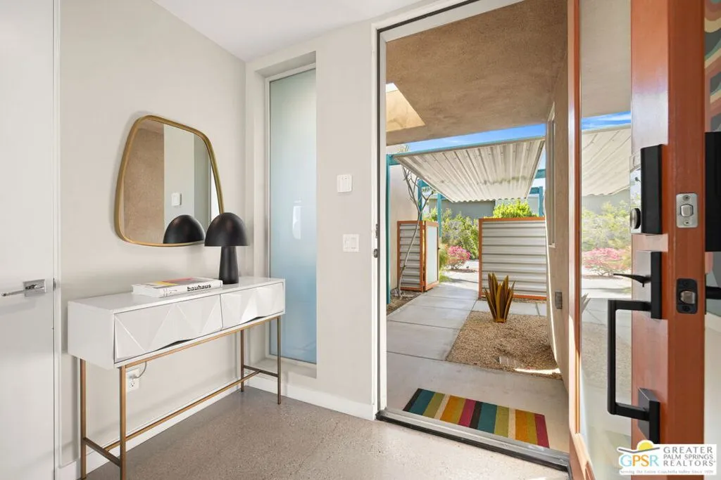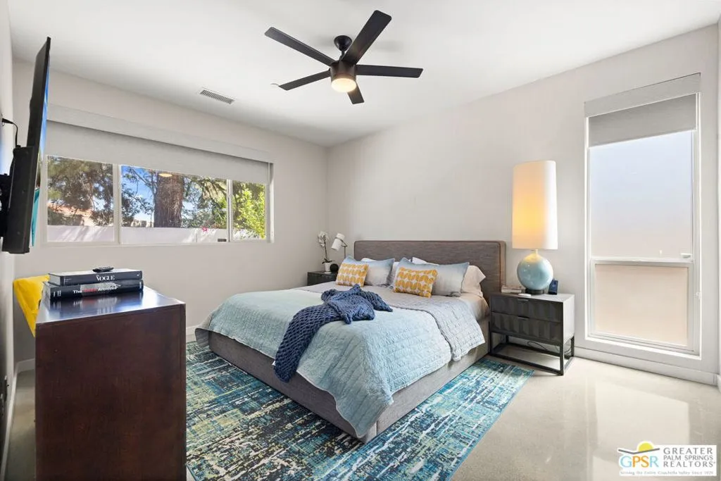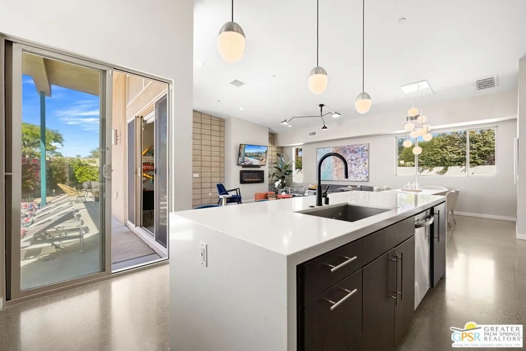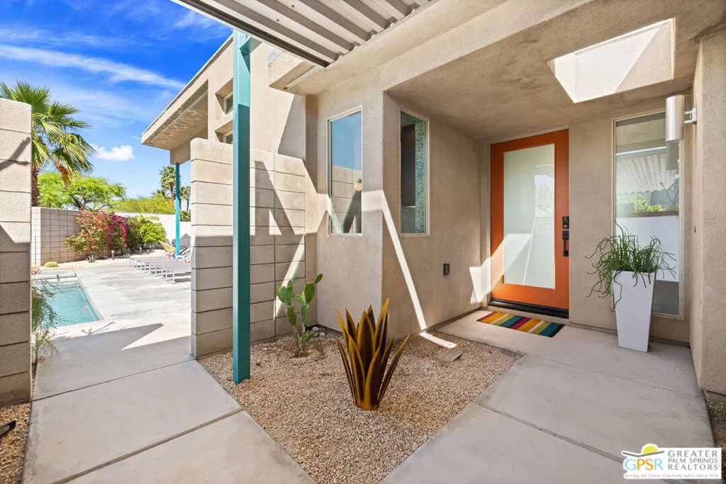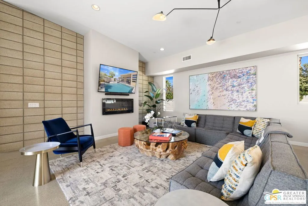 Big views. Bold style. A standout Murano residence positioned at the end of a cul de sac delivers the kind of Palm Springs living people come here for, with excellent short term rental flexibility for investors and part time use. Set on an oversized lot with mountain views, this west facing property pairs clean modern lines with a resort style setting. Vaulted ceilings and polished concrete floors frame a huge open living space anchored by a floating linear fireplace. Expansive glass doors open to the outdoors, creating an easy indoor outdoor connection. The kitchen is a showstopper with an XL quartz waterfall island, bar seating, specialty lighting, and a premium appliance suite including Bosch. The layout offers great separation with two primary suites, including a main retreat that opens to the backyard with a spa style bath featuring soaking tub, walk in shower, dual vanities, and a custom walk in closet, while a third bedroom adds flexibility. Outdoors, the ultra private backyard shines with a heated PebbleTec saltwater pool and spa, piped natural gas fire pit, and outdoor dining under string lights, plus a regulation size bocce court and private pickleball court alongside citrus trees including Pomelo and Meyer lemon. Owned solar with 16 panels, tankless water heater, solar shades, 2 zone HVAC, and a 220 volt EV charging station enhance efficiency. Attached two car garage. NO HOA FEES and Fee Land you own.