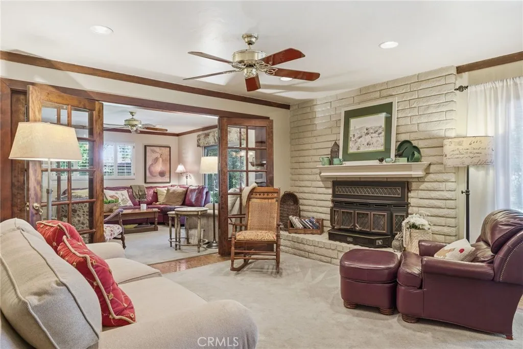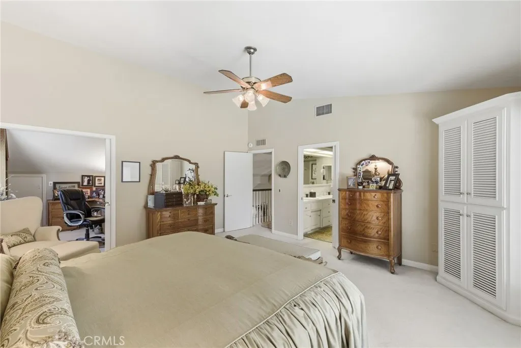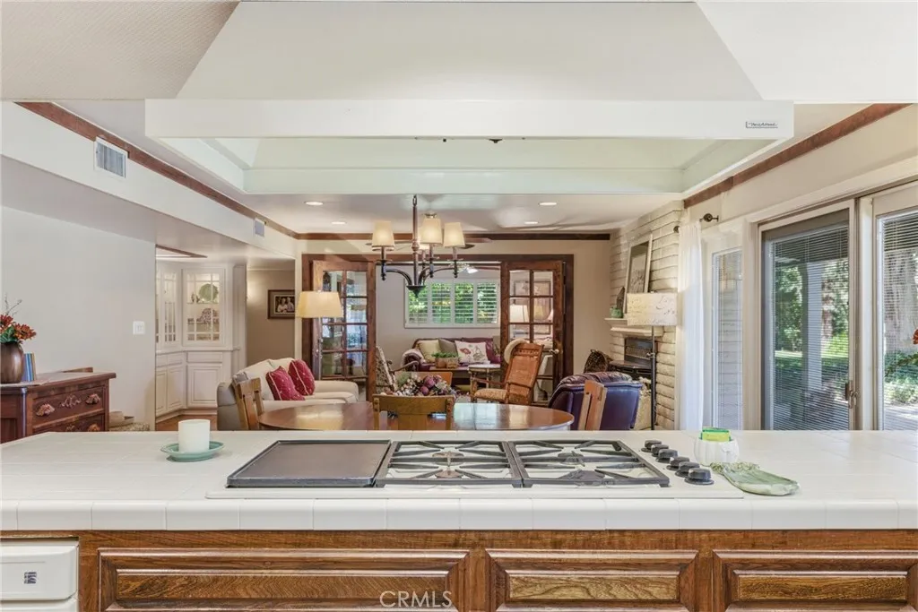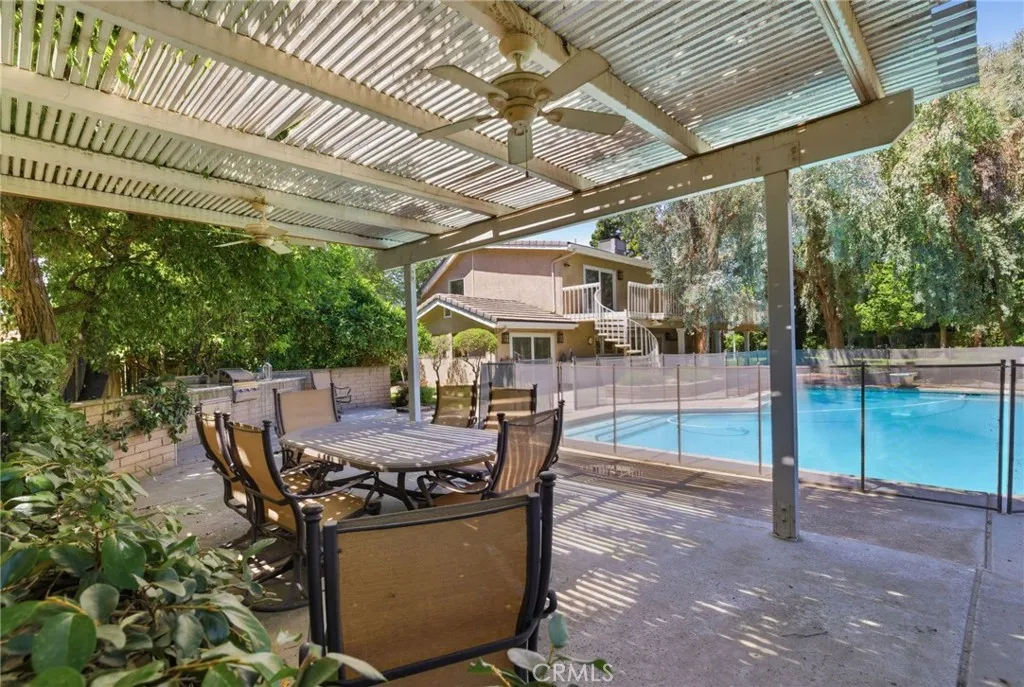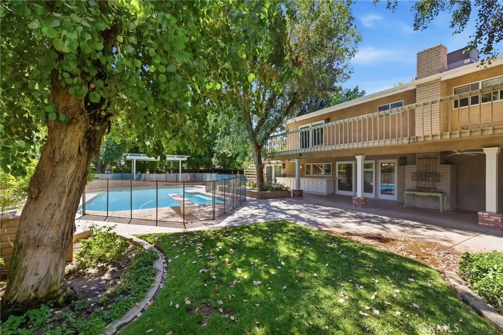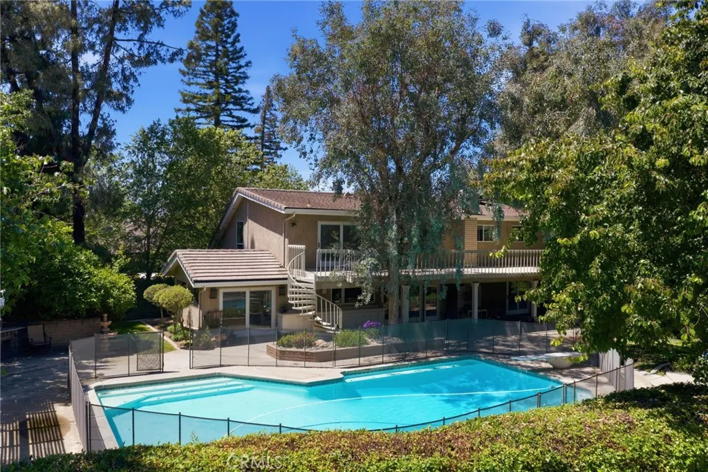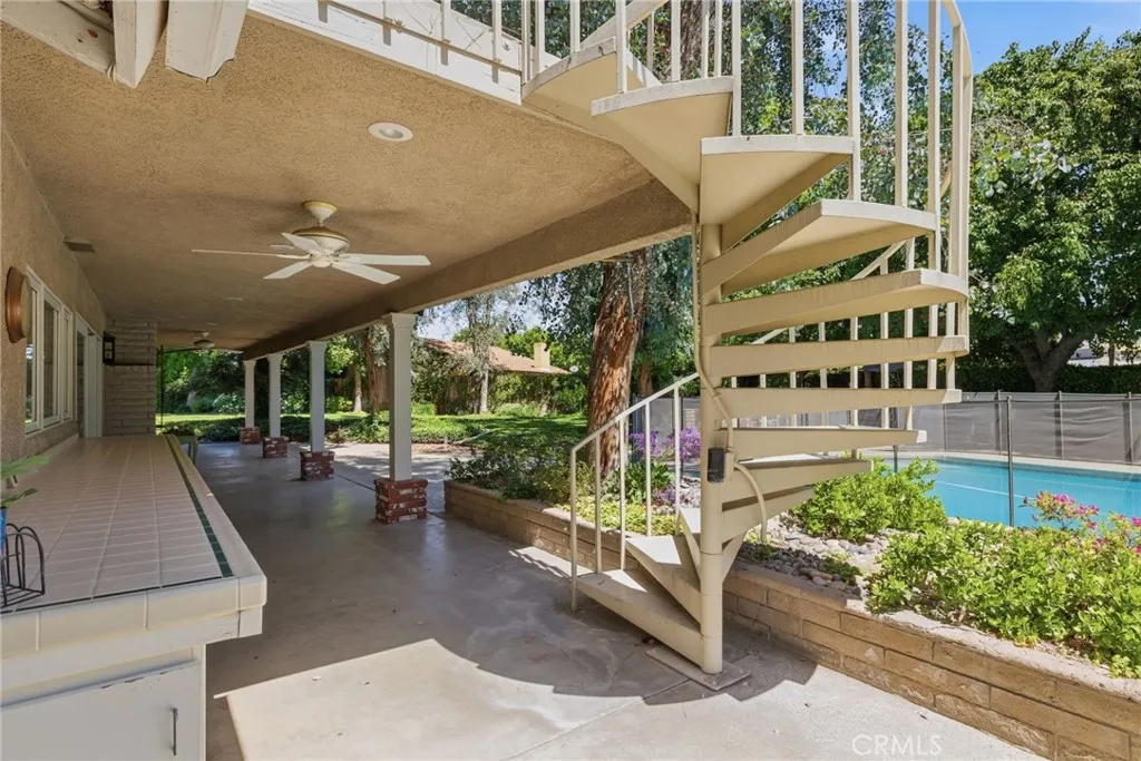 Classic Deeter-plan Calif. Contemporary home on 18th green of the Sundale Country Club & only a 150 yard walk to Clubhouse! Great location, on quiet cul-de-sac street, great views, in good condition, many upgrades, 1/2 acre lot, huge backyard, big trees, large fenced pool & spa, BBQ kitchen, Pergola, gas firepit, 2 large covered patios, plenty of room for everyone & everything, designed for enjoying all the important elements & occasions of life: family, friends, house guests, entertaining, extended family, pets, the outdoors, swimming, golfing, BBQing, gardening & an active lifestyle. 5 big bdrms, 3 baths, could easily be 6 bdrms, 3,415 sq.ft.. 1 bdrm & 1 bath on 1st floor-ideal for guests or extended family. Formal living rm with beautiful granite fireplace, dramatic vaulted ceilings, formal dining area, expansive kitchen with 2 Dacor ovens, 4-burner gas cooktop with electric griddle, full-sized vent hood, home desk & breakfast bar, game rm/office, family rm/breakfast area with fireplace/heating stove, den/media rm with custom wall unit (originally a 6th bedroom), laundry/craft rm, office off of Primary brdm. with built-in desks & cabinets. Big balcony, over-sized 2-car garage with lots of cabinets, workbenches & storage. Pomegranate, apricot, orange & lemon trees. Entire house replumbed with copper piping. Easily add RV parking next to garage. Classy & comfortable. Excellent price!