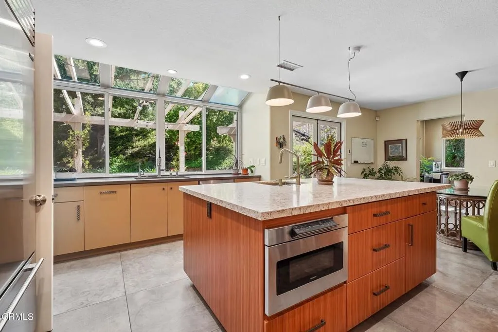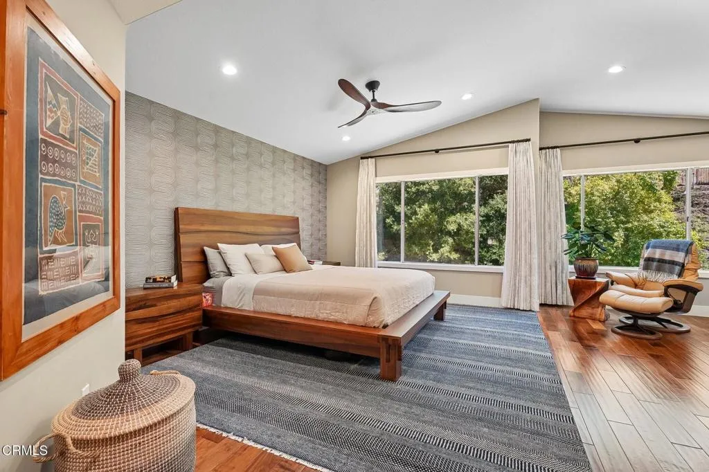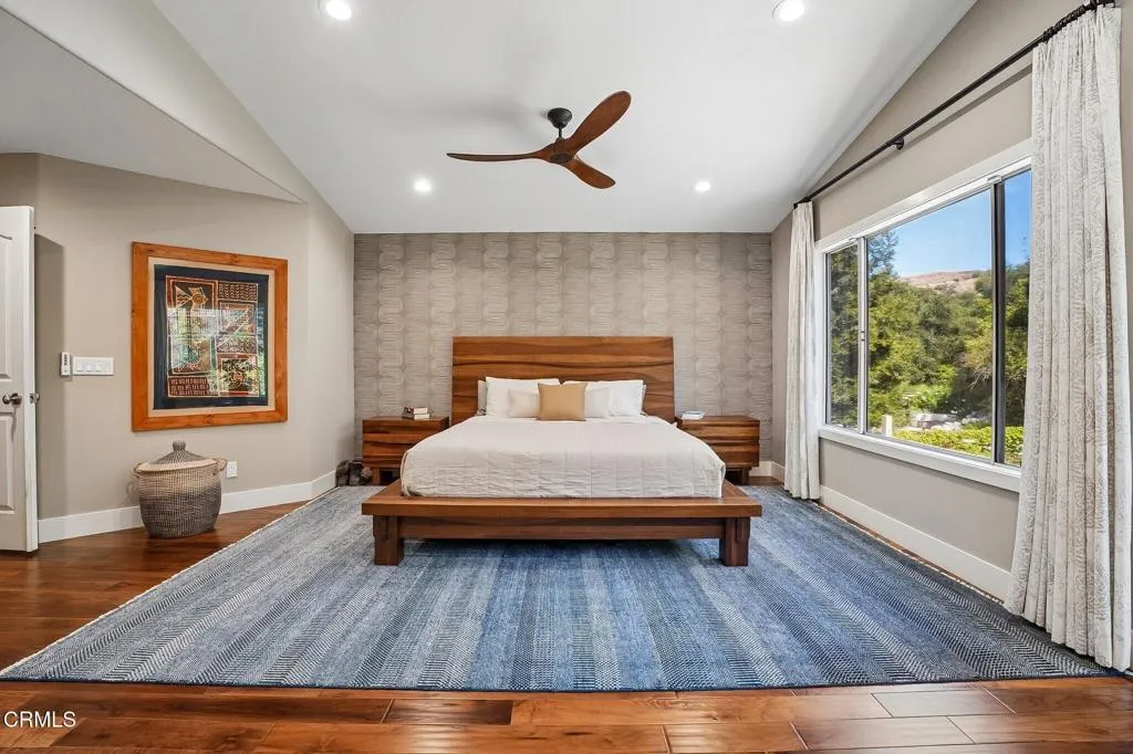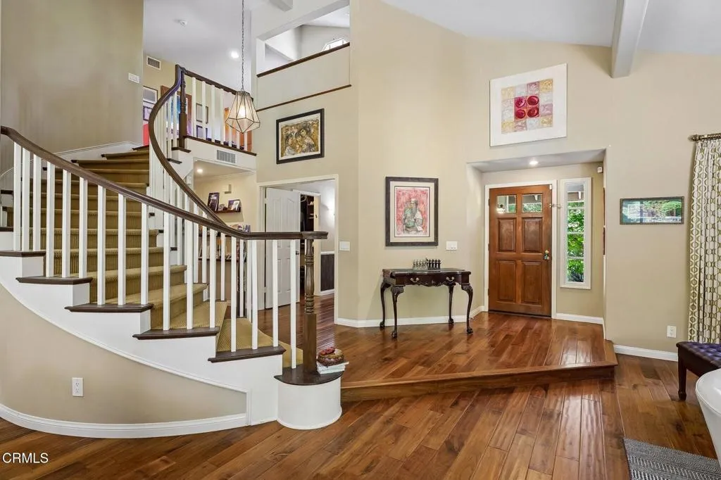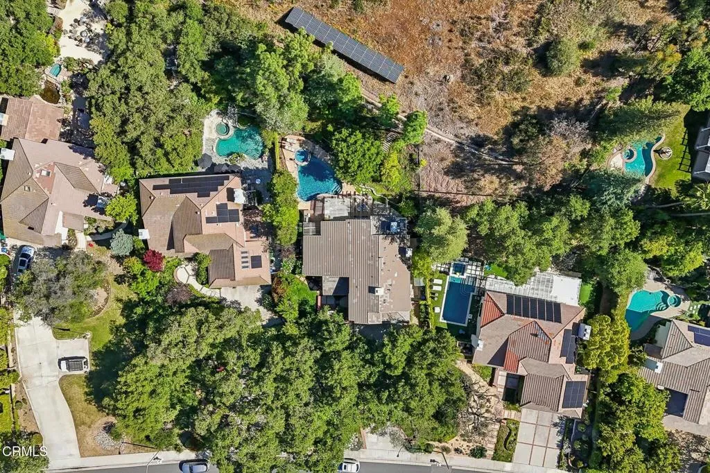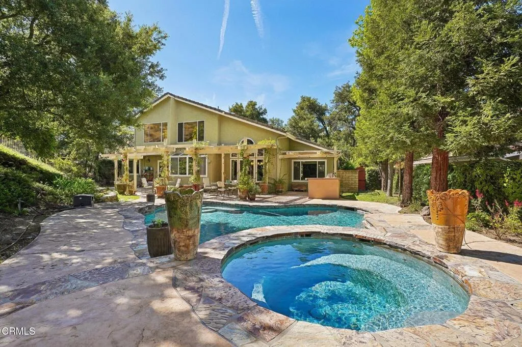 Tucked beneath a canopy of mature oaks and set well back from the road, this beautifully reimagined 5-bedroom, 4-bath home offers a quiet sense of seclusion within easy reach of Three Springs Park. With 3,364 sq ft of recorded living space -- plus significant additional usable square footage from thoughtful conversions -- the home features a custom temperature-controlled walk-in wine room beneath the staircase, an expanded butler's pantry, and a separate flex suite with full bath and built-in Murphy bed that works as a workspace, guest room, exercise room, or creative studio. Pre-paid solar is included -- virtually no electric bill from day one.A dramatic two-story entry with sweeping curved staircase, soaring ceilings, and rich engineered hardwood floors sets the tone. The vaulted formal living room and adjacent dining room frame views of the surrounding oaks, while a downstairs family room -- anchored by a fireplace and custom built-in library -- flows into one of the most distinctive kitchens in the neighborhood.The remodeled chef's kitchen makes a true statement: custom cabinetry, quartz counters, dual sinks, fully built-out butler's pantry, Thermador range with pot filler, double ovens, built-in Sub-Zero refrigerator, and a sun-drenched skylit prep area overlooking the hillside.The downstairs bonus suite with full bath lives effortlessly as a guest retreat, in-law quarters, or downstairs primary -- ideal for multigenerational living. Upstairs, the expansive primary suite features vaulted ceilings, a private balcony with mountain and treetop views, and a renovated spa-style bath with freestanding soaking tub, oversized walk-in shower with dual heads, and designer tile work.Outside, the resort-inspired backyard is built for year-round Southern California living: a heated saltwater pool and spa with stone waterfall, pergola-shaded dining area, full outdoor kitchen with built-in BBQ, and lush mature landscaping. A dedicated workshop adds bonus space for hobbyists and makers. Three Springs Park is an easy walk down the street -- accessible without ever crossing the road, a rare and welcome detail for families.Located within the award-winning Las Virgenes Unified School District and minutes from Westlake Lake, top dining, boutique shopping, and scenic trails, this is a rare opportunity to own a thoughtfully designed, character-rich home in one of Westlake Village's most coveted enclaves.