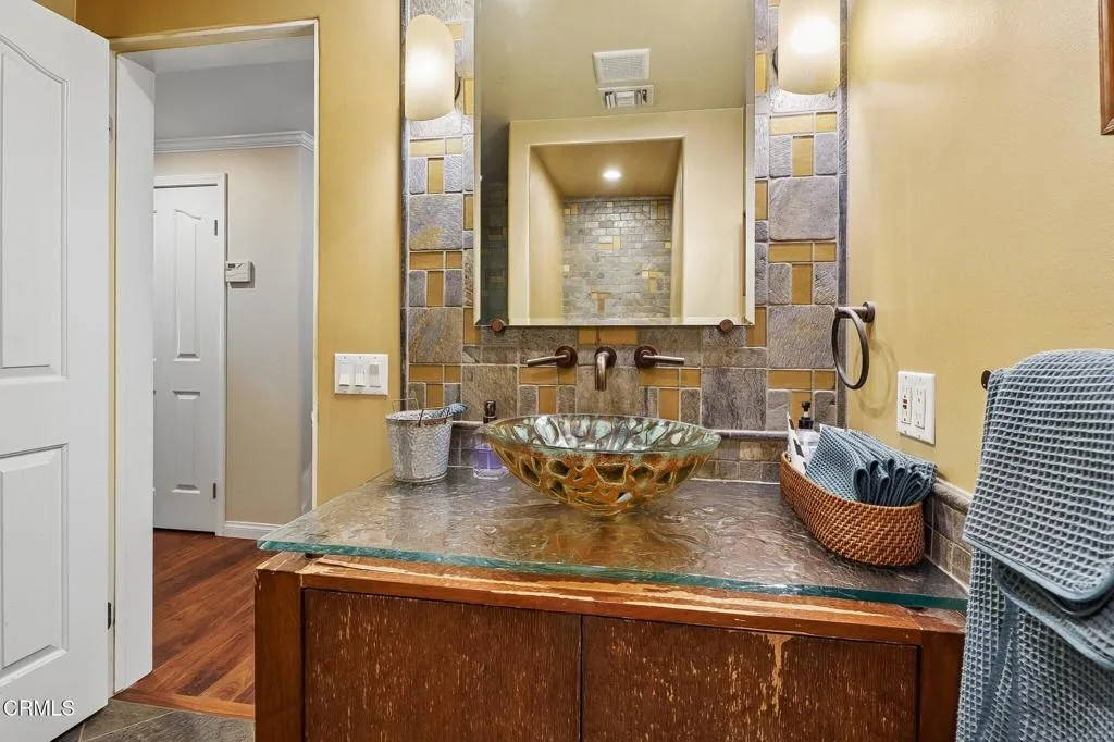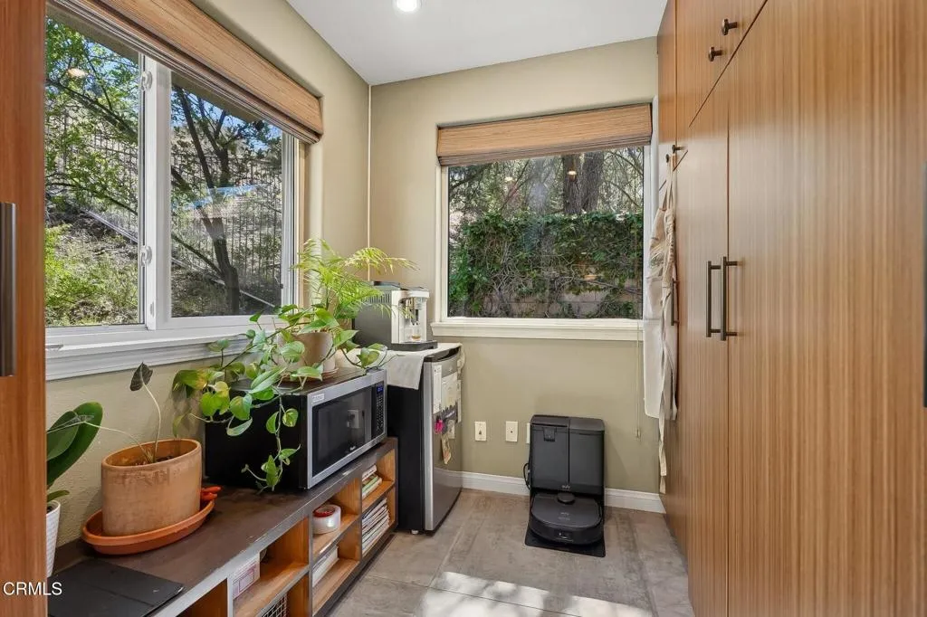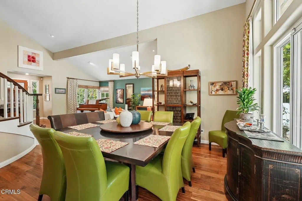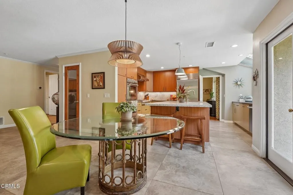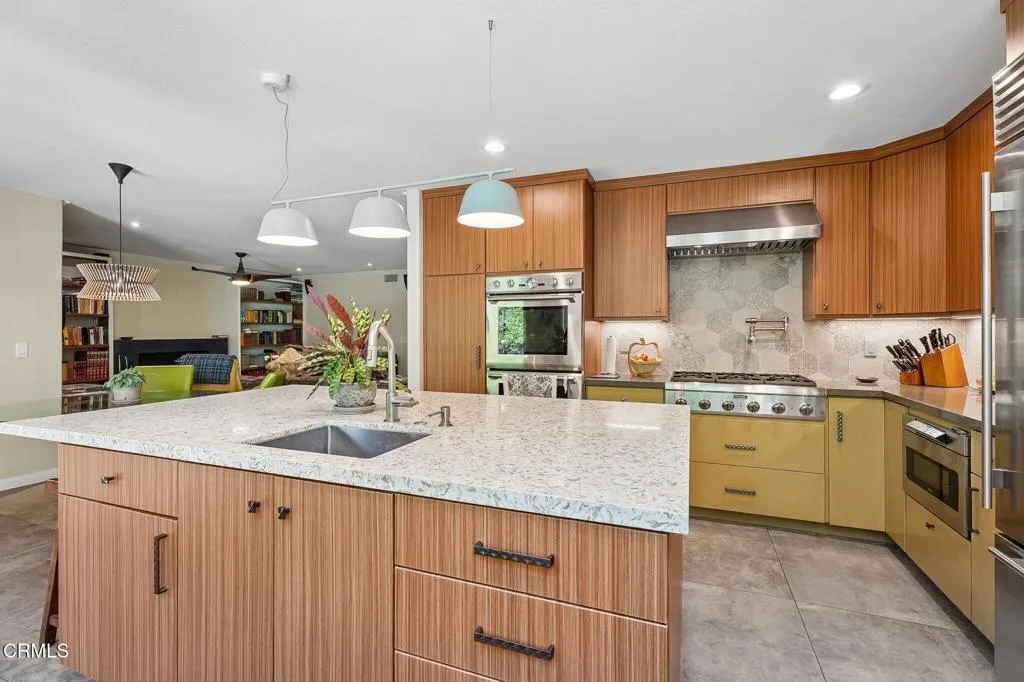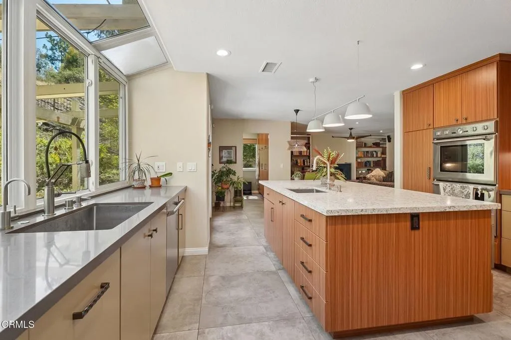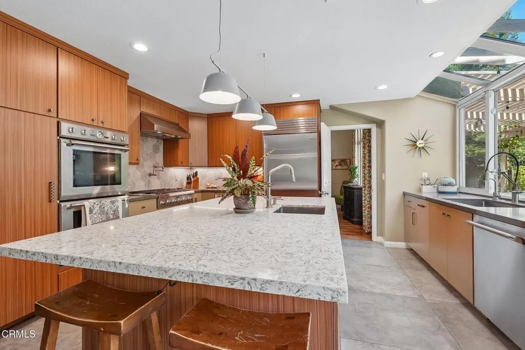 Tucked beneath a canopy of mature oaks and set well back from the road, this beautifully reimagined 5-bedroom, 4-bath home offers a quiet sense of seclusion within easy reach of Three Springs Park. With 3,364 sq ft of recorded living space -- plus significant additional usable square footage from thoughtful conversions -- the home features a custom temperature-controlled walk-in wine room beneath the staircase, an expanded butler's pantry, and a separate flex suite with full bath and built-in Murphy bed that works as a workspace, guest room, exercise room, or creative studio. Pre-paid solar is included -- virtually no electric bill from day one.A dramatic two-story entry with sweeping curved staircase, soaring ceilings, and rich engineered hardwood floors sets the tone. The vaulted formal living room and adjacent dining room frame views of the surrounding oaks, while a downstairs family room -- anchored by a fireplace and custom built-in library -- flows into one of the most distinctive kitchens in the neighborhood.The remodeled chef's kitchen makes a true statement: custom cabinetry, quartz counters, dual sinks, fully built-out butler's pantry, Thermador range with pot filler, double ovens, built-in Sub-Zero refrigerator, and a sun-drenched skylit prep area overlooking the hillside.The downstairs bonus suite with full bath lives effortlessly as a guest retreat, in-law quarters, or downstairs primary -- ideal for multigenerational living. Upstairs, the expansive primary suite features vaulted ceilings, a private balcony with mountain and treetop views, and a renovated spa-style bath with freestanding soaking tub, oversized walk-in shower with dual heads, and designer tile work.Outside, the resort-inspired backyard is built for year-round Southern California living: a heated saltwater pool and spa with stone waterfall, pergola-shaded dining area, full outdoor kitchen with built-in BBQ, and lush mature landscaping. A dedicated workshop adds bonus space for hobbyists and makers. Three Springs Park is an easy walk down the street -- accessible without ever crossing the road, a rare and welcome detail for families.Located within the award-winning Las Virgenes Unified School District and minutes from Westlake Lake, top dining, boutique shopping, and scenic trails, this is a rare opportunity to own a thoughtfully designed, character-rich home in one of Westlake Village's most coveted enclaves.