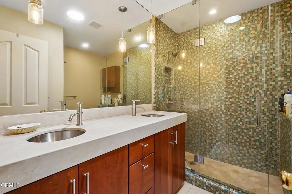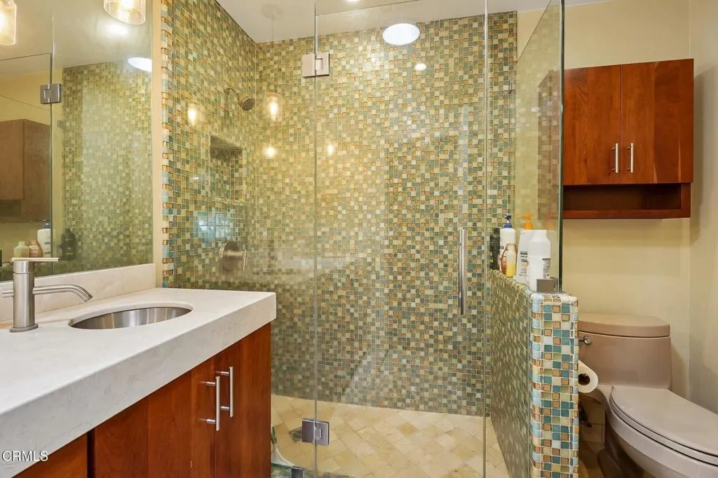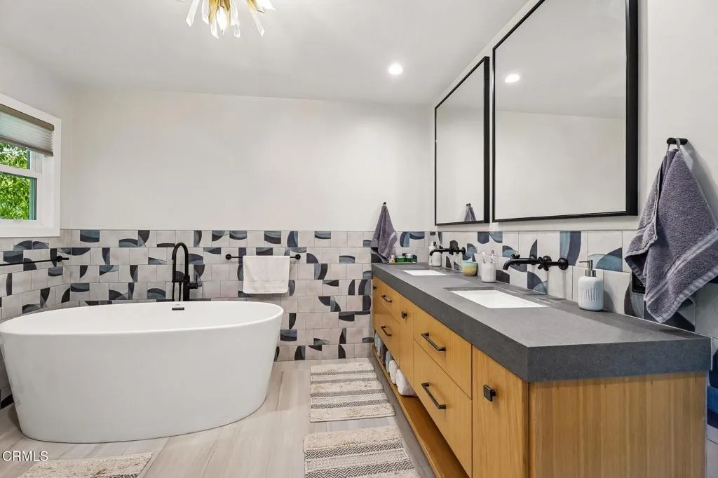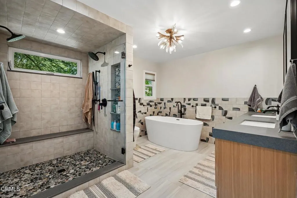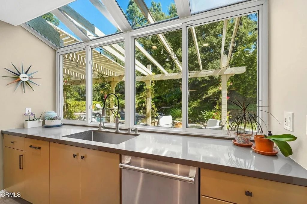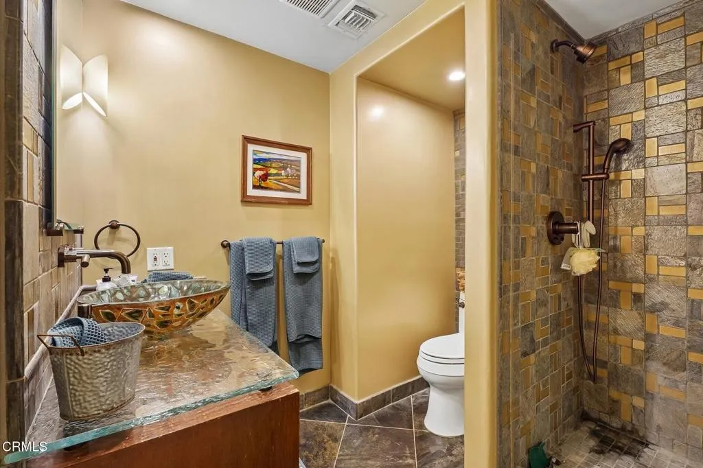 Tucked beneath a canopy of mature oaks and set well back from the road, this beautifully reimagined 5-bedroom, 4-bath home offers a quiet sense of seclusion within easy reach of Three Springs Park. With 3,364 sq ft of recorded living space -- plus significant additional usable square footage from thoughtful conversions -- the home features a custom temperature-controlled walk-in wine room beneath the staircase, an expanded butler's pantry, and a separate flex suite with full bath and built-in Murphy bed that works as a workspace, guest room, exercise room, or creative studio. Pre-paid solar is included -- virtually no electric bill from day one.A dramatic two-story entry with sweeping curved staircase, soaring ceilings, and rich engineered hardwood floors sets the tone. The vaulted formal living room and adjacent dining room frame views of the surrounding oaks, while a downstairs family room -- anchored by a fireplace and custom built-in library -- flows into one of the most distinctive kitchens in the neighborhood.The remodeled chef's kitchen makes a true statement: custom cabinetry, quartz counters, dual sinks, fully built-out butler's pantry, Thermador range with pot filler, double ovens, built-in Sub-Zero refrigerator, and a sun-drenched skylit prep area overlooking the hillside.The downstairs bonus suite with full bath lives effortlessly as a guest retreat, in-law quarters, or downstairs primary -- ideal for multigenerational living. Upstairs, the expansive primary suite features vaulted ceilings, a private balcony with mountain and treetop views, and a renovated spa-style bath with freestanding soaking tub, oversized walk-in shower with dual heads, and designer tile work.Outside, the resort-inspired backyard is built for year-round Southern California living: a heated saltwater pool and spa with stone waterfall, pergola-shaded dining area, full outdoor kitchen with built-in BBQ, and lush mature landscaping. A dedicated workshop adds bonus space for hobbyists and makers. Three Springs Park is an easy walk down the street -- accessible without ever crossing the road, a rare and welcome detail for families.Located within the award-winning Las Virgenes Unified School District and minutes from Westlake Lake, top dining, boutique shopping, and scenic trails, this is a rare opportunity to own a thoughtfully designed, character-rich home in one of Westlake Village's most coveted enclaves.