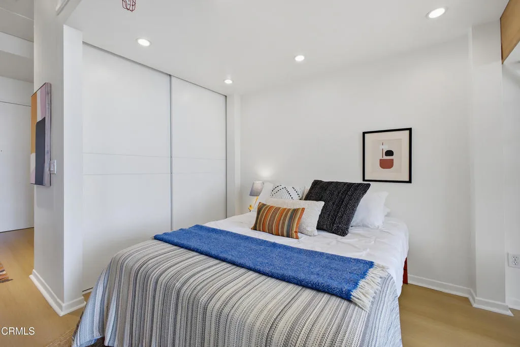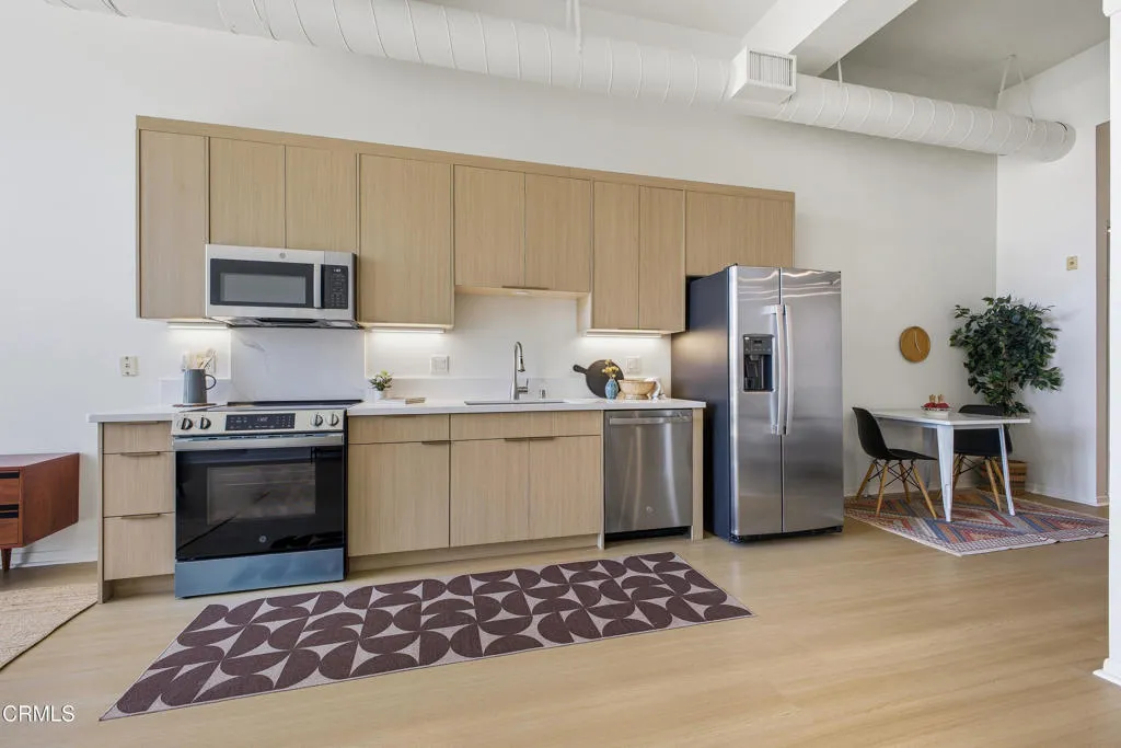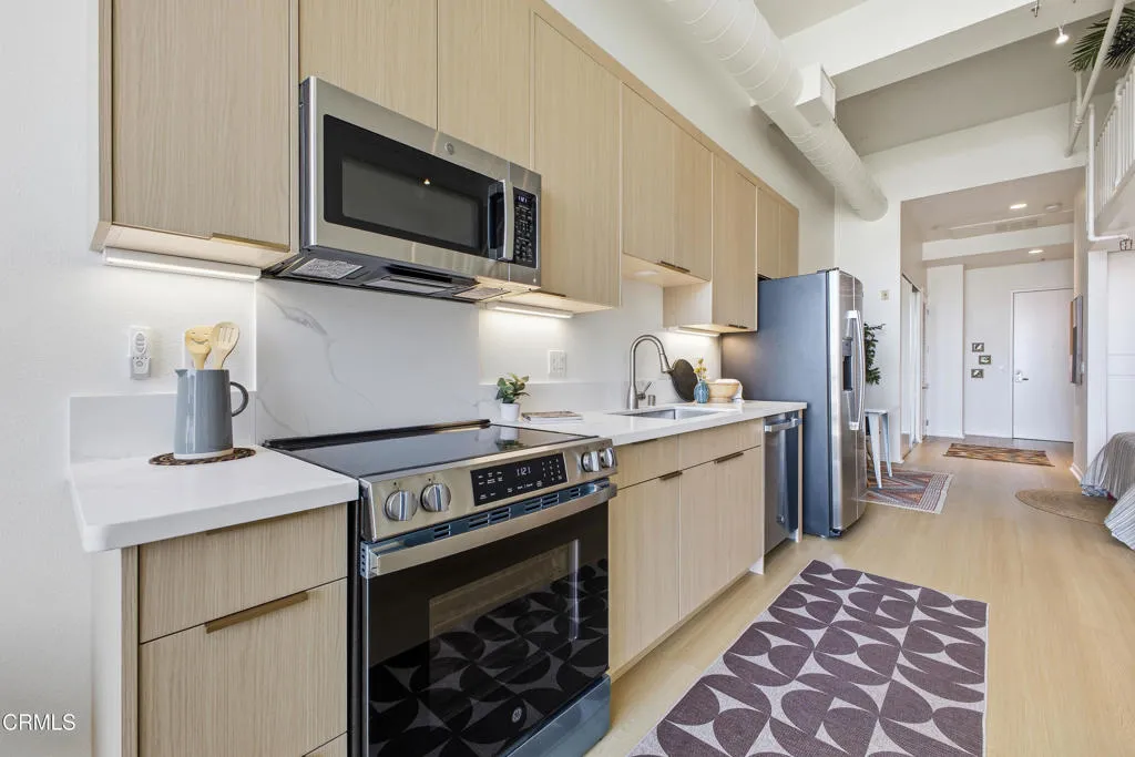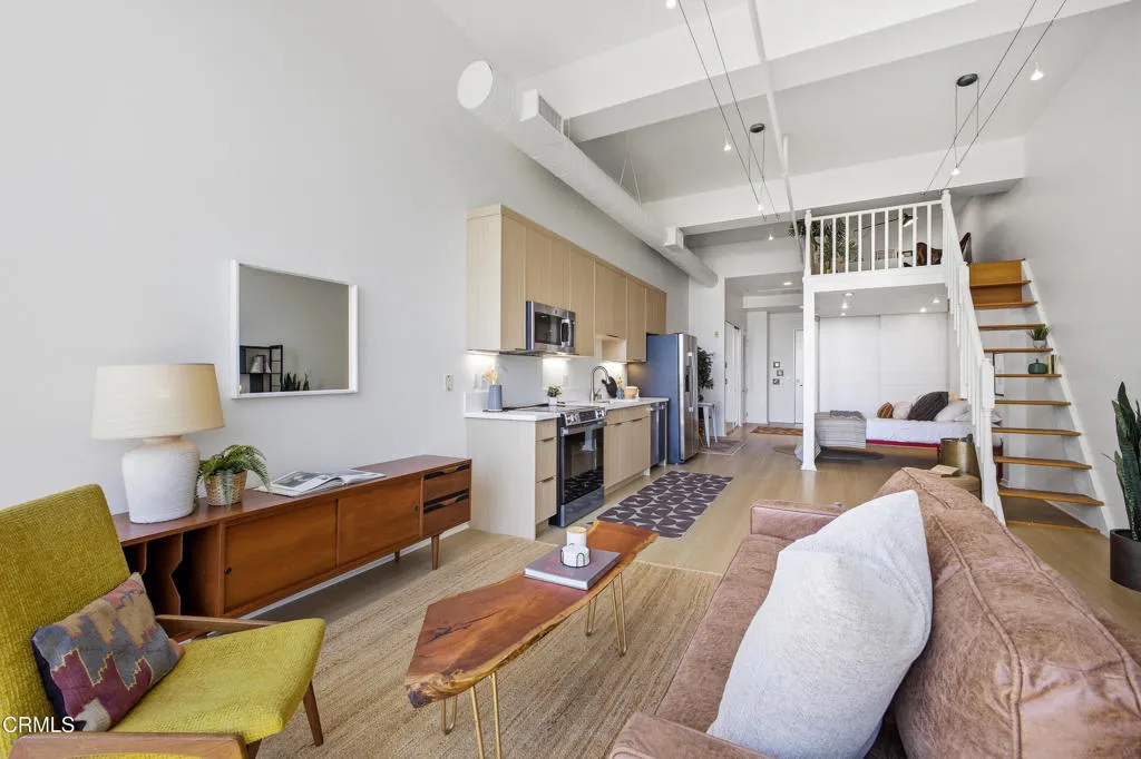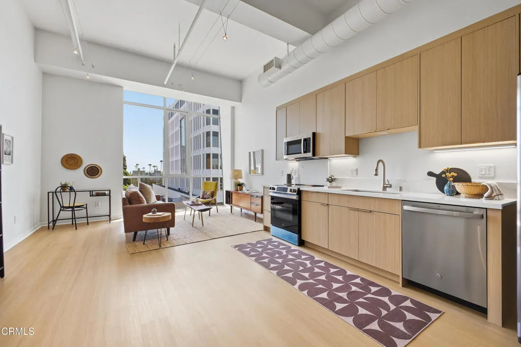 Enjoy urban living in one of the most desirable areas of the South Lake District, just moments from popular restaurants, transit, William Sonoma, banks, and a vibrant shopping scene.This bright, modern residence features soaring vaulted ceilings and an open-concept layout filled with natural light from a dramatic floor-to-ceiling window with automatic shades--creating a stunning focal point and showcasing city views.The sleek kitchen is equipped with light wood cabinetry, quartz-style countertops, stainless steel appliances, and ample storage, perfect for everyday living and entertaining. Additional highlights include in-unit laundry, a well-appointed full bathroom, and generous closet space throughout.A versatile mini loft provides the ideal space for a home office, reading nook, or extra storage. This single-level unit offers easy accessibility with no steps. This unit has been recently renovated with newer appliances, kitchen cabinetry and more.Complete with one gated, secured underground parking space and keycard building access, this home combines style, comfort, and convenience in an unbeatable location.