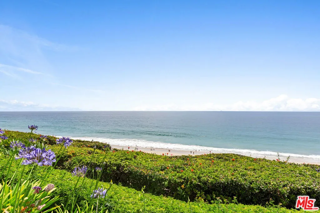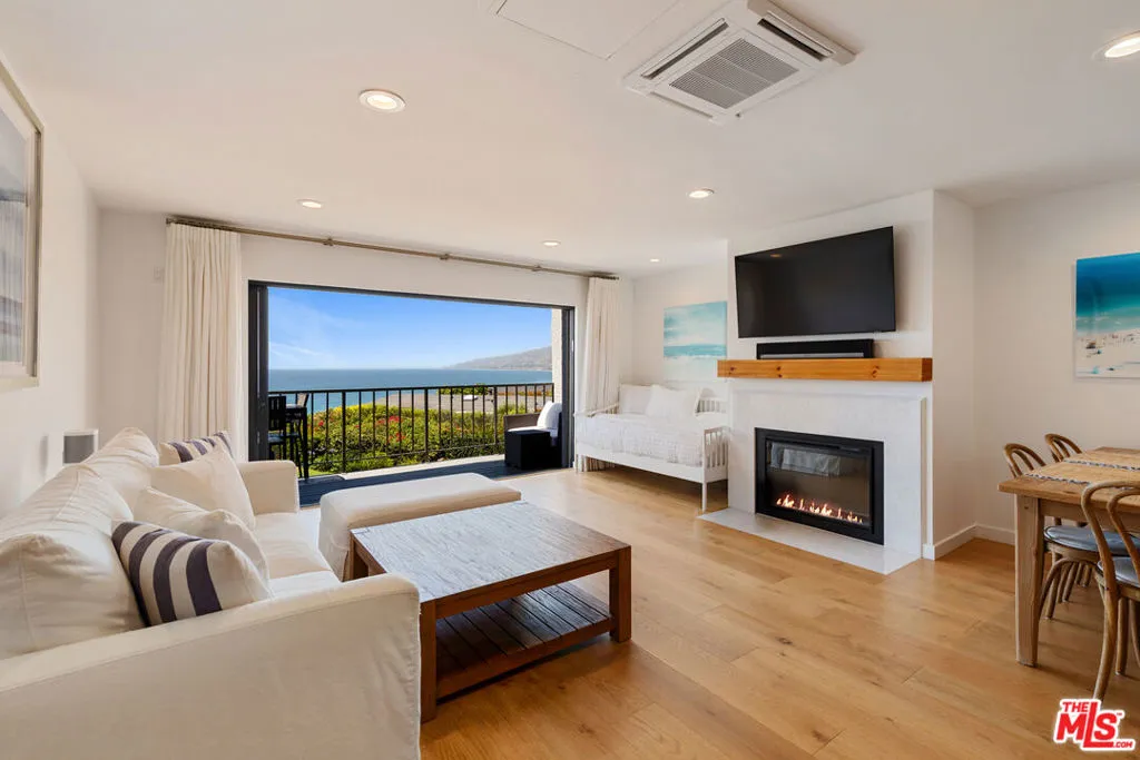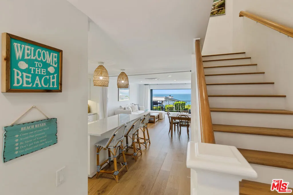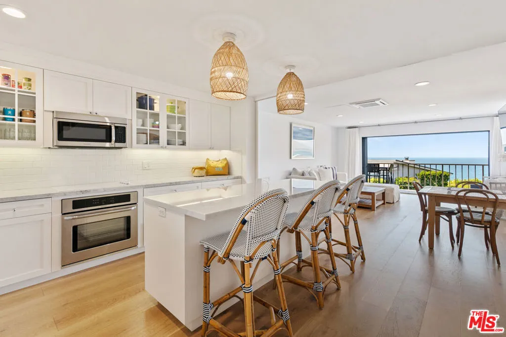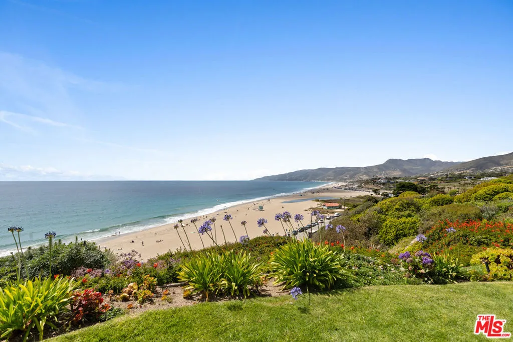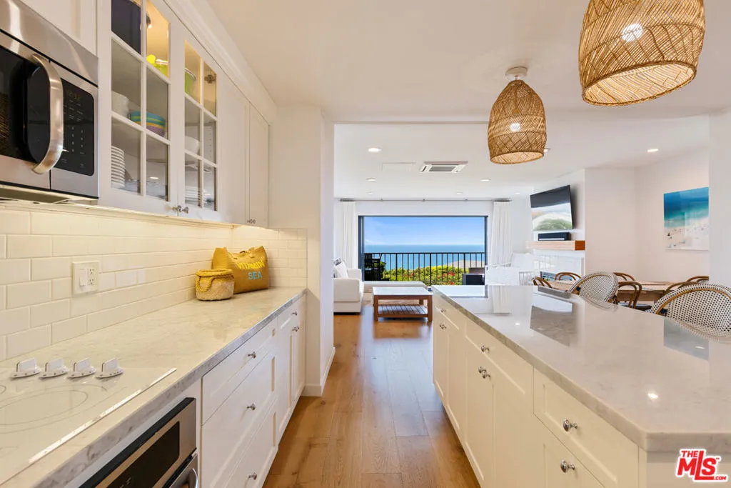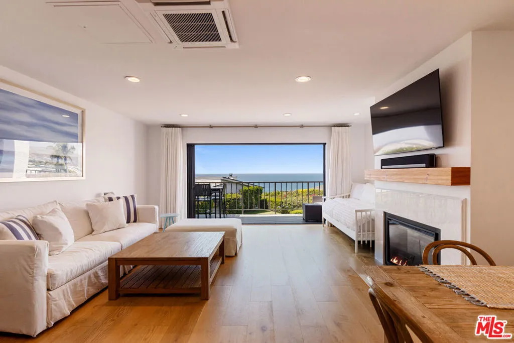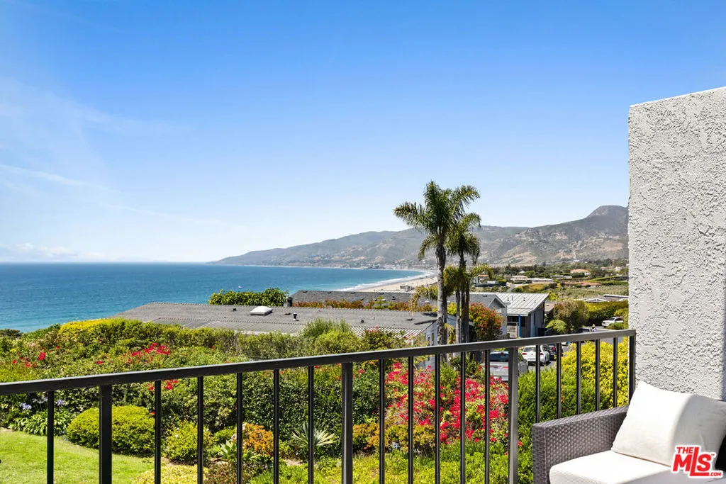 Set on a prime blufftop in Zuma Bay Villas, this residence offers sweeping white water ocean, island, and sunset views. The interior features clean lines, wood floors, marble countertops, and a bright living space that opens to an ocean-facing terrace through a large pocket sliding glass door. The kitchen includes an island, modern finishes, and stainless steel appliances. Upstairs are two en-suite bedrooms, including a primary suite with fireplace and a resort spa-like bath with ocean views. Additional features include a powder room, two-car garage, and a private front patio. The garage has been upgraded with epoxy flooring. Zuma Bay Villas offers gated security, a salt water heated year round pool, hot tub, tennis court, and direct beach access, all near Point Dume, local shops, and top rated schools. Recently updated and turn key move-in ready, with permitted renovations, a newer roof, battery backup system, modern fireplaces, and keyless entry.