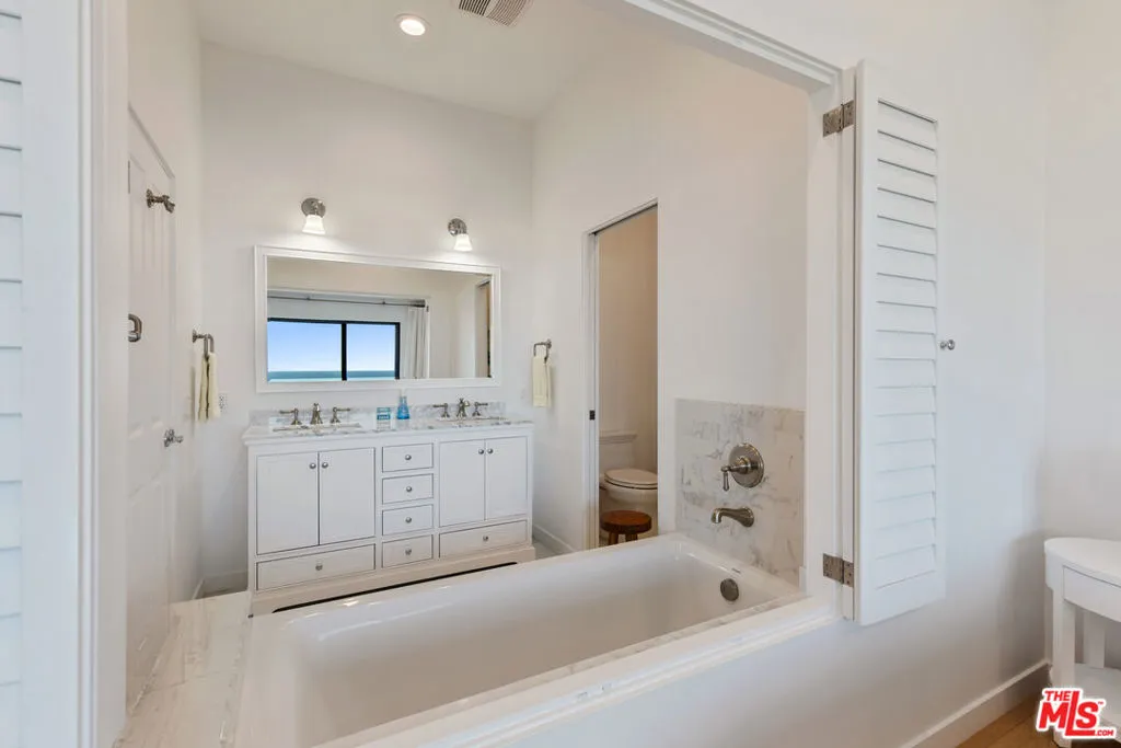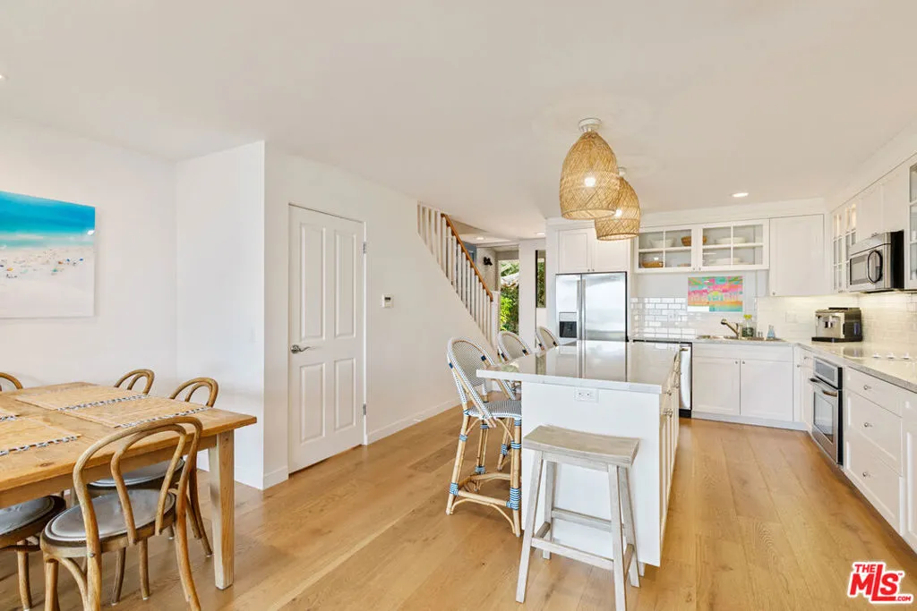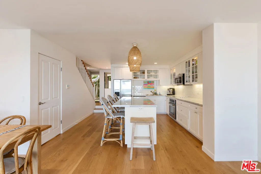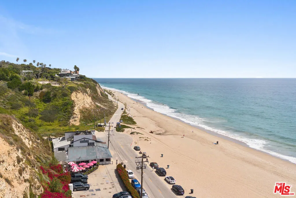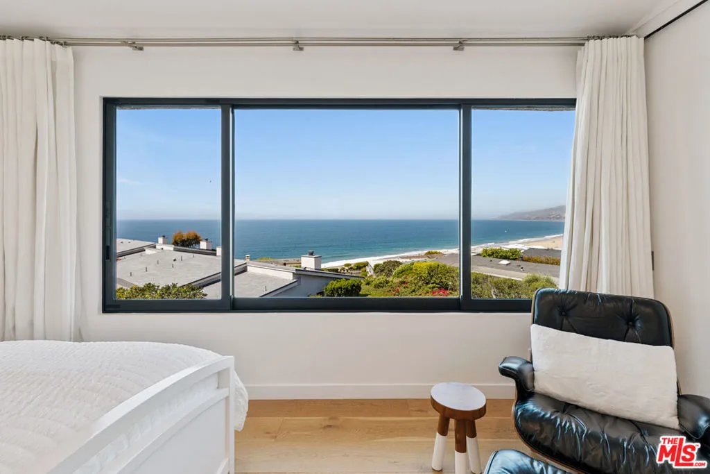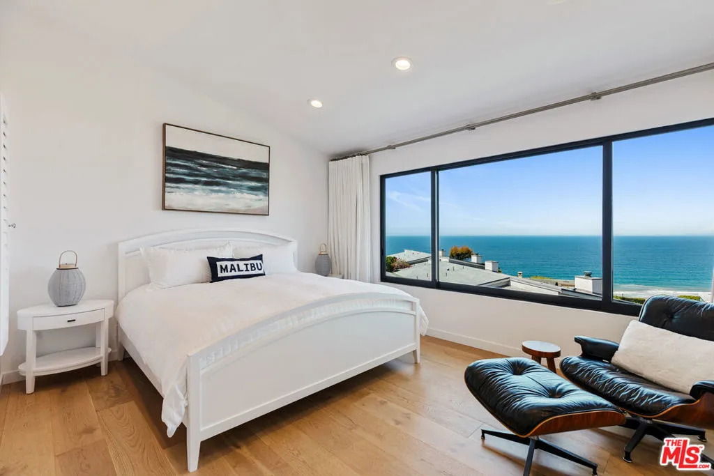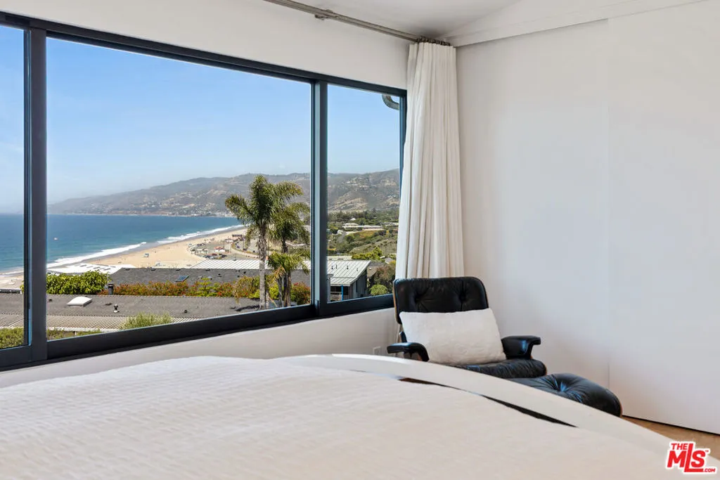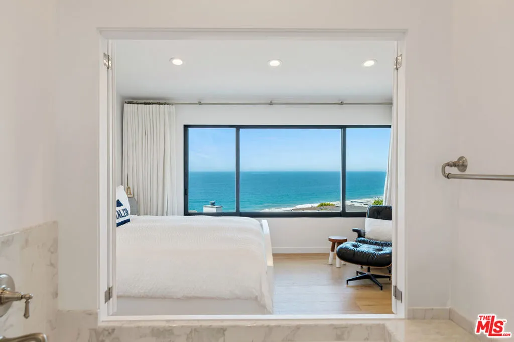 Set on a prime blufftop in Zuma Bay Villas, this residence offers sweeping white water ocean, island, and sunset views. The interior features clean lines, wood floors, marble countertops, and a bright living space that opens to an ocean-facing terrace through a large pocket sliding glass door. The kitchen includes an island, modern finishes, and stainless steel appliances. Upstairs are two en-suite bedrooms, including a primary suite with fireplace and a resort spa-like bath with ocean views. Additional features include a powder room, two-car garage, and a private front patio. The garage has been upgraded with epoxy flooring. Zuma Bay Villas offers gated security, a salt water heated year round pool, hot tub, tennis court, and direct beach access, all near Point Dume, local shops, and top rated schools. Recently updated and turn key move-in ready, with permitted renovations, a newer roof, battery backup system, modern fireplaces, and keyless entry.