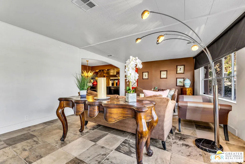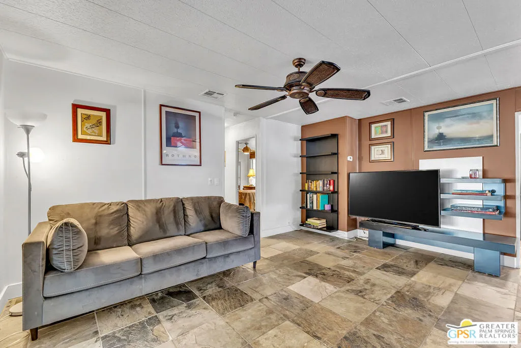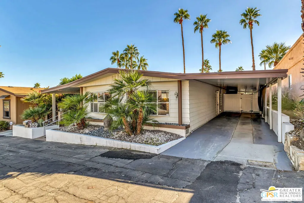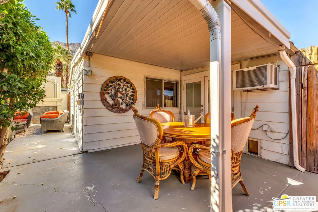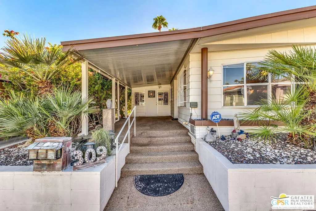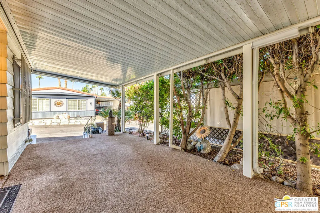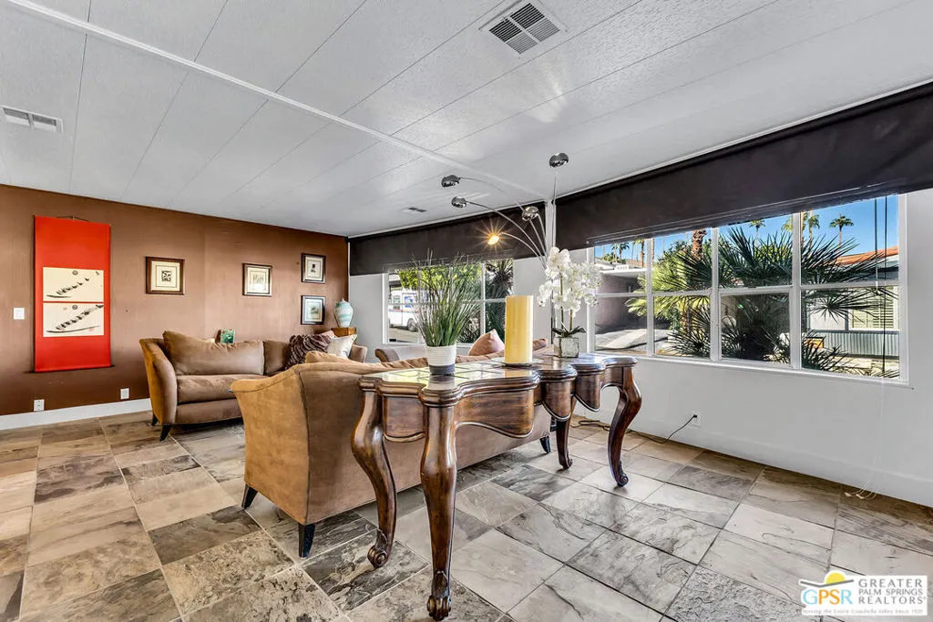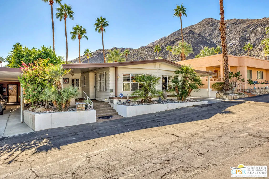 Parkview is a classic Mid-Century Modern community located in desirable South Palm Springs. This spacious 2 bedroom, 2 bath home also includes a versatile flex room ideal as a home office, den, or creative space with its own private entrance. The large kitchen offers generous counter space and abundant storage, perfect for everyday cooking or entertaining. Enjoy a secluded back patio with peek-a-boo mountain views, creating a quiet retreat for relaxing outdoors.Parkview is a 55+ community and management approval is required for residency. No short-term or long-term rentals are permitted. The current land lease is in place through 2027 and will convert to annual renewals thereafter. The park will be managed and maintained by the owners and on-site park manager.