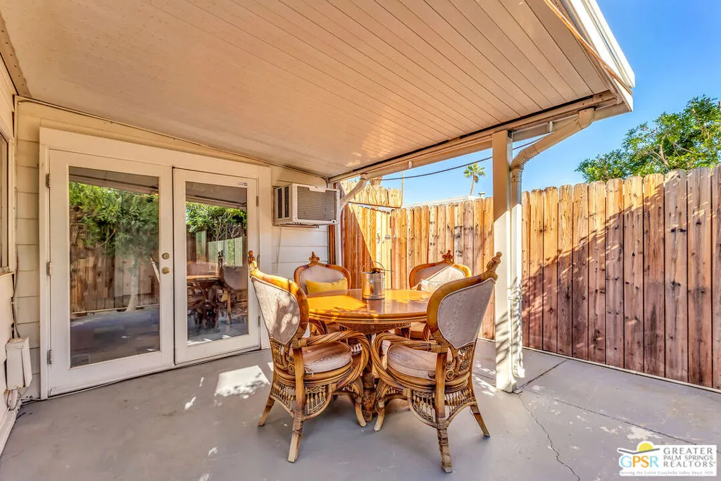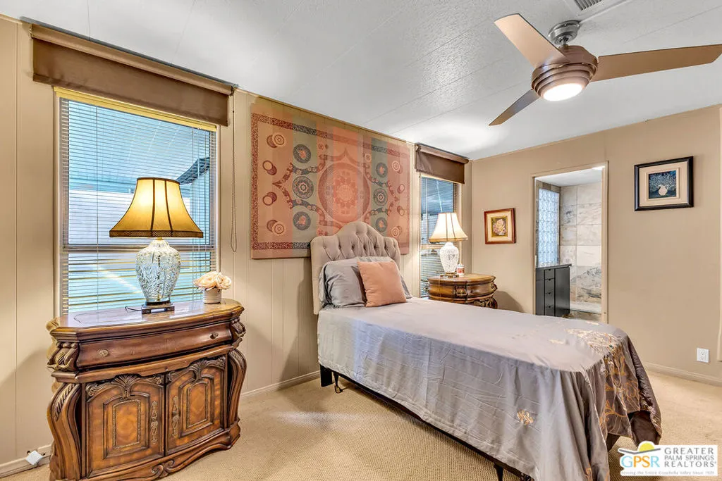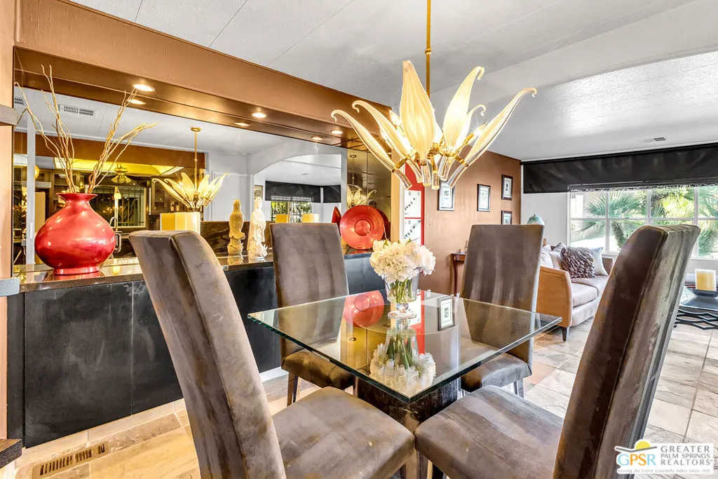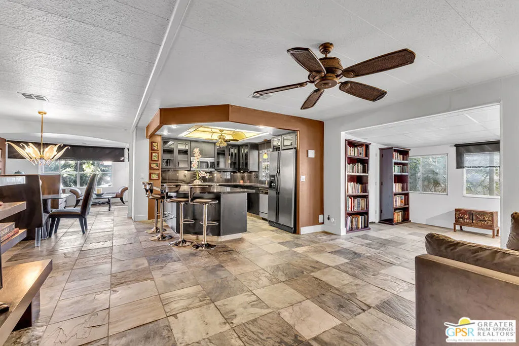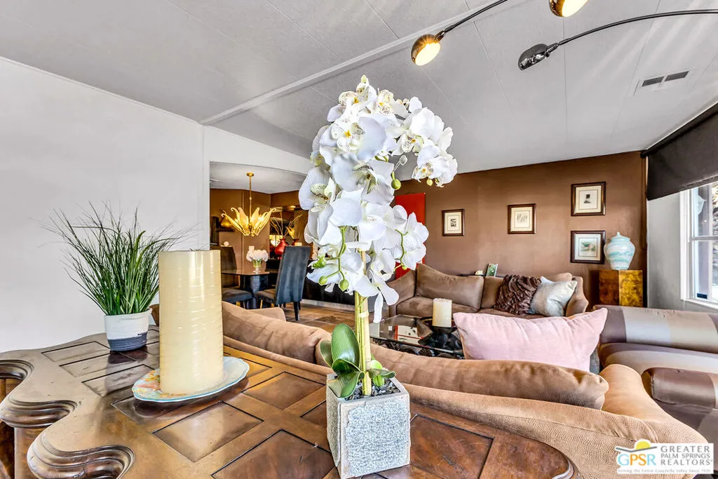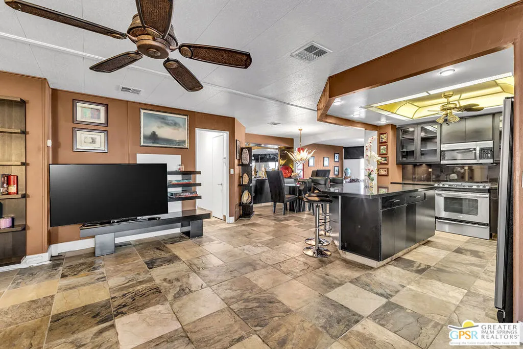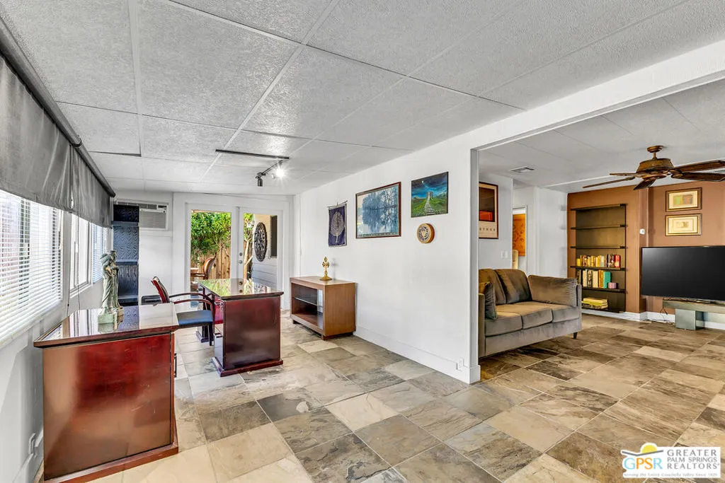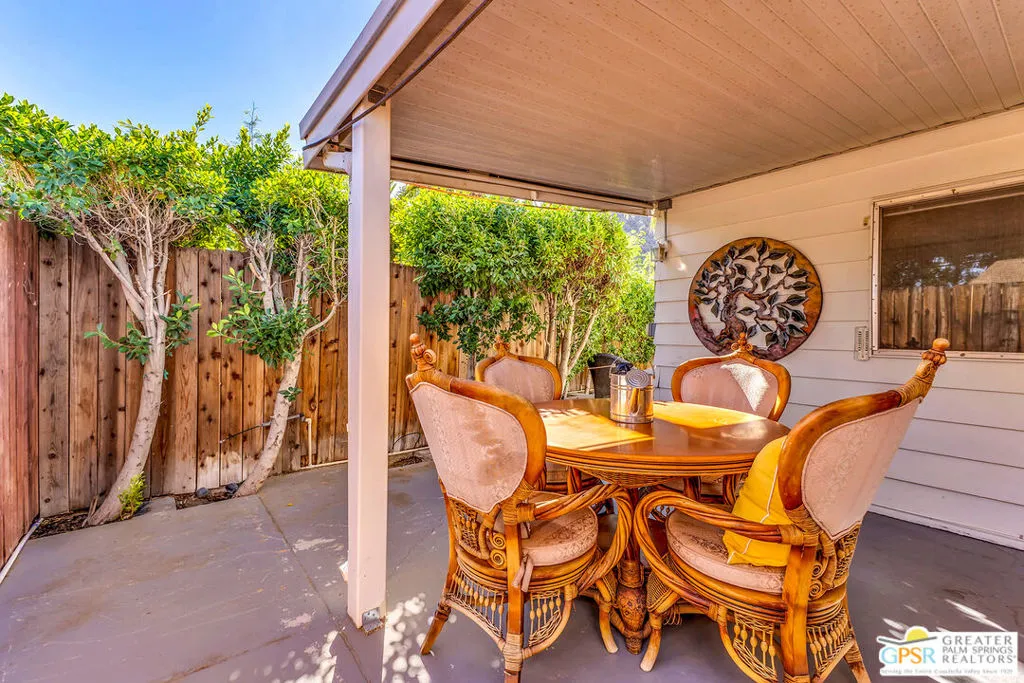 Parkview is a classic Mid-Century Modern community located in desirable South Palm Springs. This spacious 2 bedroom, 2 bath home also includes a versatile flex room ideal as a home office, den, or creative space with its own private entrance. The large kitchen offers generous counter space and abundant storage, perfect for everyday cooking or entertaining. Enjoy a secluded back patio with peek-a-boo mountain views, creating a quiet retreat for relaxing outdoors.Parkview is a 55+ community and management approval is required for residency. No short-term or long-term rentals are permitted. The current land lease is in place through 2027 and will convert to annual renewals thereafter. The park will be managed and maintained by the owners and on-site park manager.