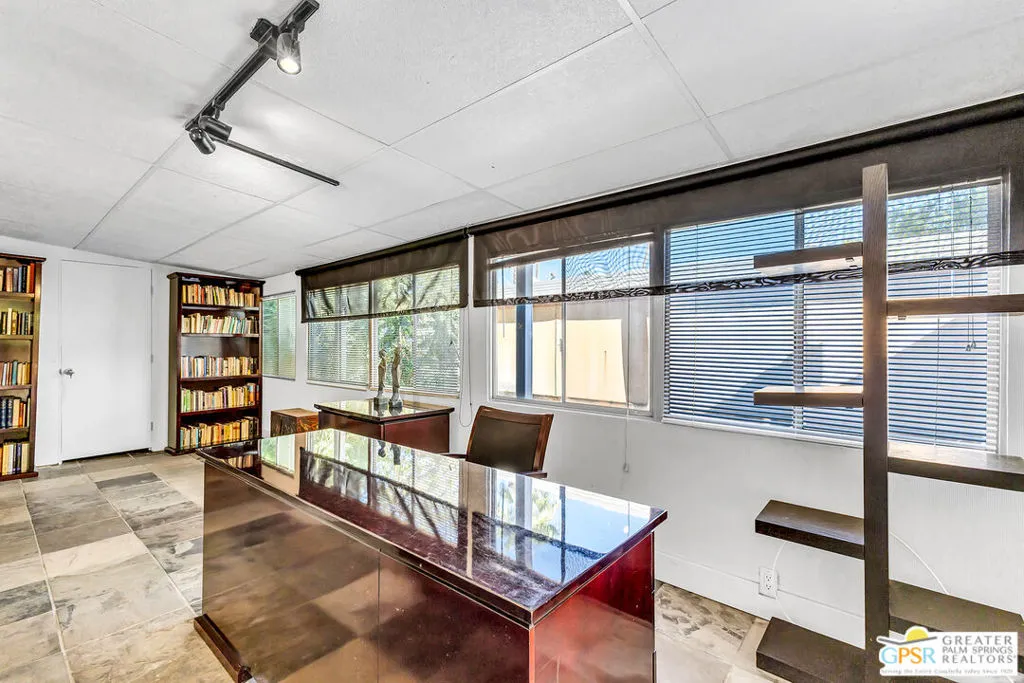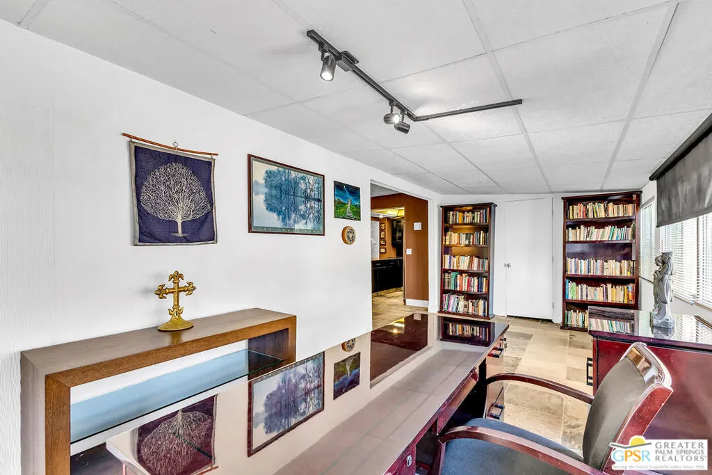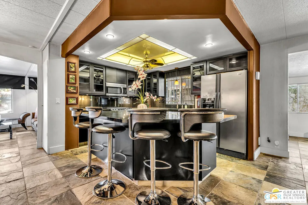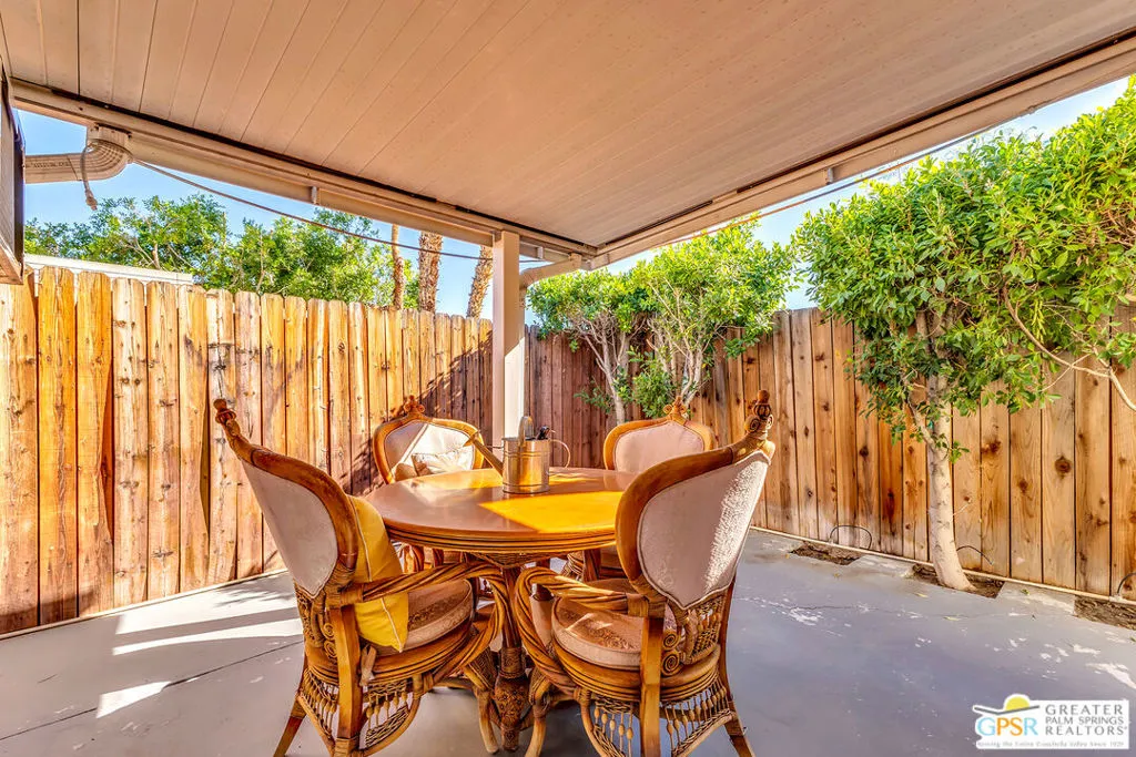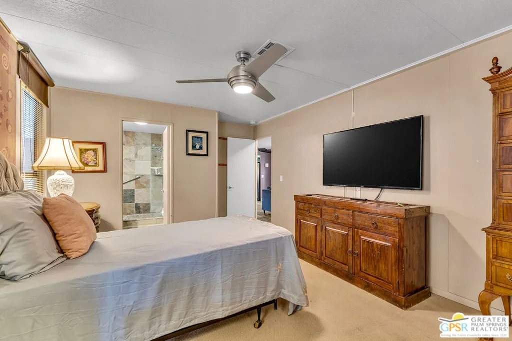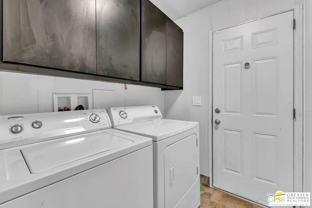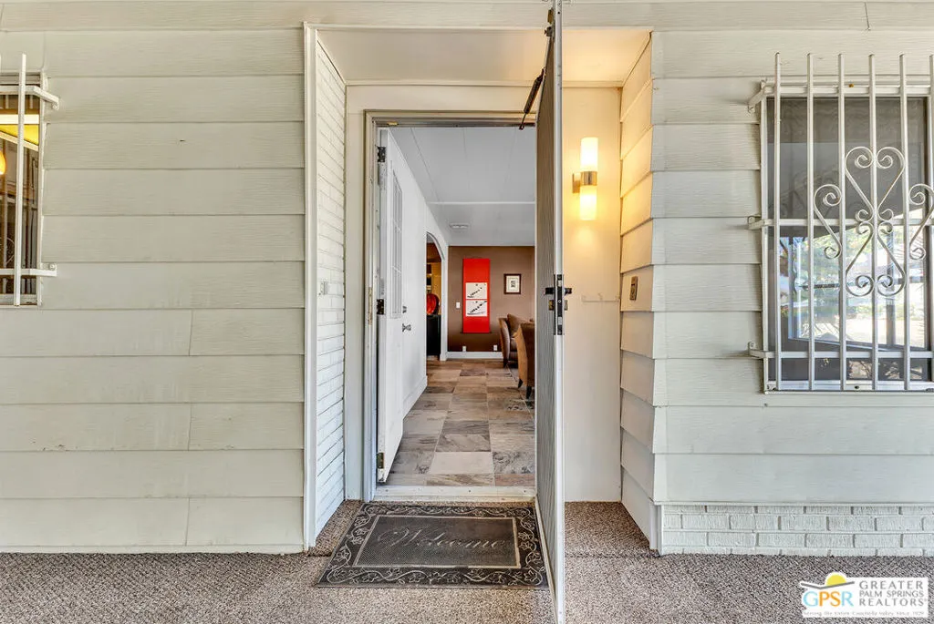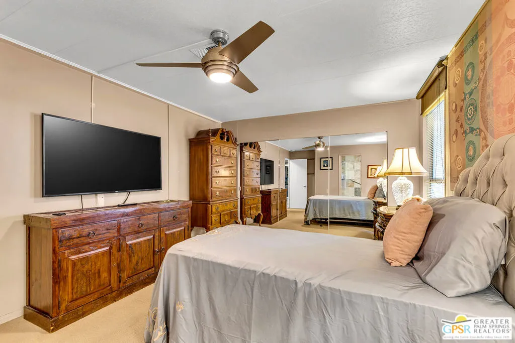 Parkview is a classic Mid-Century Modern community located in desirable South Palm Springs. This spacious 2 bedroom, 2 bath home also includes a versatile flex room ideal as a home office, den, or creative space with its own private entrance. The large kitchen offers generous counter space and abundant storage, perfect for everyday cooking or entertaining. Enjoy a secluded back patio with peek-a-boo mountain views, creating a quiet retreat for relaxing outdoors.Parkview is a 55+ community and management approval is required for residency. No short-term or long-term rentals are permitted. The current land lease is in place through 2027 and will convert to annual renewals thereafter. The park will be managed and maintained by the owners and on-site park manager.