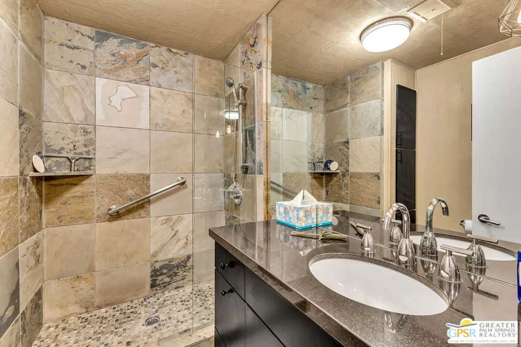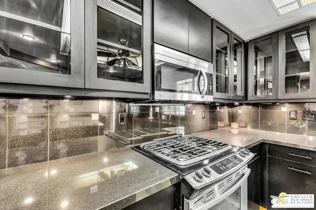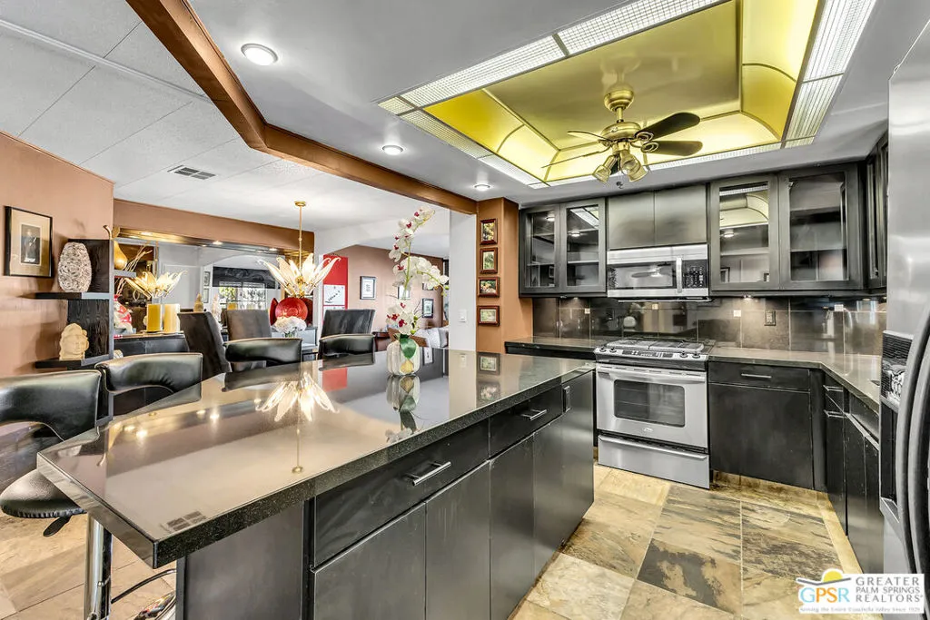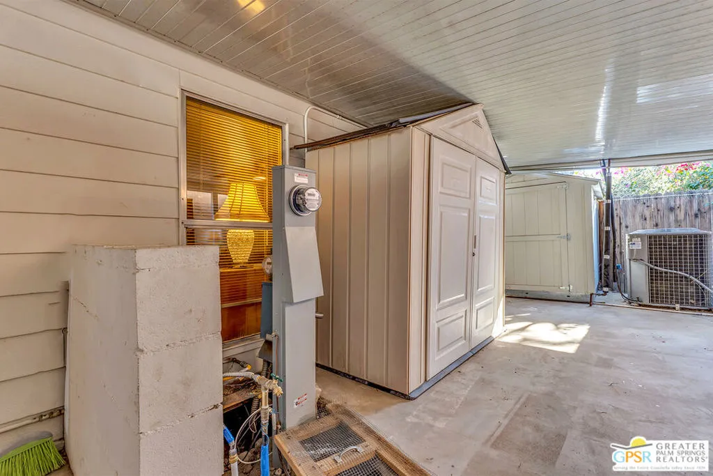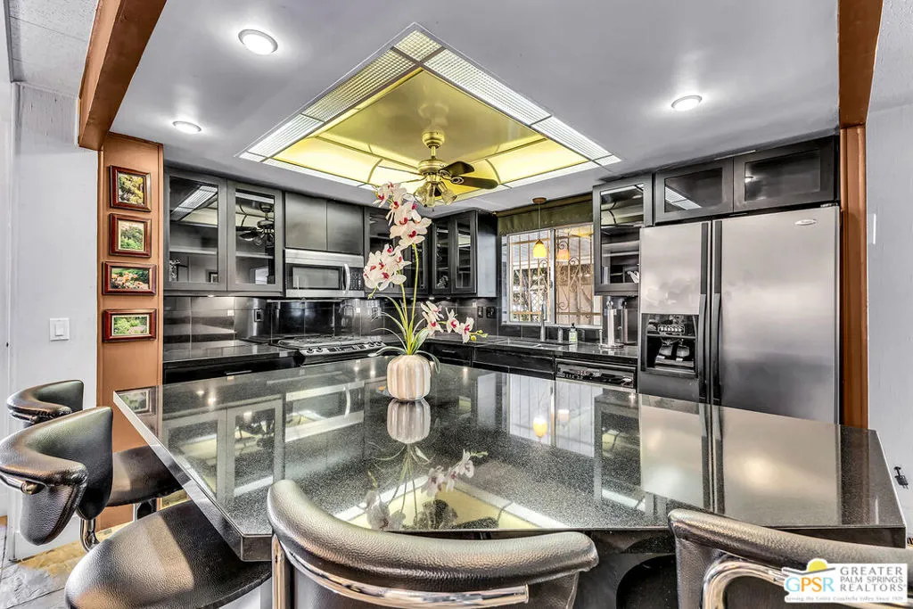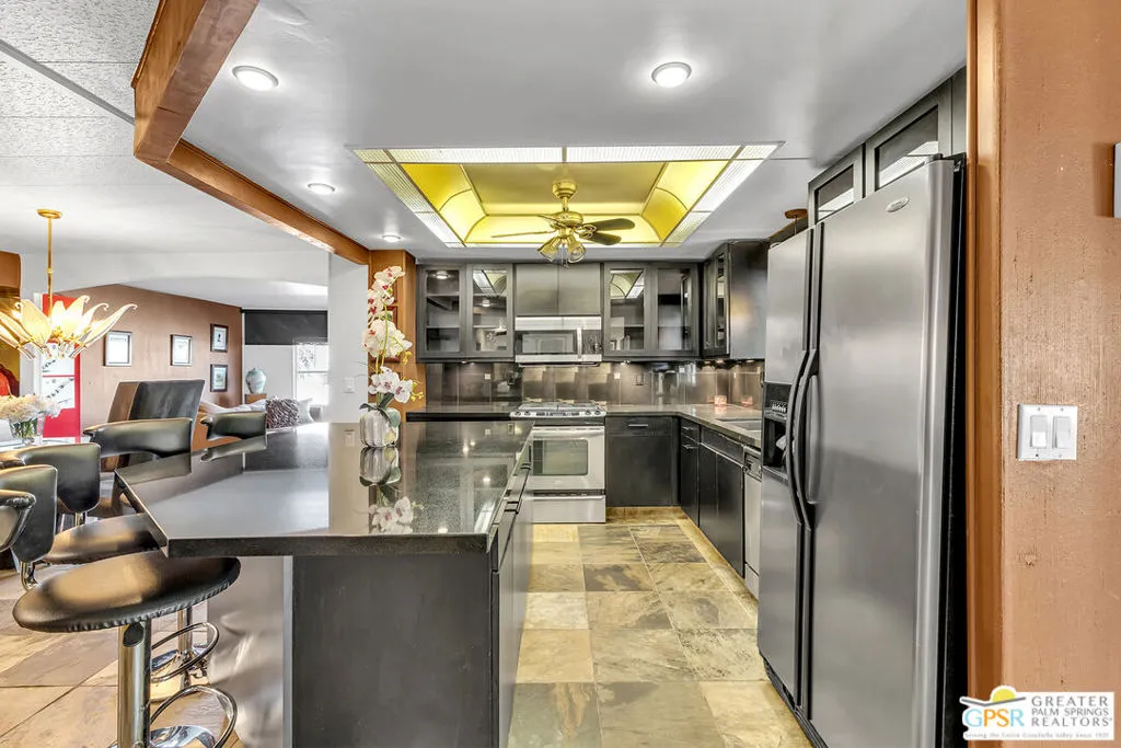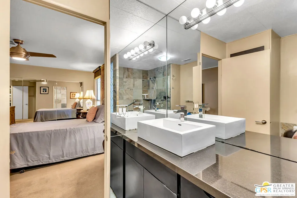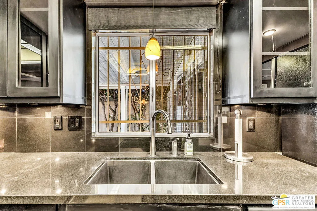 Parkview is a classic Mid-Century Modern community located in desirable South Palm Springs. This spacious 2 bedroom, 2 bath home also includes a versatile flex room ideal as a home office, den, or creative space with its own private entrance. The large kitchen offers generous counter space and abundant storage, perfect for everyday cooking or entertaining. Enjoy a secluded back patio with peek-a-boo mountain views, creating a quiet retreat for relaxing outdoors.Parkview is a 55+ community and management approval is required for residency. No short-term or long-term rentals are permitted. The current land lease is in place through 2027 and will convert to annual renewals thereafter. The park will be managed and maintained by the owners and on-site park manager.