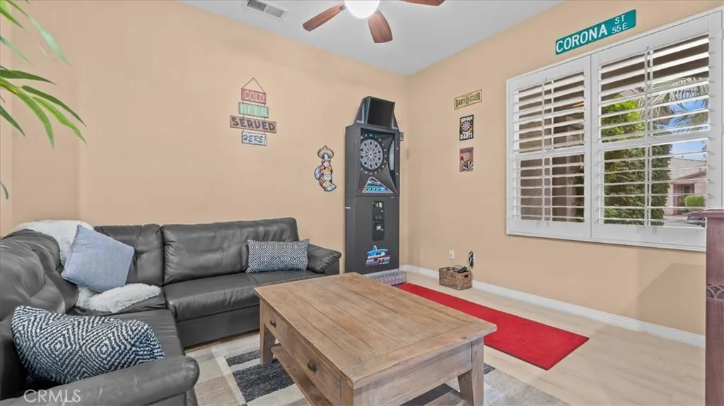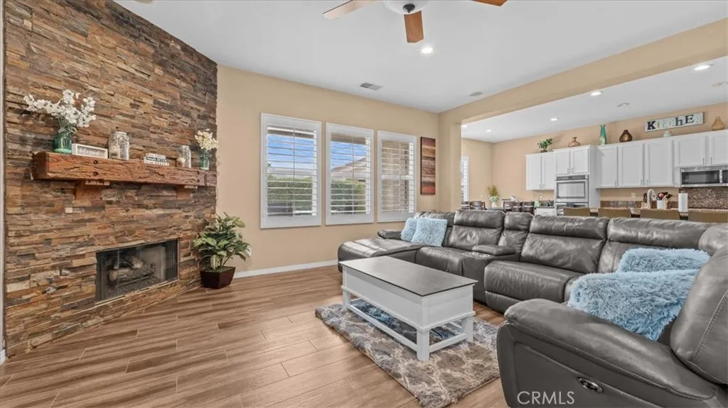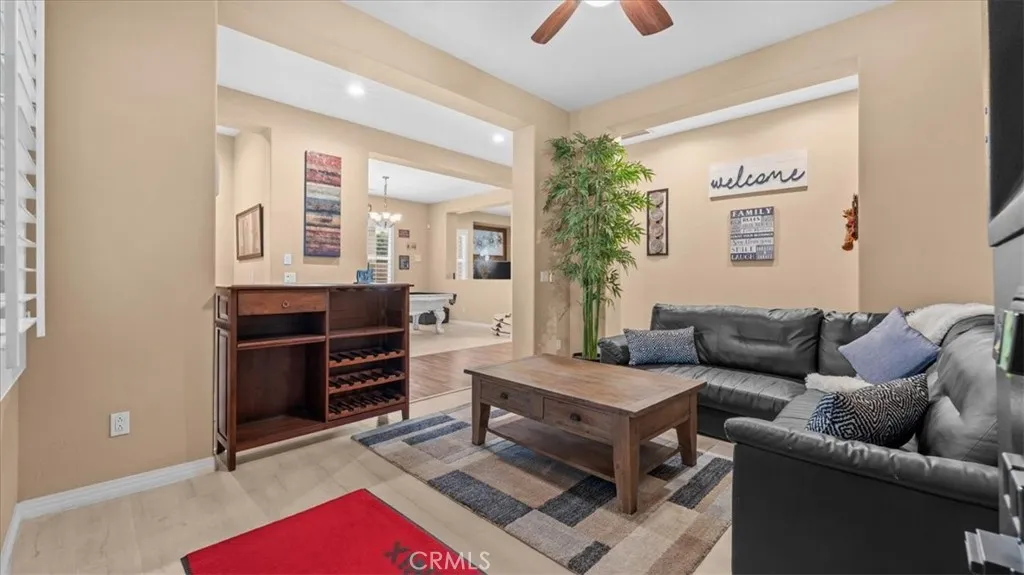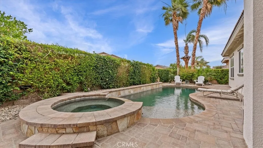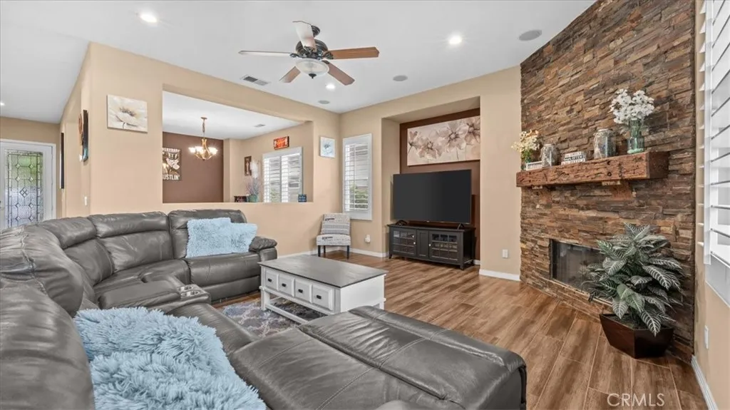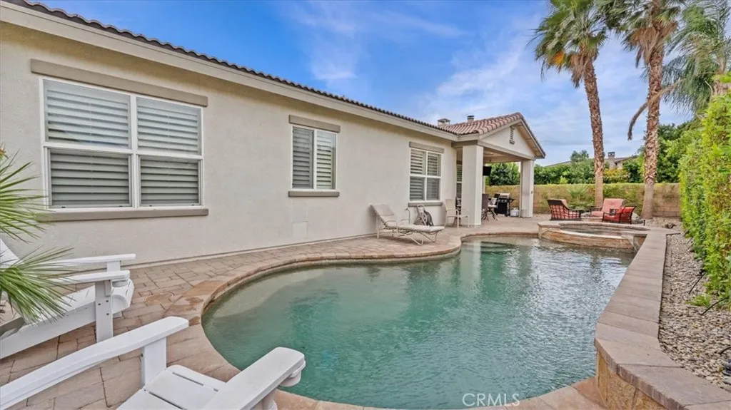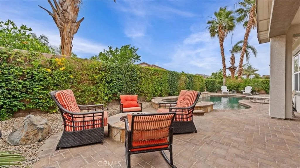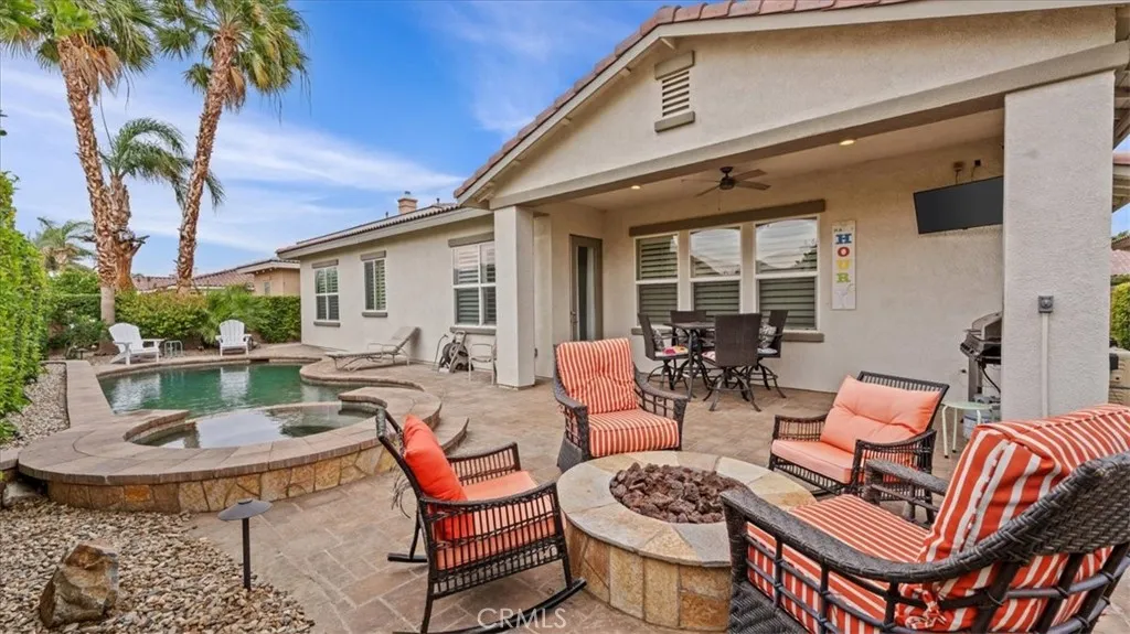 Welcome to this beautiful, turnkey, fully furnished single-story home located in the prestigious Palazzo community. This residence features a spacious open floor plan with three large bedrooms and three full bathrooms, complemented by a formal dining room and a versatile den—ideal for entertaining family and friends. At the heart of the home is a warm, cozy fireplace and a wide-open, fully upgraded kitchen. The chef’s space boasts a pantry, ample cabinet storage, and a large island with plenty of seating. Modern conveniences abound, including a whole-house water softener, a dedicated kitchen water purifier, a tankless water heater for instant hot water, and two HVAC units (one of which is brand new, serving all bedrooms). The interior is finished with stylish tile-like flooring throughout the main living areas and plush carpeting in the bedrooms for added comfort. Step outside to a backyard oasis featuring a saltwater pool and jacuzzi situated just off the patio. Surrounded by elegant pavers and featuring a gas firepit, this outdoor space is perfect for relaxing or hosting gatherings.