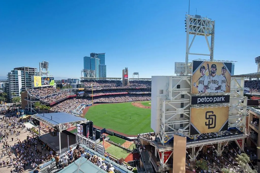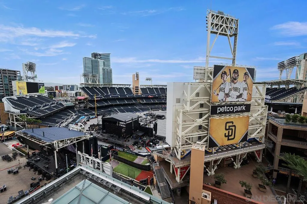 This 10th floor 2 bedroom/2 bath condo at The Legend is a homerun; captivating views directly into San Diego’s famed Petco Park! First time ever offered for sale by the original owner, enjoy baseball games and open-air concerts right from your living room or your spacious balcony – or from the incredible 7th floor ‘Club Legend’ deck. Great natural light from expansive windows, new paint and carpet, a split-bedroom floor plan ideal for privacy, and an open-concept granite and stainless kitchen. Complete with a parking space near the elevator and private storage just steps from your front door. First of this floor plan to hit the market in 6 years! See supplement for more details. The gourmet kitchen is a chef's dream, showcasing stainless appliances, granite countertops, European-style cabinetry, and an inviting eat-at bar illuminated by elegant pendant lighting. Floor-to-ceiling windows not only flood the condo with natural light but also offer breathtaking, unobstructed views of Petco Park and Gallagher Square. The split-bedroom floor plan is perfect for privacy for roommates or guests. The primary bedroom suite doesn’t skimp on views either. The ensuite bathroom features a dual vanity, tasteful custom tile backsplash, and frameless glass-enclosed shower. The Legend is the only residential high-rise to be built inside the gates of our Major League Ballpark & the only residential tower to be built on the 3-acre Park at the Park / Gallagher Square! This iconic building overlooking the Padres ballpark (voted the best ballpark in America) will be treasured for generations with historic detailing preserved by Bosa Development to create a world-class residential tower. The Legend is centrally located just a few blocks from the Gaslamp Quarter & Marina District for convenient access to endless shopping & dining options. The Legend’s amenities include a 2nd floor rooftop deck looking out over Park at the Park complete with pool & spa, fully equipped fitness room, roof garden, barbeque area, steam, sauna, and changing rooms. Entertain guests in ‘Club Legend’, the 7th-floor social lounge featuring a sprawling rooftop terrace with panoramic Petco Park views and a cozy outdoor fireplace lounge and outdoor kitchen. Additional conveniences include guest parking reservations via mobile app, 24-hour concierge and security services, and plans for EV charging stations within the secured garage. Previous builder documents cited 972 sq .ft., assessor records now indicate 888 sq. ft. VA Approved (000017) & FHA Approved(S007729)!