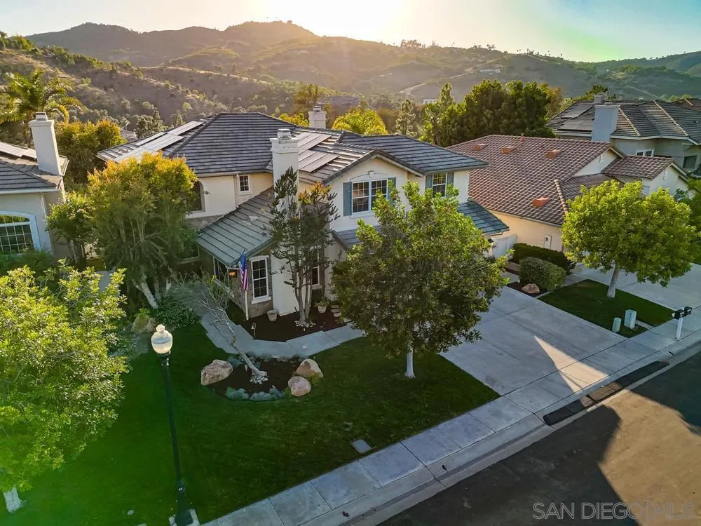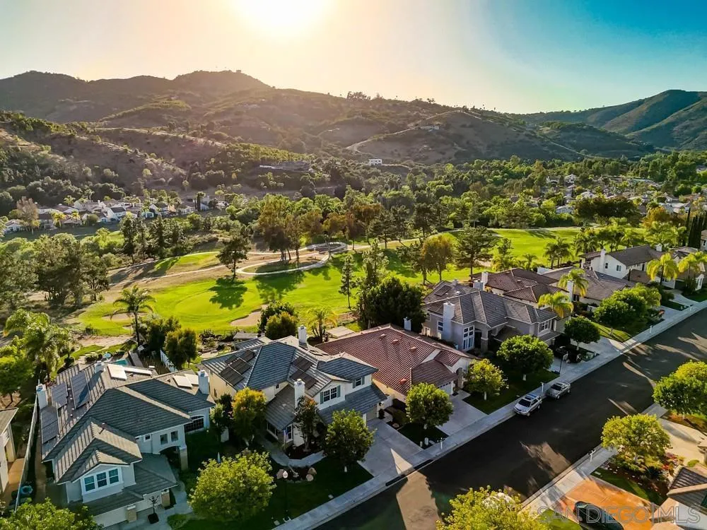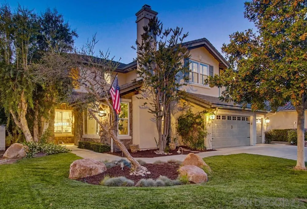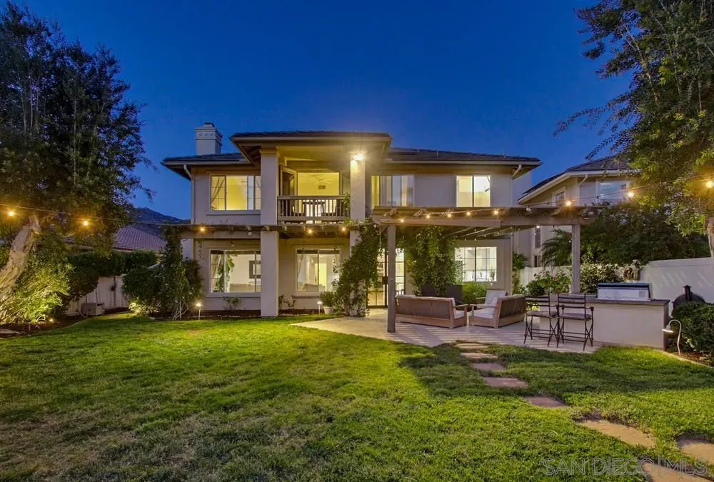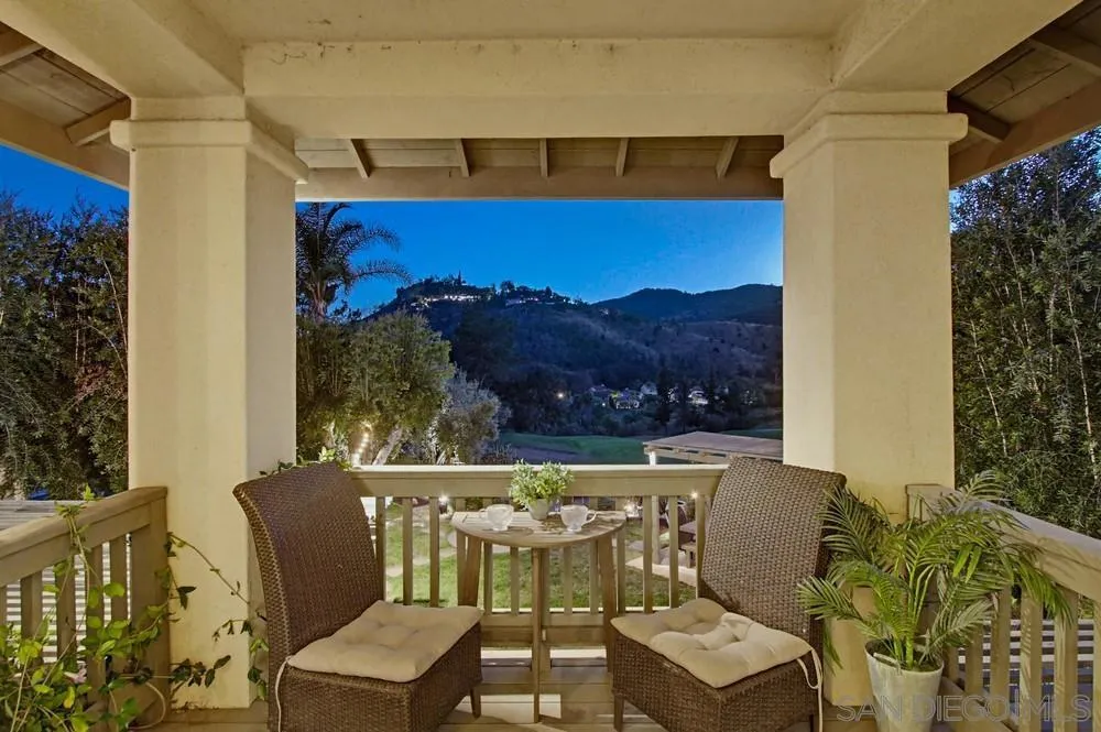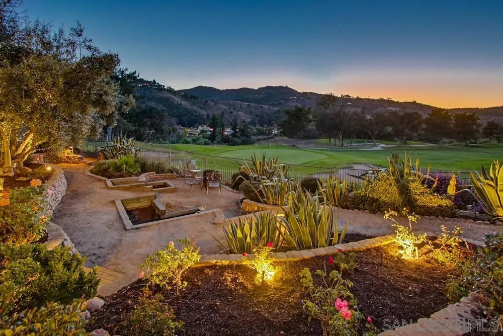 This spectacular home offers breathtaking, elevated views of the 8th green of the 4-star Dos Osos Golf Course, lush avocado orchards, and stunning sunsets in sought-after Rancho San Pasqual! The expansive, multi-tiered backyard is an entertainer’s dream, featuring multiple sitting and dining areas, a built-in BBQ, a fireplace, landscape lighting, and endless opportunity for San Diego outdoor living. The newly remodeled gourmet kitchen features black quartz counters, shaker white cabinets, stainless steel appliances, a 48-inch built-in Sub-Zero refrigerator, and luxury vinyl plank (LVP) flooring throughout the downstairs. The kitchen opens seamlessly to a large family room with a gas fireplace. Additional highlights include French doors, custom shutters and window treatments, a formal living room with fireplace, and a formal dining room. The oversized primary suite includes a private retreat, double doors leading to a deck with sweeping backyard and golf course views, plus a luxurious bathroom with a Lasco tub, separate shower, and a huge walk-in closet. The downstairs office/bedroom offers built-in bookcases and a desk with glass-paned doors. Upstairs, one bedroom features a separate sitting room with a wet bar—perfect as a bonus room or bedroom. Additional features include a 3-car garage with epoxy flooring and ample storage, a whole-house generator hook-up for reliable power during outages, dual A/C and heating systems, and leased solar panels. See supplement Nestled in the highly desirable Rancho San Pasqual community, known for its spacious Catavina Homes and beautiful variety of architectural styles, this property offers a rare combination of privacy, luxury, and resort-style living. Residents enjoy access to a large pool, sport court, playground, picnic area, and more—all within a secure gated enclave. Its premier location is just minutes from hiking trails and provides easy access to I-15 for commuting.