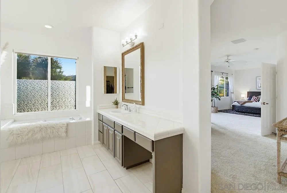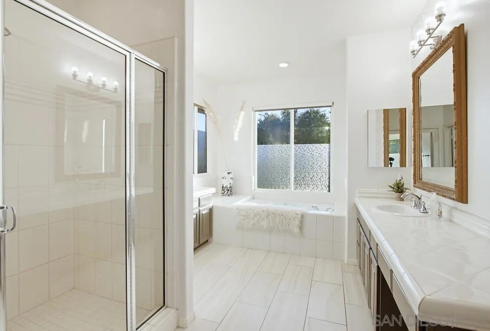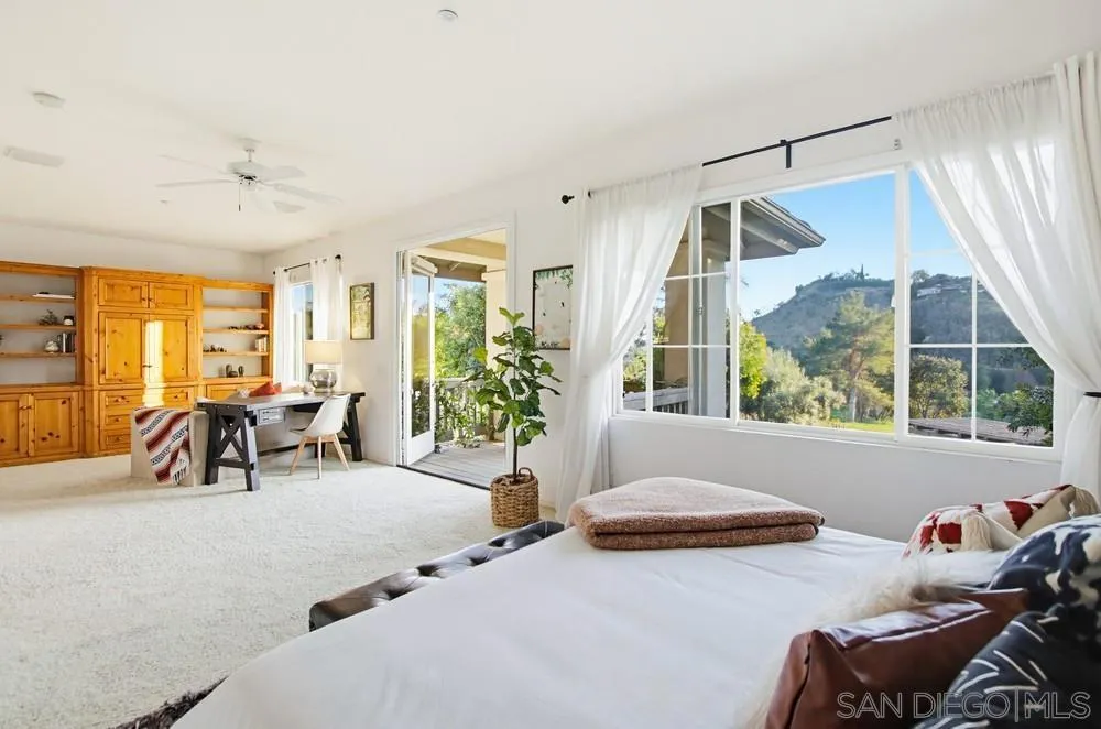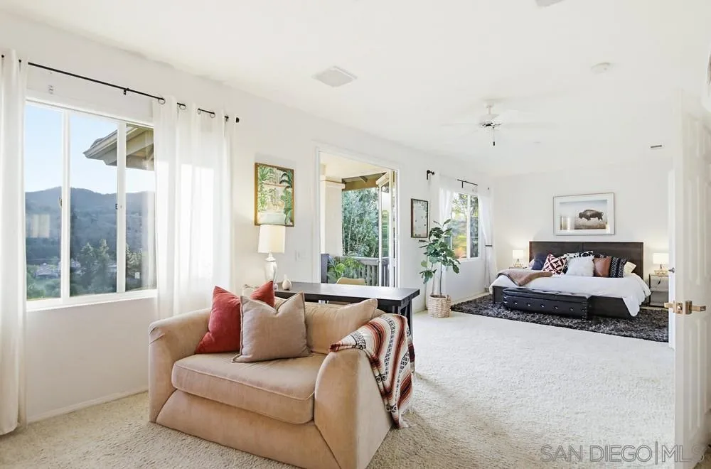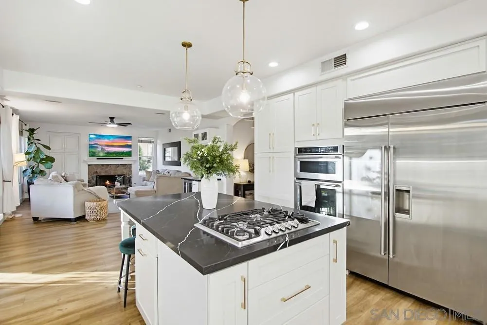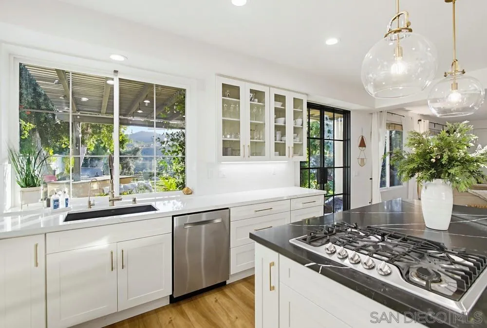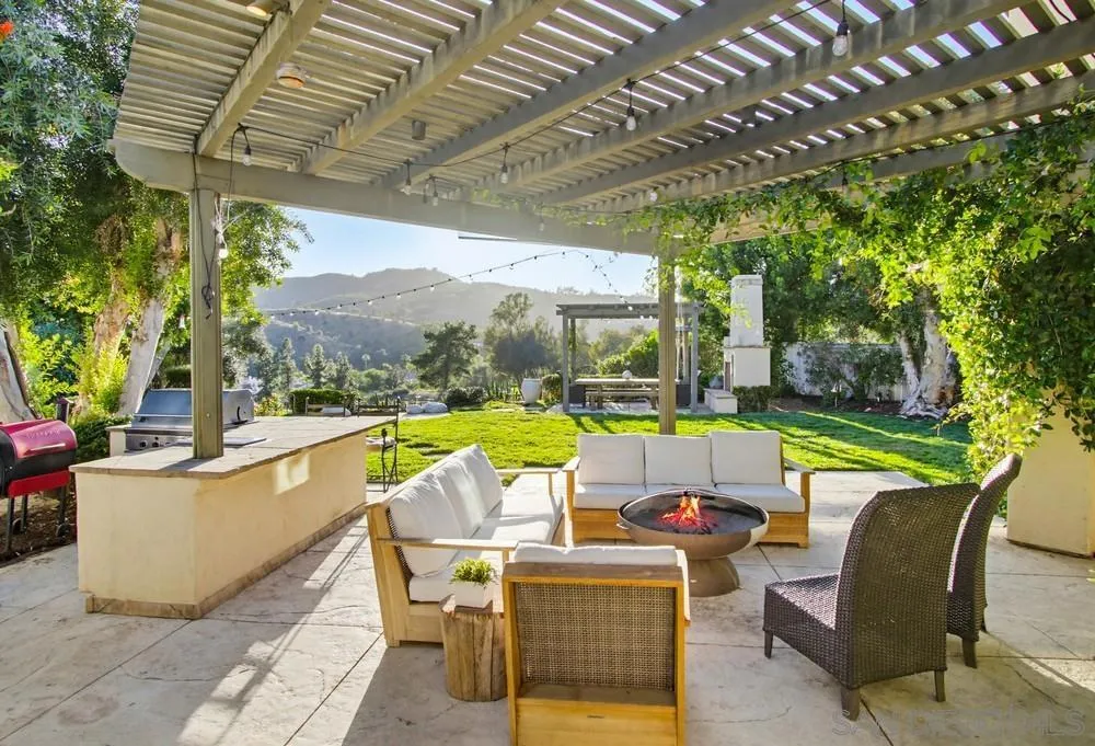 This spectacular home offers breathtaking, elevated views of the 8th green of the 4-star Dos Osos Golf Course, lush avocado orchards, and stunning sunsets in sought-after Rancho San Pasqual! The expansive, multi-tiered backyard is an entertainer’s dream, featuring multiple sitting and dining areas, a built-in BBQ, a fireplace, landscape lighting, and endless opportunity for San Diego outdoor living. The newly remodeled gourmet kitchen features black quartz counters, shaker white cabinets, stainless steel appliances, a 48-inch built-in Sub-Zero refrigerator, and luxury vinyl plank (LVP) flooring throughout the downstairs. The kitchen opens seamlessly to a large family room with a gas fireplace. Additional highlights include French doors, custom shutters and window treatments, a formal living room with fireplace, and a formal dining room. The oversized primary suite includes a private retreat, double doors leading to a deck with sweeping backyard and golf course views, plus a luxurious bathroom with a Lasco tub, separate shower, and a huge walk-in closet. The downstairs office/bedroom offers built-in bookcases and a desk with glass-paned doors. Upstairs, one bedroom features a separate sitting room with a wet bar—perfect as a bonus room or bedroom. Additional features include a 3-car garage with epoxy flooring and ample storage, a whole-house generator hook-up for reliable power during outages, dual A/C and heating systems, and leased solar panels. See supplement Nestled in the highly desirable Rancho San Pasqual community, known for its spacious Catavina Homes and beautiful variety of architectural styles, this property offers a rare combination of privacy, luxury, and resort-style living. Residents enjoy access to a large pool, sport court, playground, picnic area, and more—all within a secure gated enclave. Its premier location is just minutes from hiking trails and provides easy access to I-15 for commuting.