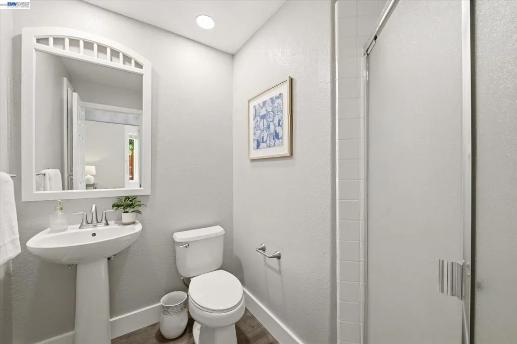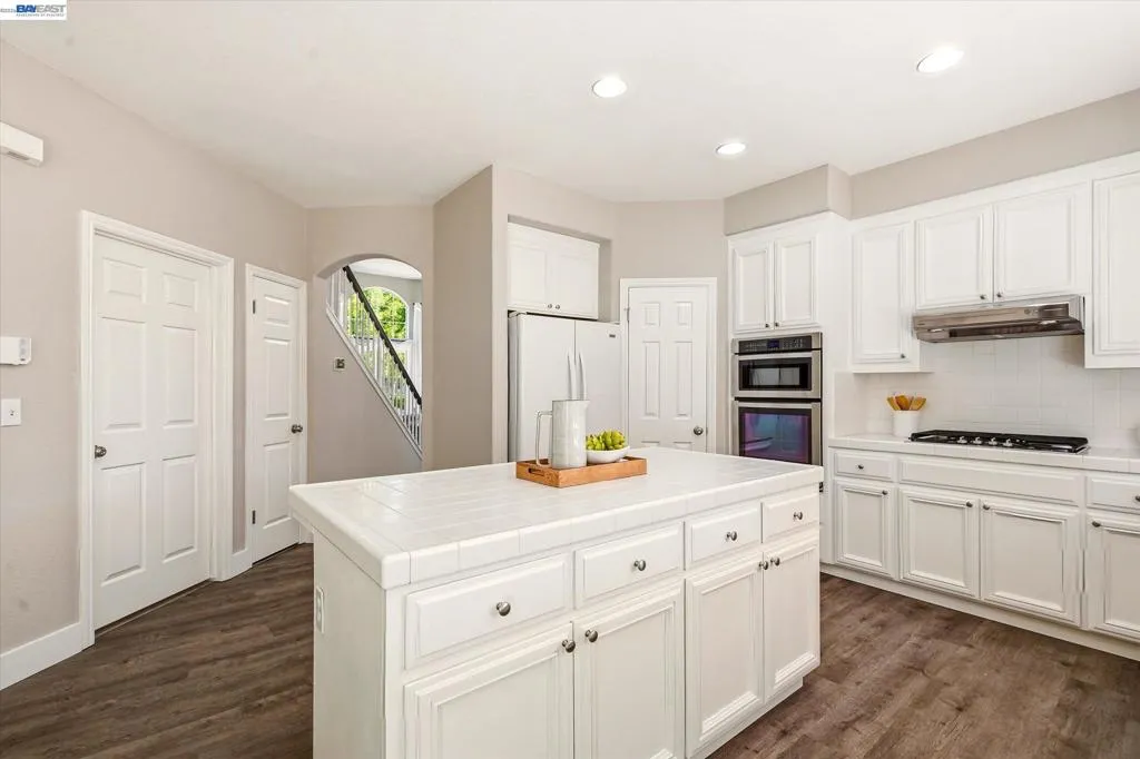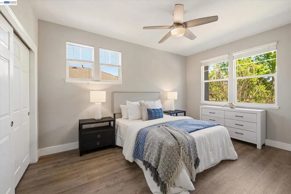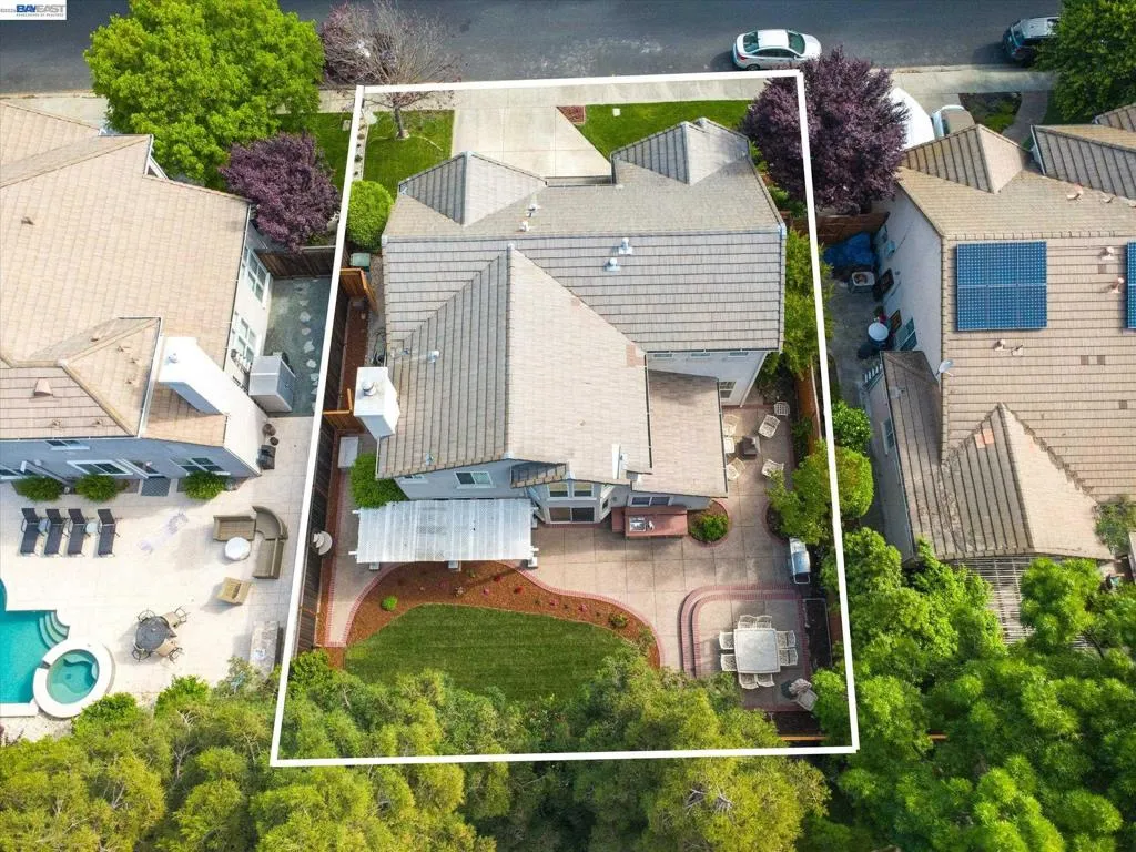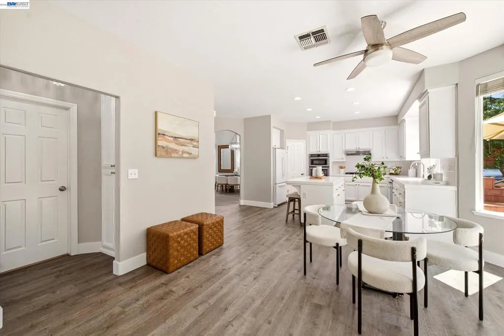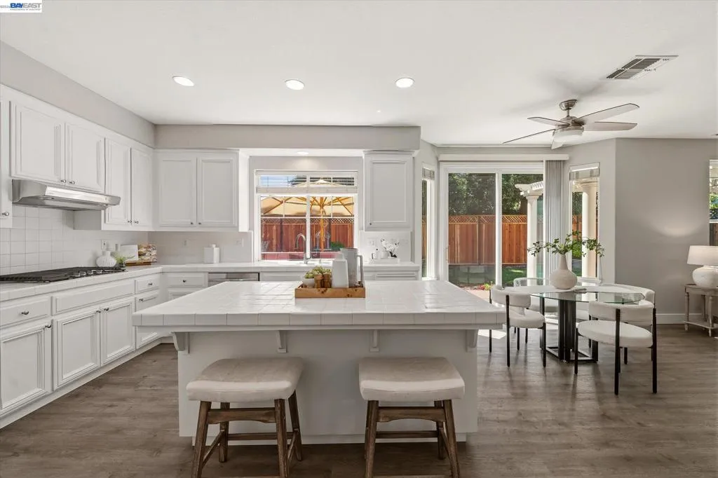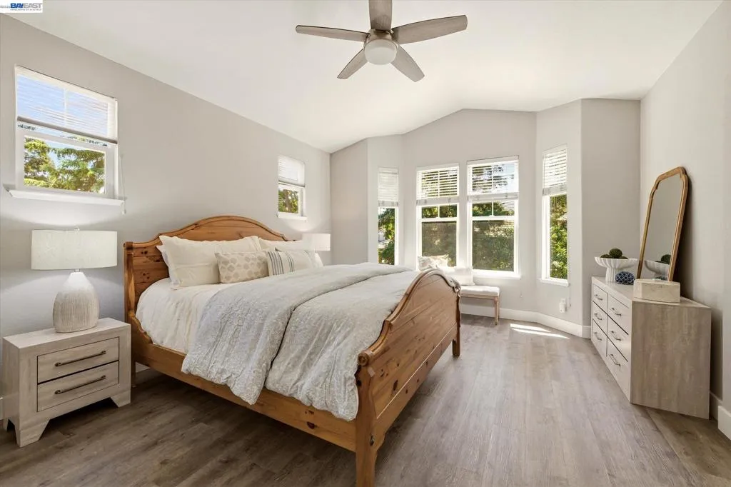 Fantastic east-facing four-bedroom, three-bath home situated directly across from the beautiful 6 acre Hansen Park and just a short walk to top-rated K–12 schools, downtown Pleasanton, and shopping. Enjoy easy commuter access to the 580/680 freeways. Inside, you’re greeted by abundant natural light, soaring 14-foot ceilings, new luxury vinyl flooring, and fresh paint. The eat-in kitchen boasts a breakfast bar, walk-in pantry, gas stove, dishwasher, built-in microwave, and refrigerator. The family room, with a gas fireplace, overlooks the private backyard. A full bedroom and bath on the main level provide flexibility, while the inside laundry includes a high-efficiency LG washer and dryer. Upstairs, the large primary suite offers an updated bath with a soaking tub, walk-in shower, dual vanities, and a walk-in closet. Two additional bedrooms share a Jack-and-Jill bath. The serene backyard, shaded by mature redwoods, includes a large patio, lawn, and outdoor kitchen with a dishwasher and refrigerator. Plus, new redwood fencing, florring lighting paint, HVAC, storage sheds, and a three-car garage with ample storage. This one will go fast, dont miss out!