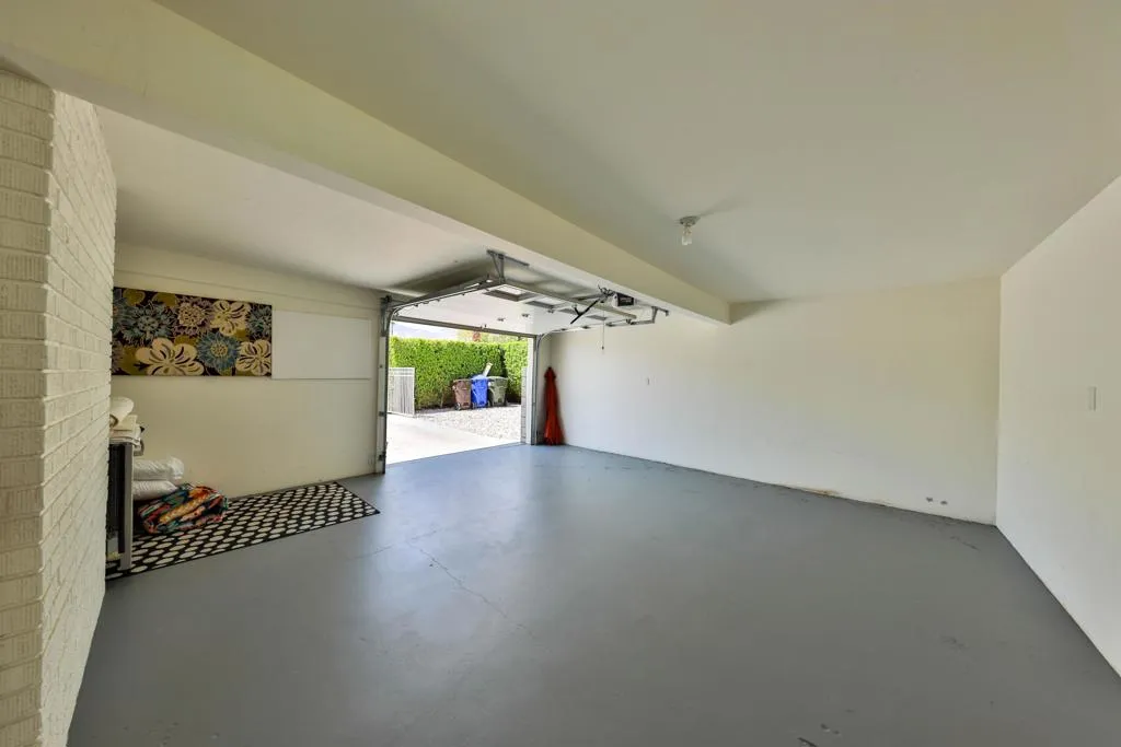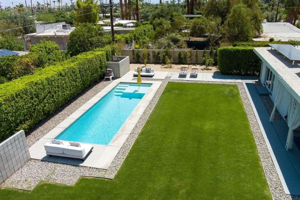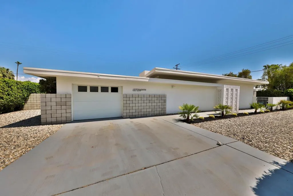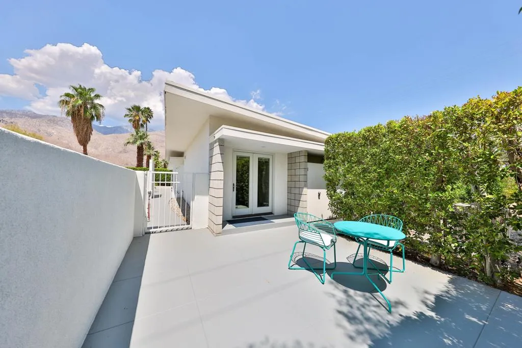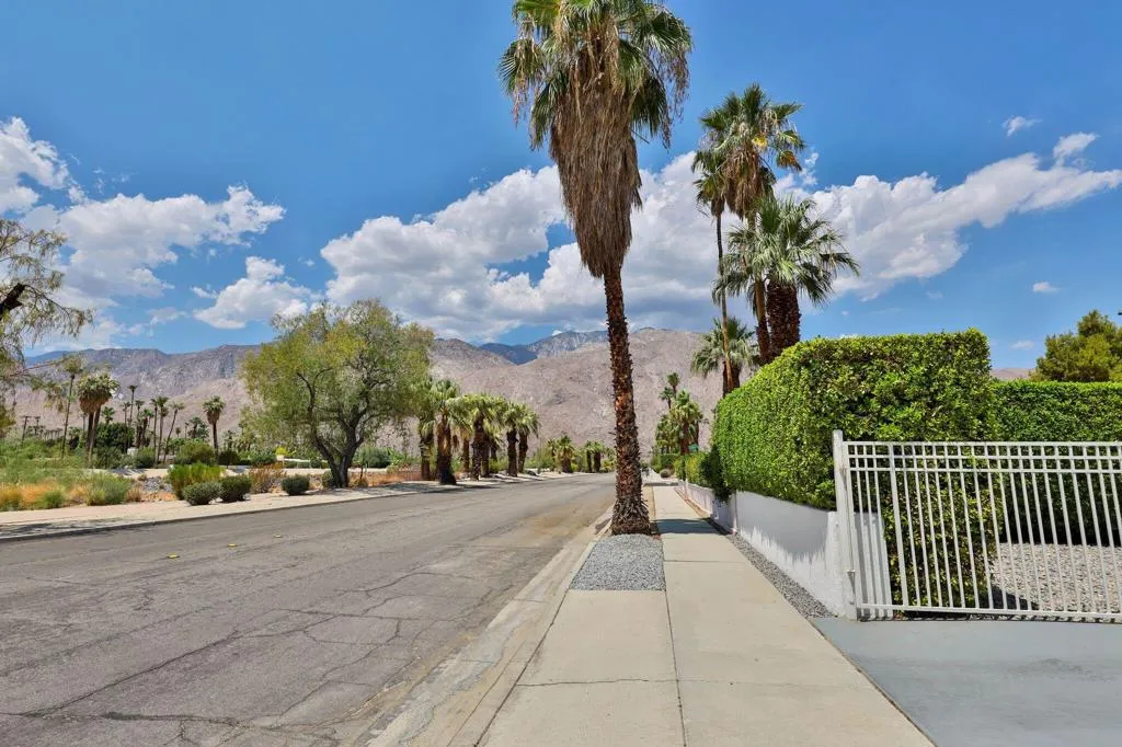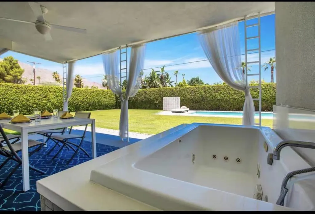 This interior is decorated in an eclectic Mid Modern Century Modern decor. This 1954 home was built by one of architect Paul Trousdale's designers. It has the exposed, high beamed ceiling in the living room. The kitchen is fully equipped with a full range, wall Microwave/Oven/Convection Oven, and dishwasher. Spacious living room with sliding doors opening to pool and garden area. Vaulted ceilings in living room and fans in every room. AC/Heat/Gas Fireplace. Easy walk-in shower. The extra large bedroom includes a King size bed and en suite bathroom on the other end of the bedroom. Sliding glass doors open to the salt pool area. Outdoor bathtub is located in patio! A greenbelt of grass surrounds the pool and private hedges border the entire 10,454 square ft. property, The home it self has plenty of space to add on and extent the home... Enjoy the majestic view of the San Jacinto Mountains!. The best view in Palm Springs! Immerse yourself in total privacy!