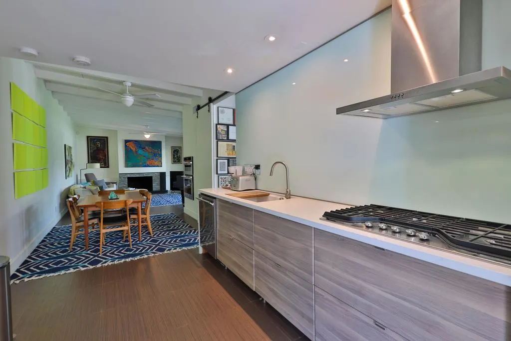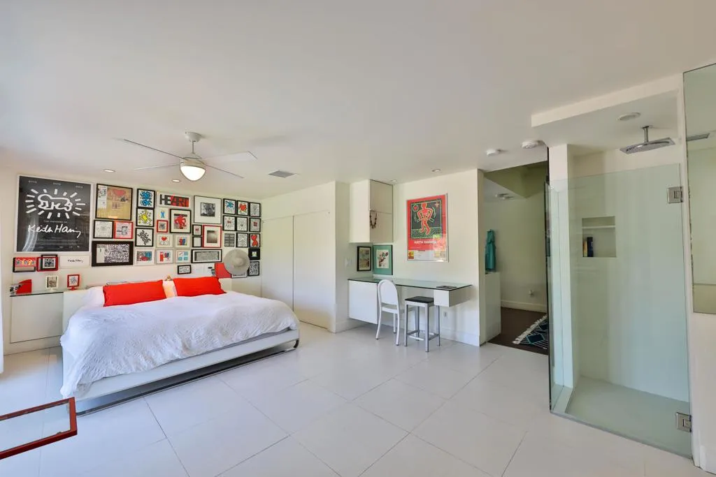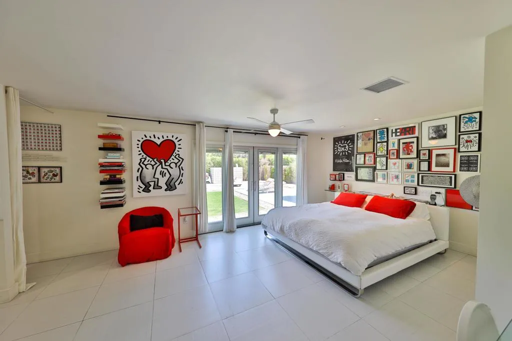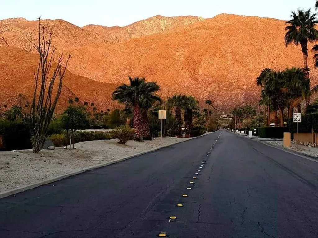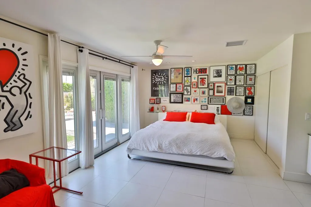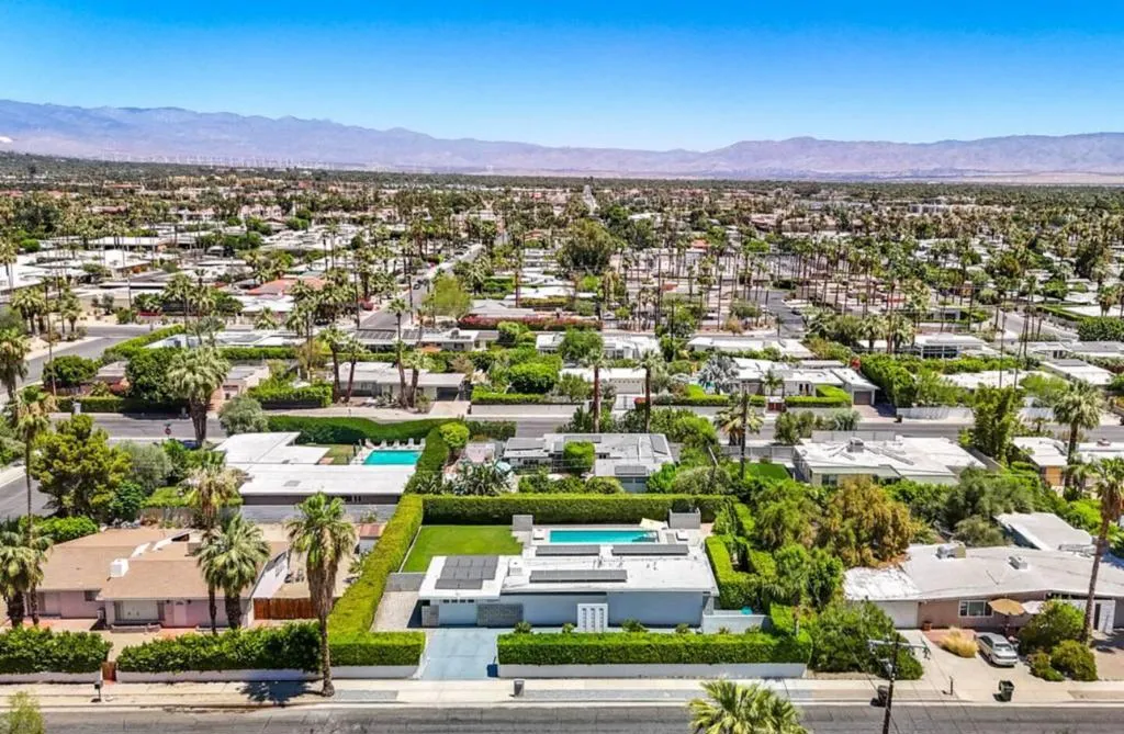 This interior is decorated in an eclectic Mid Modern Century Modern decor. This 1954 home was built by one of architect Paul Trousdale's designers. It has the exposed, high beamed ceiling in the living room. The kitchen is fully equipped with a full range, wall Microwave/Oven/Convection Oven, and dishwasher. Spacious living room with sliding doors opening to pool and garden area. Vaulted ceilings in living room and fans in every room. AC/Heat/Gas Fireplace. Easy walk-in shower. The extra large bedroom includes a King size bed and en suite bathroom on the other end of the bedroom. Sliding glass doors open to the salt pool area. Outdoor bathtub is located in patio! A greenbelt of grass surrounds the pool and private hedges border the entire 10,454 square ft. property, The home it self has plenty of space to add on and extent the home... Enjoy the majestic view of the San Jacinto Mountains!. The best view in Palm Springs! Immerse yourself in total privacy!