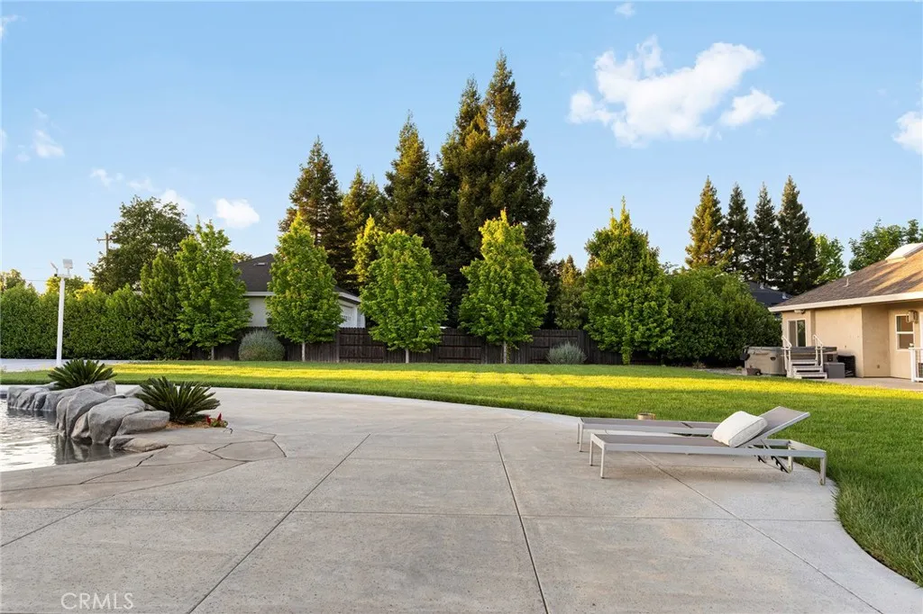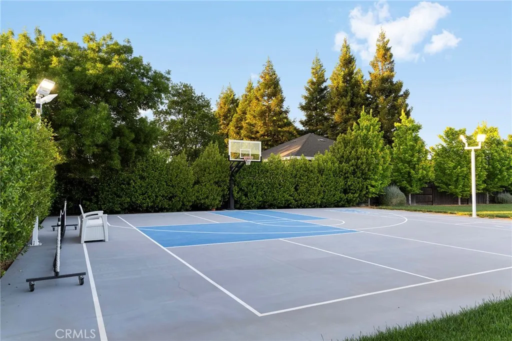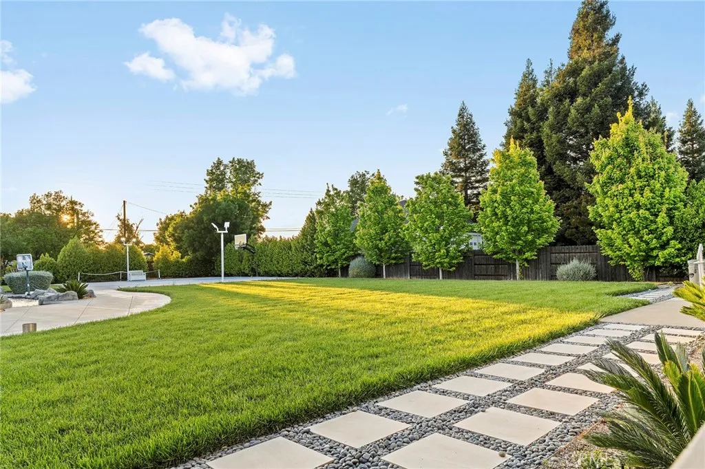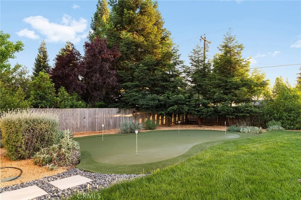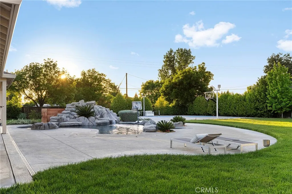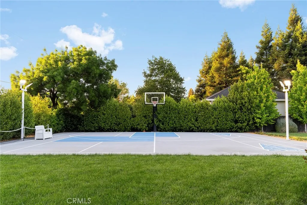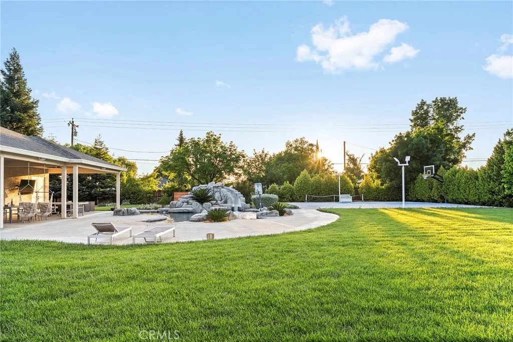 Welcome to a truly one-of-a-kind resort compound in one of Chico's most sought-after neighborhoods — nearly a full acre of turnkey luxury where every detail has been thoughtfully curated with over $1M+ in interior and exterior upgrades. The showstopper is a $600K+ custom pool house — a true second dwelling right in your backyard, with professional Full Swing golf simulator (100+ world courses), designer pool and shuffleboard tables, full kitchenette with commercial ice maker, pass-through bar to the pool deck, and separate bedroom area with a full bath. Ideal for guests, au pair, multi-generational living, a teen hangout, home gym, or the ultimate entertainment retreat. Sleeps four. The backyard is its own destination: a completely renovated salt-water pool with beach entry, rock waterfall, and slide; regulation sport court with pro LED lighting (NBA 3-point line + pickleball), putting green, horseshoe pit, and a generous covered patio with commercial-grade ceiling heaters, outdoor TV, ceiling fan, and dining area. Outdoor Sonos runs throughout with underground wiring. A fenced turf area off the kitchen is perfect for pets or toddlers. The lot has been professionally leveled for a premium flat yard. A dedicated flex zone awaits your vision — garden, greenhouse, outdoor kitchen, or firepit. Inside, both full bathrooms were gut-renovated in 2026 with designer-level finishes and gold fixtures throughout. The fully remodeled chef's kitchen features quartz counters, 6-burner gas cooktop, double wall ovens, oversized island with ample storage, skylights, and built-in wine fridge. Open-concept living is anchored by a marble fireplace, soaring tray ceilings, 77" LG OLED, and in-ceiling Dolby Atmos. A formal dining space sits just off the entry, alongside a light-filled bonus room with French doors — ideal as a home office, playroom, or flex space. Four bedrooms share a private hallway. The master opens directly to the yard This is a professionally integrated smart home: 11-zone Sonos audio (8 indoor, 3 outdoor), enterprise-grade Ubiquiti WiFi covering the entire acre, $50K+ owned solar (near-zero electric bills), whole-home water filtration, infrared sauna, and home gym — all included. 3-car garage. Mature tree-lined privacy. This isn't just a home — it's a lifestyle.