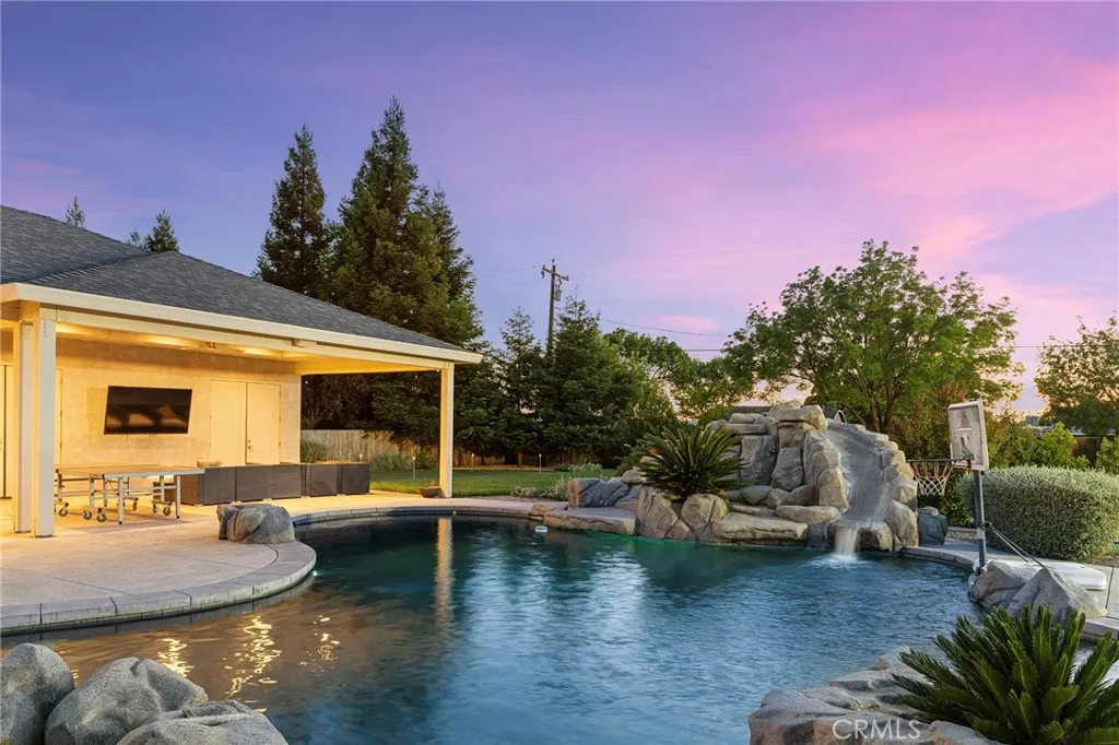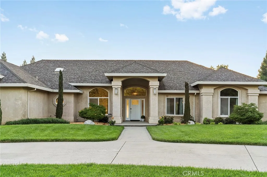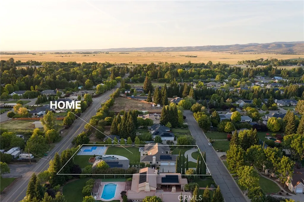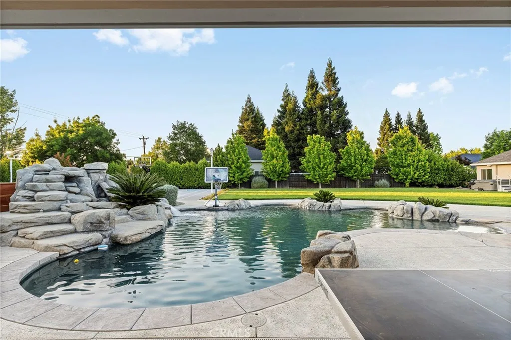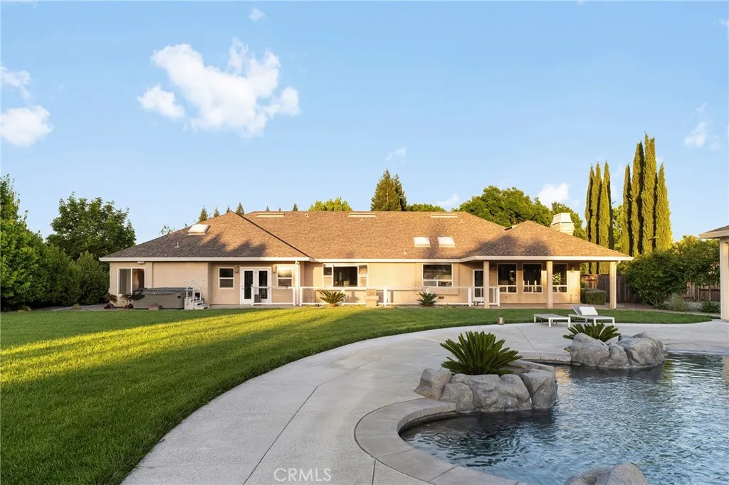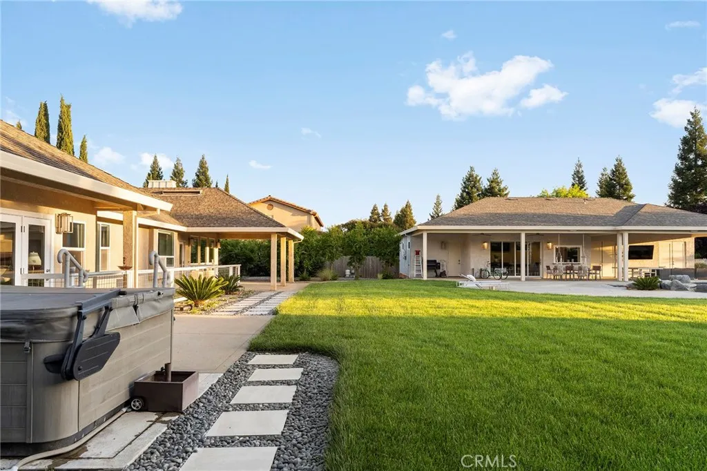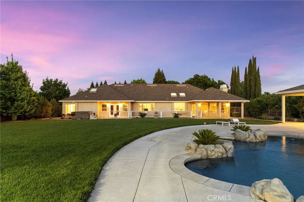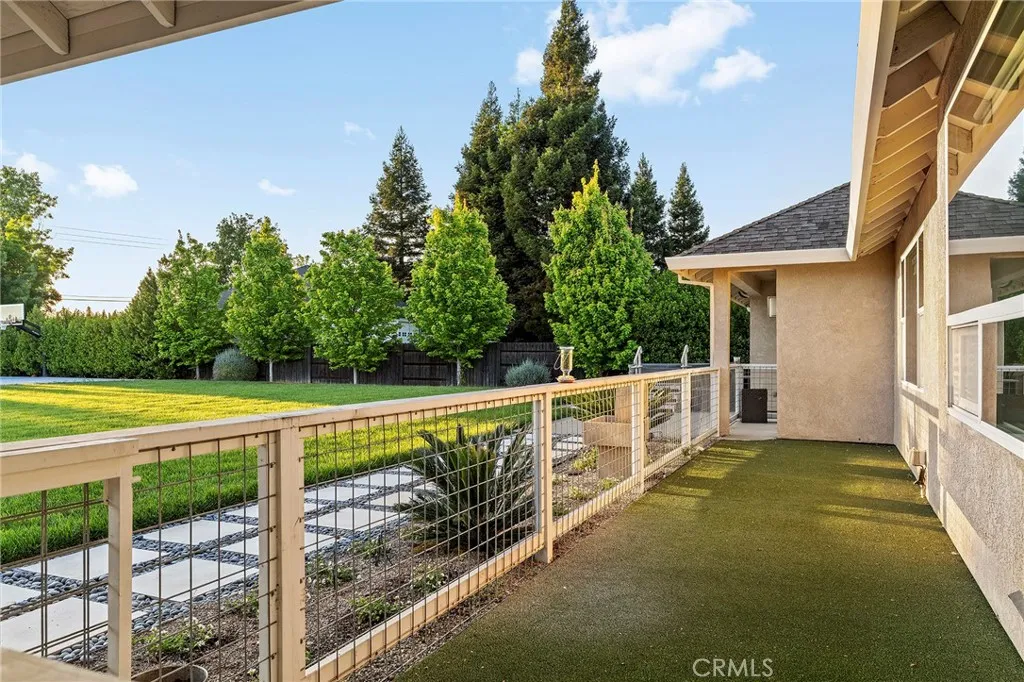 Welcome to a truly one-of-a-kind resort compound in one of Chico's most sought-after neighborhoods — nearly a full acre of turnkey luxury where every detail has been thoughtfully curated with over $1M+ in interior and exterior upgrades. The showstopper is a $600K+ custom pool house — a true second dwelling right in your backyard, with professional Full Swing golf simulator (100+ world courses), designer pool and shuffleboard tables, full kitchenette with commercial ice maker, pass-through bar to the pool deck, and separate bedroom area with a full bath. Ideal for guests, au pair, multi-generational living, a teen hangout, home gym, or the ultimate entertainment retreat. Sleeps four. The backyard is its own destination: a completely renovated salt-water pool with beach entry, rock waterfall, and slide; regulation sport court with pro LED lighting (NBA 3-point line + pickleball), putting green, horseshoe pit, and a generous covered patio with commercial-grade ceiling heaters, outdoor TV, ceiling fan, and dining area. Outdoor Sonos runs throughout with underground wiring. A fenced turf area off the kitchen is perfect for pets or toddlers. The lot has been professionally leveled for a premium flat yard. A dedicated flex zone awaits your vision — garden, greenhouse, outdoor kitchen, or firepit. Inside, both full bathrooms were gut-renovated in 2026 with designer-level finishes and gold fixtures throughout. The fully remodeled chef's kitchen features quartz counters, 6-burner gas cooktop, double wall ovens, oversized island with ample storage, skylights, and built-in wine fridge. Open-concept living is anchored by a marble fireplace, soaring tray ceilings, 77" LG OLED, and in-ceiling Dolby Atmos. A formal dining space sits just off the entry, alongside a light-filled bonus room with French doors — ideal as a home office, playroom, or flex space. Four bedrooms share a private hallway. The master opens directly to the yard This is a professionally integrated smart home: 11-zone Sonos audio (8 indoor, 3 outdoor), enterprise-grade Ubiquiti WiFi covering the entire acre, $50K+ owned solar (near-zero electric bills), whole-home water filtration, infrared sauna, and home gym — all included. 3-car garage. Mature tree-lined privacy. This isn't just a home — it's a lifestyle.