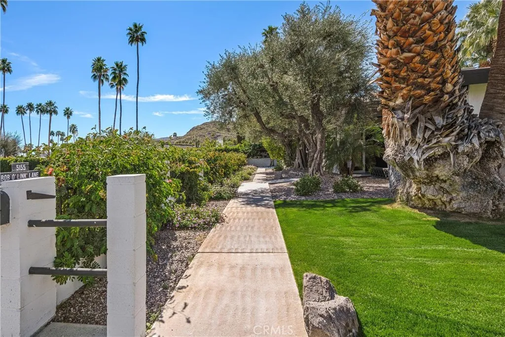 Discover timeless mid-century modern charm at 5155 East Bobolink Lane, a single-level desert retreat positioned between the 6th and 7th fairways of the Legend Course at Tahquitz Creek Golf Club. Built in 1962 and thoughtfully updated, this 4-bedroom, 3-bath home offers approximately 2,425 square feet of light-filled living with vaulted ceilings, a dual-sided vintage block fireplace, and an open chef’s kitchen anchored by an oversized island and buffet with beverage fridge—ideal for entertaining. The primary suite enjoys privacy and serene fairway views, a walk-in closet, and a spa-like bath with separate tub and shower. Step outside to resort-style grounds on a generous 10,454 sq ft lot: saltwater pool and spa with waterfall, new pool decking, circular fire pit, outdoor kitchen, shower, and multiple patios framed by swaying palms and mountain panoramas. Recent improvements include a new roof, updated HVAC, smooth stucco, upgraded electrical and lighting, and epoxied concrete floors, providing modern comfort with classic architectural character. With no HOA or land lease and current eligibility for a short-term rental permit, the property suits full-time residents, seasonal escapees, or investors seeking turnkey desert lifestyle income. Two-car garage, covered parking and flexible workshop/golf-cart space complete the package. Experience effortless indoor-outdoor living, dramatic views, and rare golf-course frontage—schedule a private showing today and make this Palm Springs classic your own. Located minutes from downtown Palm Springs' vibrant dining, shopping and cultural scene, this iconic residence offers both peaceful solitude and easy access to city amenities—an extraordinary opportunity in a coveted south-end neighborhood today.
