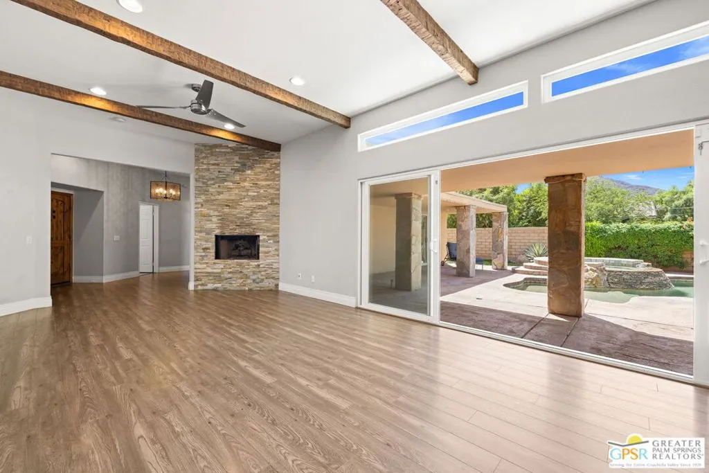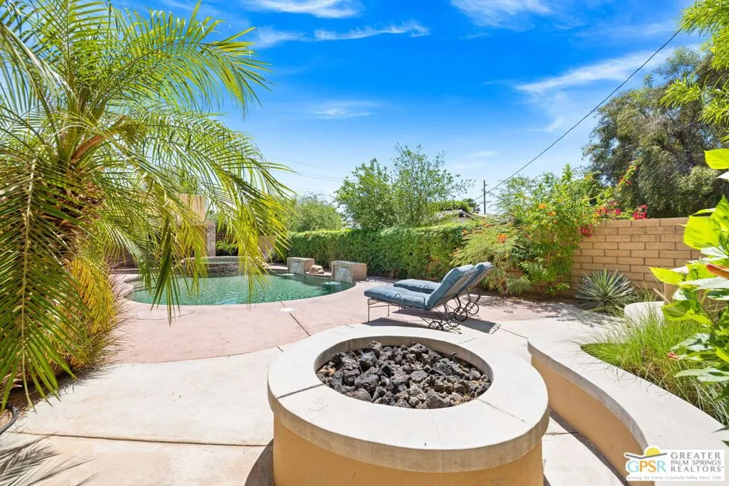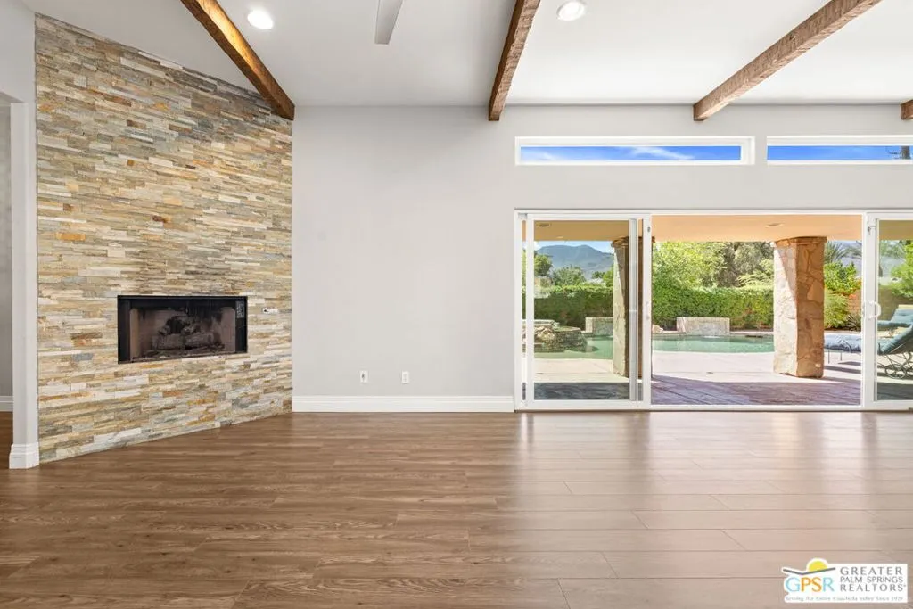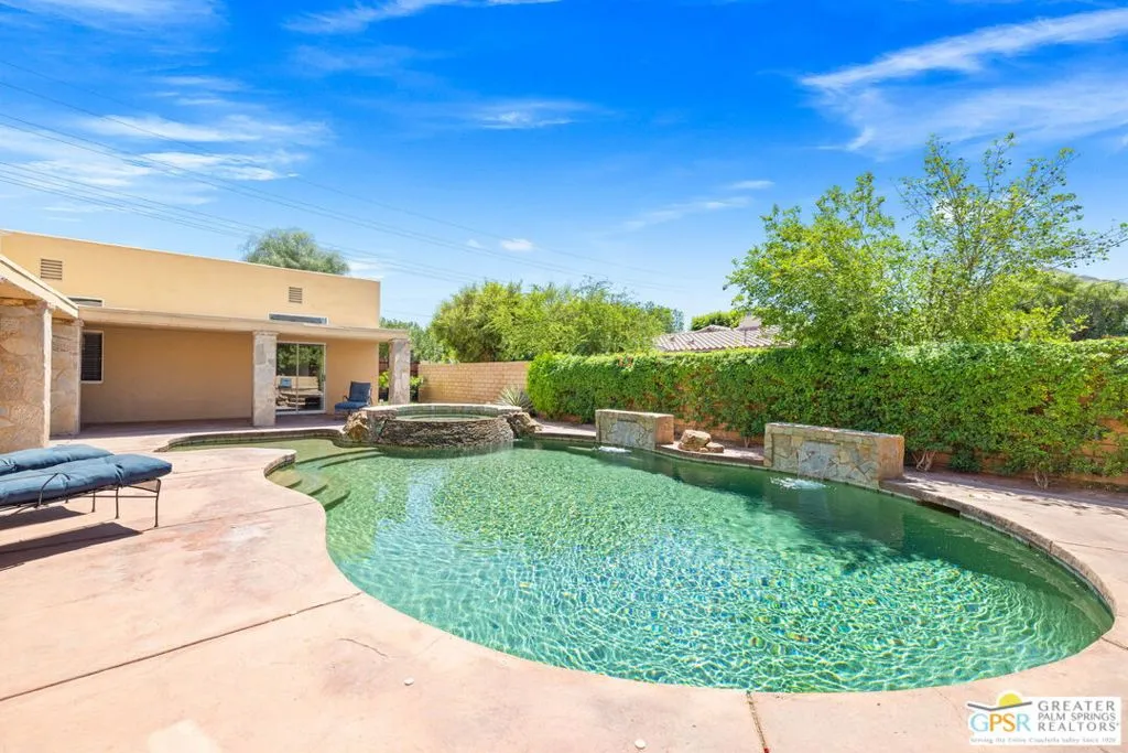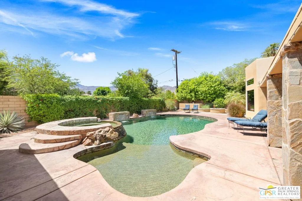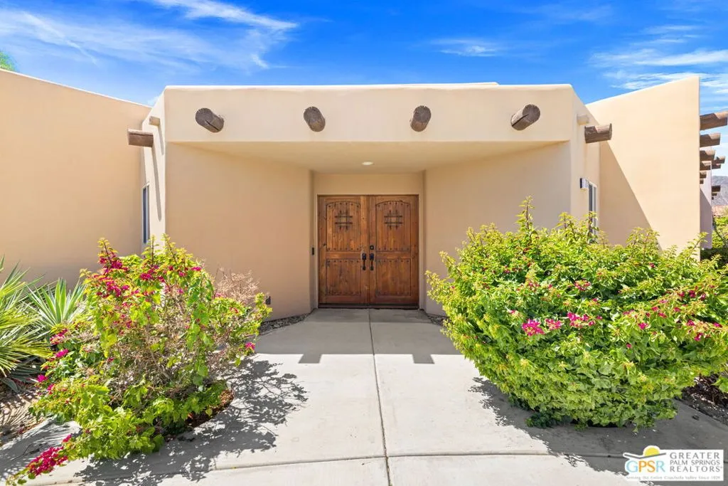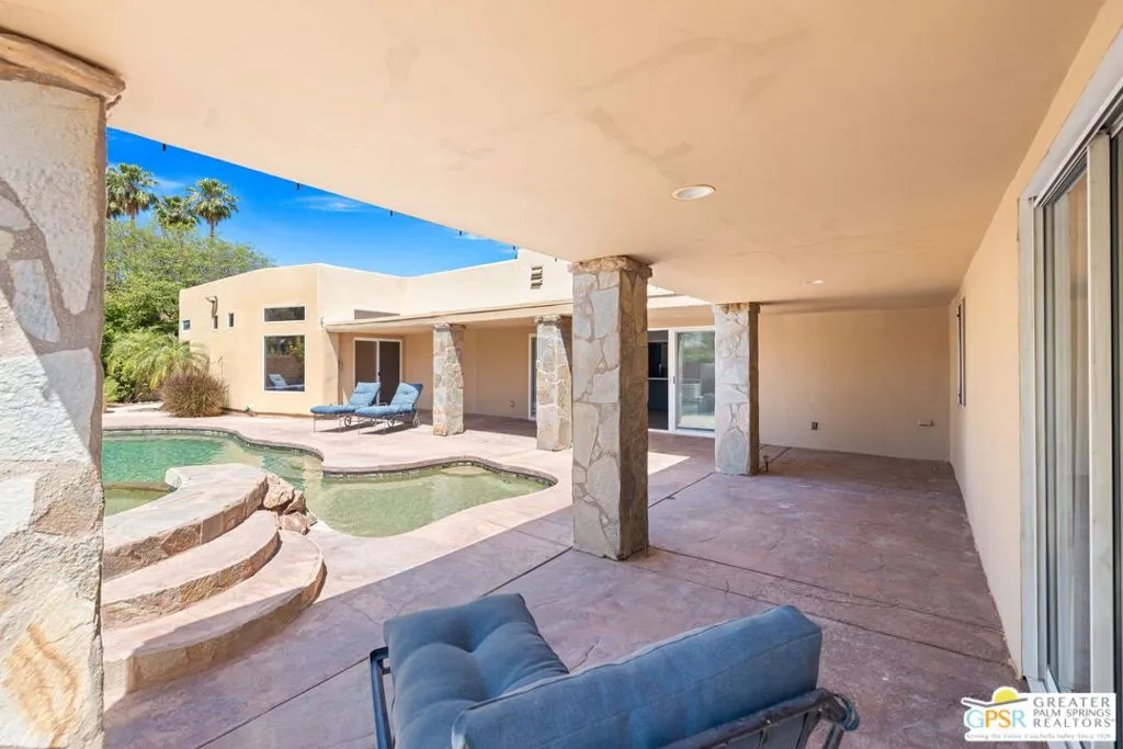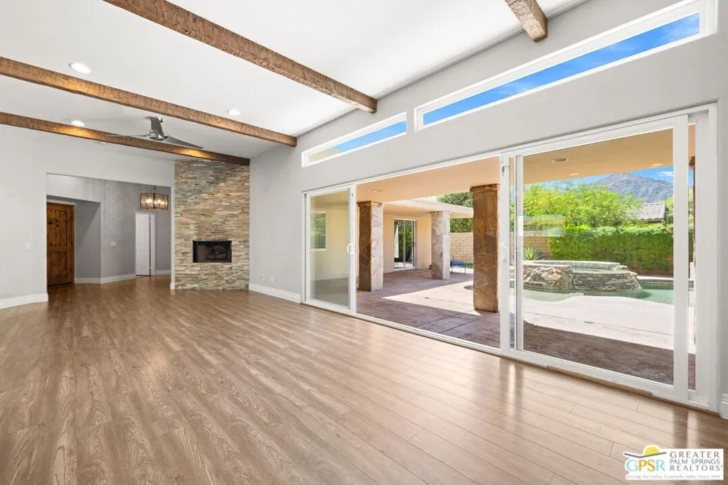 South-facing sunshine and standout style! Set on a generous corner lot in established Desert Club Estates, this stylish single-story delivers Santa Rosa Mountain views and a private resort-style setting with NO HOA. A circular driveway and an earthy exterior with exposed wooden vigas set the tone, while inside, vaulted ceilings with wood beams and clerestory windows elevate the open-concept living spaces with an abundance of natural light. The living room, anchored by a dramatic floor-to-ceiling stacked stone fireplace, flows into an adjacent dining area and opens to the covered patio and pool for that ideal indoor-outdoor lifestyle. The updated kitchen is a showstopper with deep blue cabinetry, quartz waterfall island, white subway tile backsplash, stainless appliances, and a walk-in pantry, all positioned for effortless entertaining. Smart separation of bedrooms includes two primary suites on opposite ends of the home, each with direct outdoor access, plus two additional guest bedrooms served by a full bath and a separate powder bath. Outdoors, the south-facing backyard shines with a PebbleTec pool, elevated spa with stone spillway, and a dramatic covered patio that is a hit for entertaining, along with a built-in fire pit lounge with curved seating and mature landscaping framing those Santa Rosa Mountain views. Three-car garage and circular drive complete the package. Just minutes to Old Town La Quinta, world-class golf, and the Indian Wells Tennis Garden, an ideal full-time, seasonal, or investment opportunity with excellent flexibility.