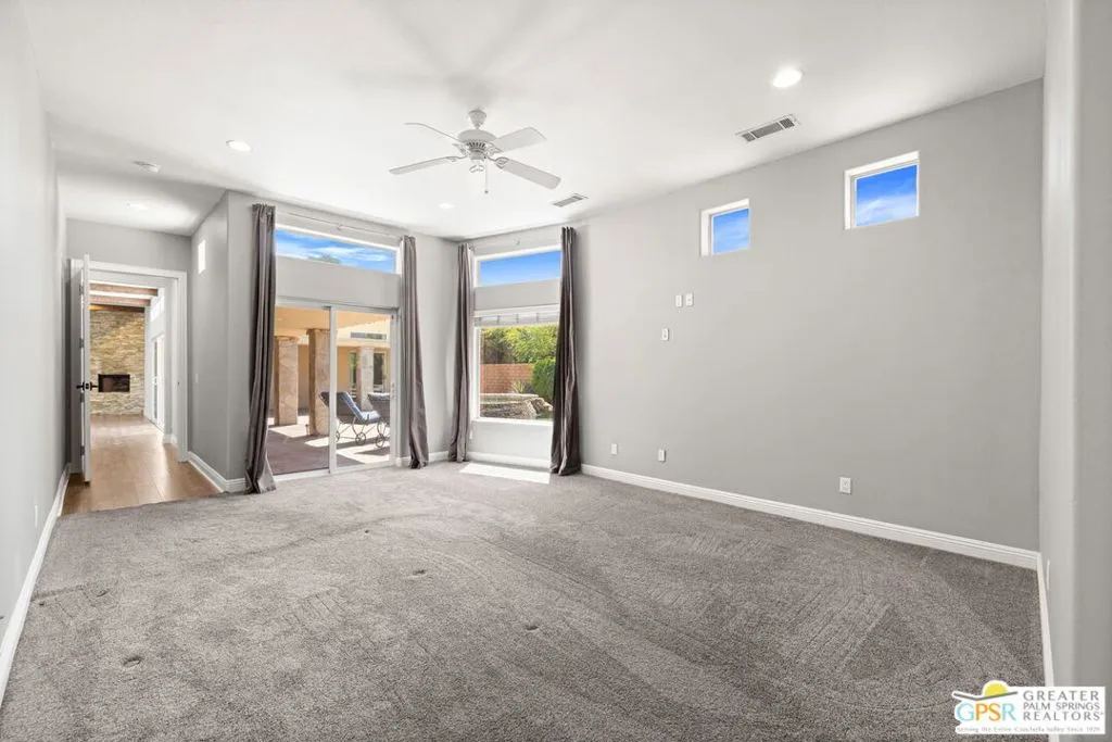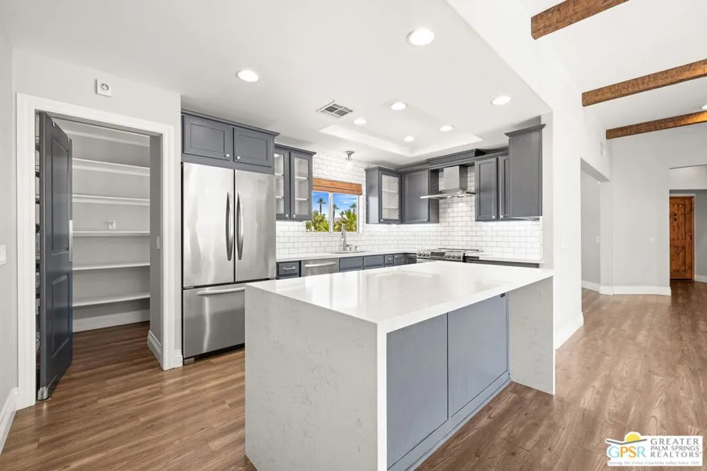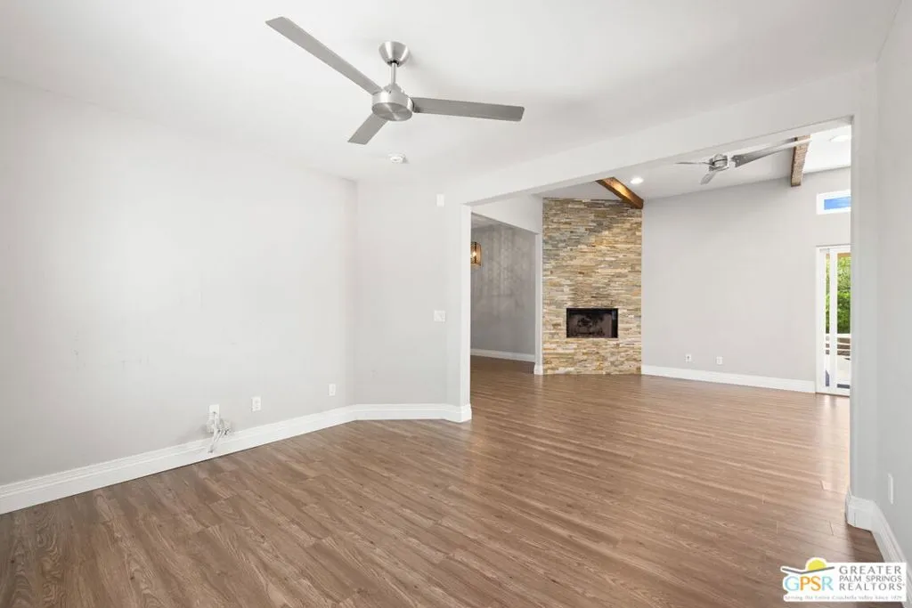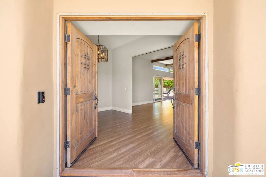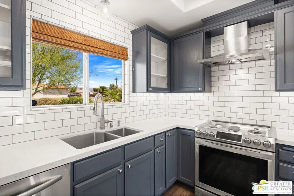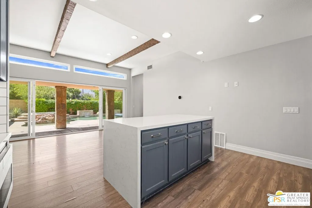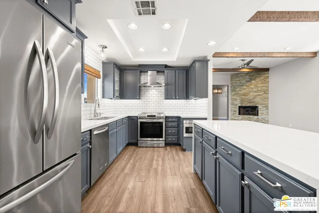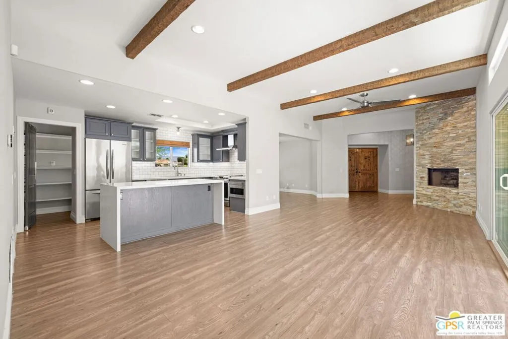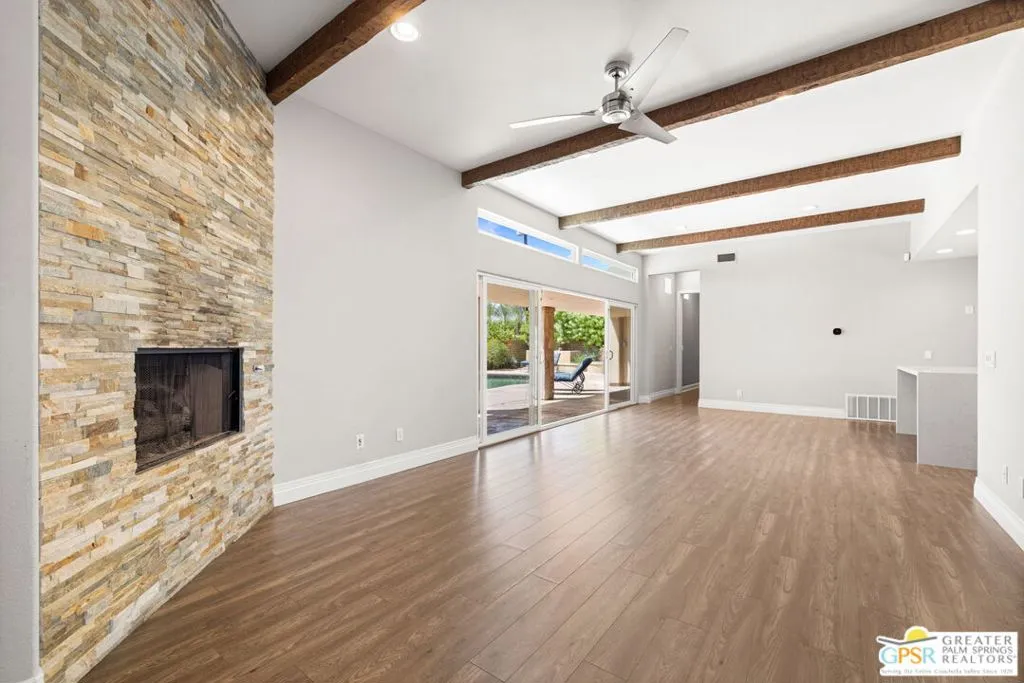 South-facing sunshine and standout style! Set on a generous corner lot in established Desert Club Estates, this stylish single-story delivers Santa Rosa Mountain views and a private resort-style setting with NO HOA. A circular driveway and an earthy exterior with exposed wooden vigas set the tone, while inside, vaulted ceilings with wood beams and clerestory windows elevate the open-concept living spaces with an abundance of natural light. The living room, anchored by a dramatic floor-to-ceiling stacked stone fireplace, flows into an adjacent dining area and opens to the covered patio and pool for that ideal indoor-outdoor lifestyle. The updated kitchen is a showstopper with deep blue cabinetry, quartz waterfall island, white subway tile backsplash, stainless appliances, and a walk-in pantry, all positioned for effortless entertaining. Smart separation of bedrooms includes two primary suites on opposite ends of the home, each with direct outdoor access, plus two additional guest bedrooms served by a full bath and a separate powder bath. Outdoors, the south-facing backyard shines with a PebbleTec pool, elevated spa with stone spillway, and a dramatic covered patio that is a hit for entertaining, along with a built-in fire pit lounge with curved seating and mature landscaping framing those Santa Rosa Mountain views. Three-car garage and circular drive complete the package. Just minutes to Old Town La Quinta, world-class golf, and the Indian Wells Tennis Garden, an ideal full-time, seasonal, or investment opportunity with excellent flexibility.
