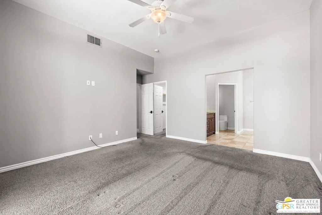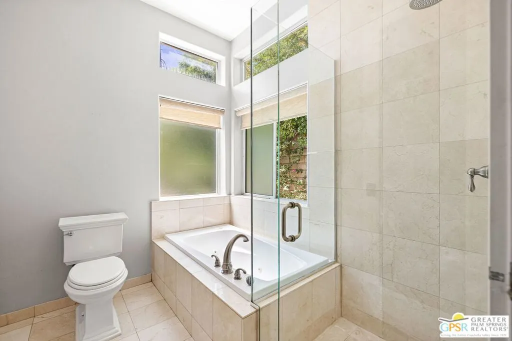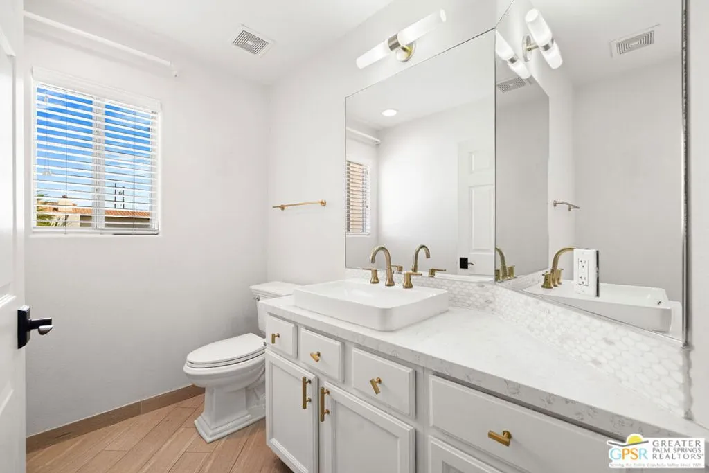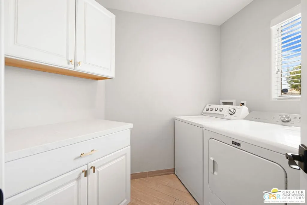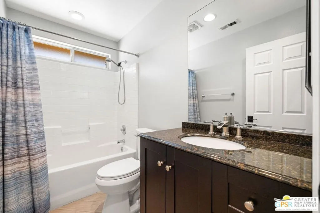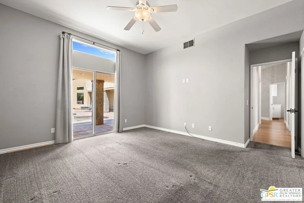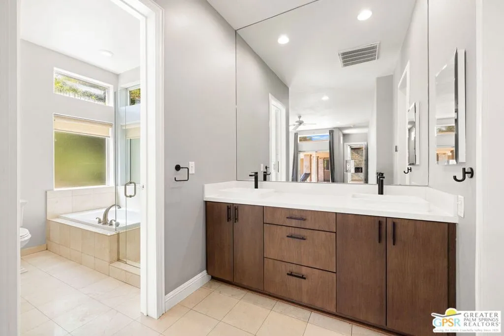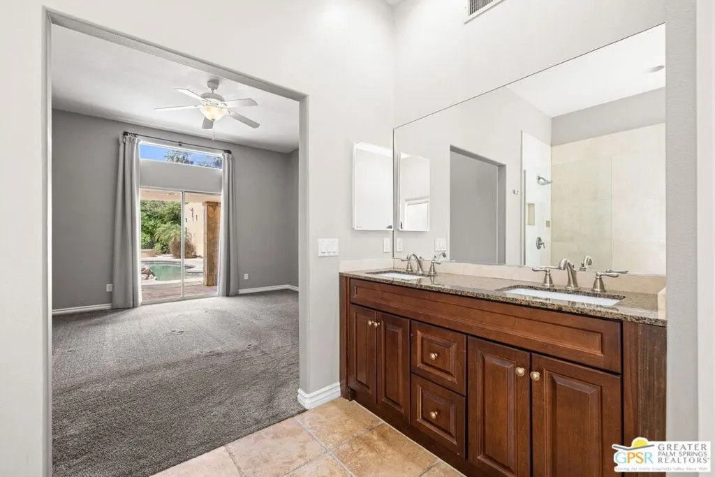 South-facing sunshine and standout style! Set on a generous corner lot in established Desert Club Estates, this stylish single-story delivers Santa Rosa Mountain views and a private resort-style setting with NO HOA. A circular driveway and an earthy exterior with exposed wooden vigas set the tone, while inside, vaulted ceilings with wood beams and clerestory windows elevate the open-concept living spaces with an abundance of natural light. The living room, anchored by a dramatic floor-to-ceiling stacked stone fireplace, flows into an adjacent dining area and opens to the covered patio and pool for that ideal indoor-outdoor lifestyle. The updated kitchen is a showstopper with deep blue cabinetry, quartz waterfall island, white subway tile backsplash, stainless appliances, and a walk-in pantry, all positioned for effortless entertaining. Smart separation of bedrooms includes two primary suites on opposite ends of the home, each with direct outdoor access, plus two additional guest bedrooms served by a full bath and a separate powder bath. Outdoors, the south-facing backyard shines with a PebbleTec pool, elevated spa with stone spillway, and a dramatic covered patio that is a hit for entertaining, along with a built-in fire pit lounge with curved seating and mature landscaping framing those Santa Rosa Mountain views. Three-car garage and circular drive complete the package. Just minutes to Old Town La Quinta, world-class golf, and the Indian Wells Tennis Garden, an ideal full-time, seasonal, or investment opportunity with excellent flexibility.
