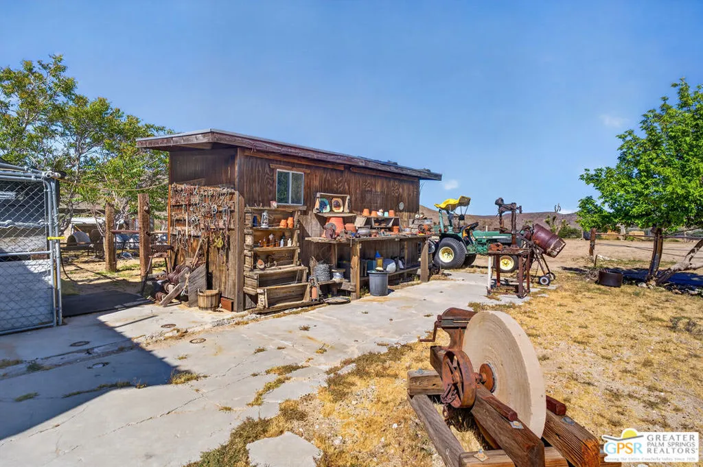 Stud Valley Ranch is a iconic desert property. At the height of Pioneertown's film and television days, Stud Valley Ranch was home to lodging the film crew. It was later a campground and one could camp in their travel trailer and also rent a Jeep from this location to explore the desert. The history of this property is fascinating and well documented. Today, the in-town twenty-six plus acre ranch is home to a living, working Western Cowboy lifestyle with a charming home, a rustic barn and ancillary buildings. The home features a great room with a small library, a den, two bathrooms and a loft. Radiant heat is in the floor and mini-splits provide air conditioning. There is an attached greenhouse that provides passive solar. A recently added bonus room is a multi purpose space. The barn is a large open space with a private room upstairs. It has a 3/4 bath and the kitchen has a 1940's stove and laundry. A small office is a petite building located next to the grape arbor and Koi pond and it's heated with a pot belly stove. Down a winding path one will find the unique pump house that has guest quarters and it's own separate bath house with indoor and outdoor showers. There is a 60' wooden round pen, two large pipe corrals, a large turn out of apx. 1 acre, two shade shelters and a lovely large shade tree for your horses. The land has the most beautiful 360 degree views and mature trees and desert flora. This property is completely private yet located in town. There are two excellent wells. This is an amazing opportunity for one to live in a most desirable location!