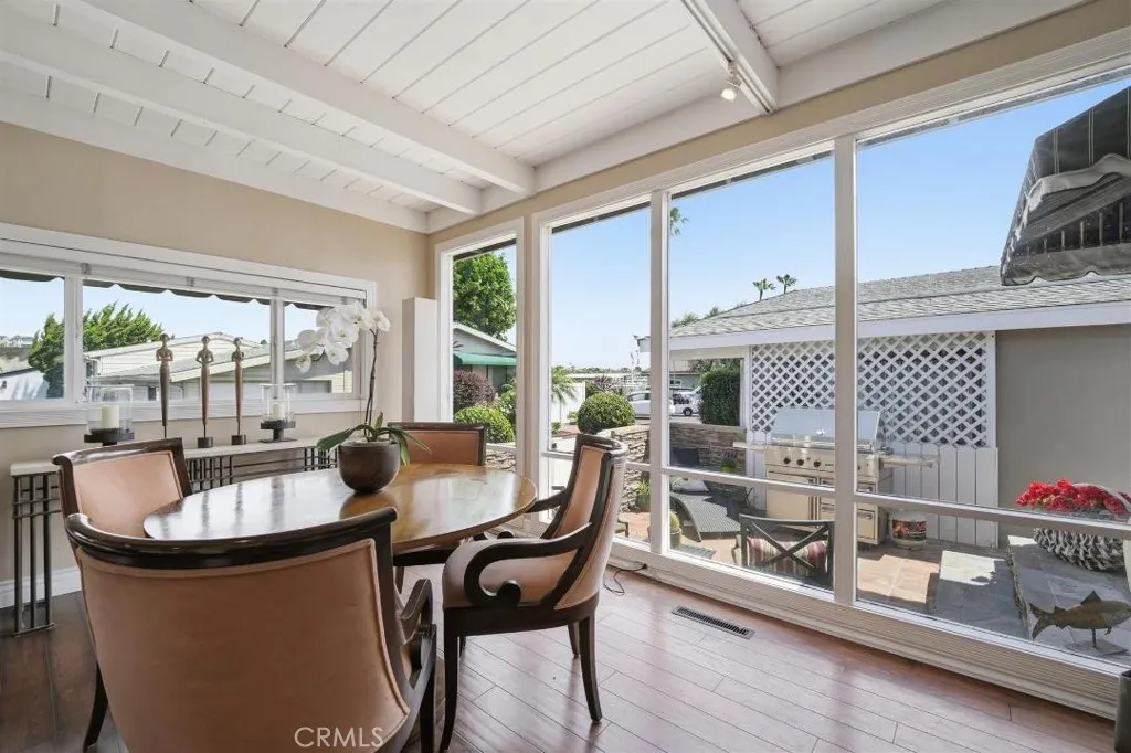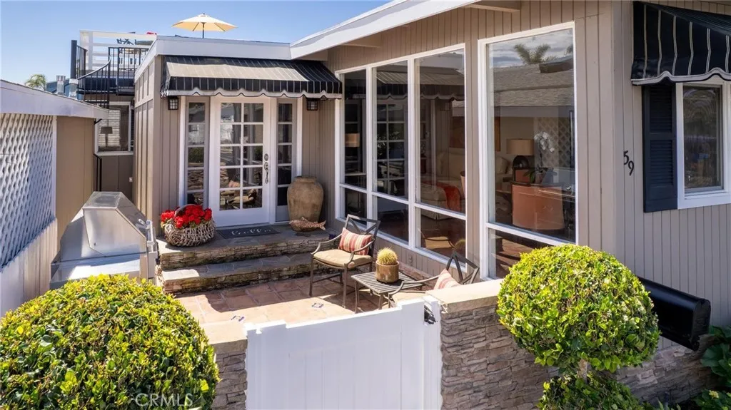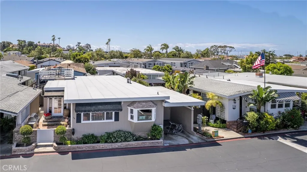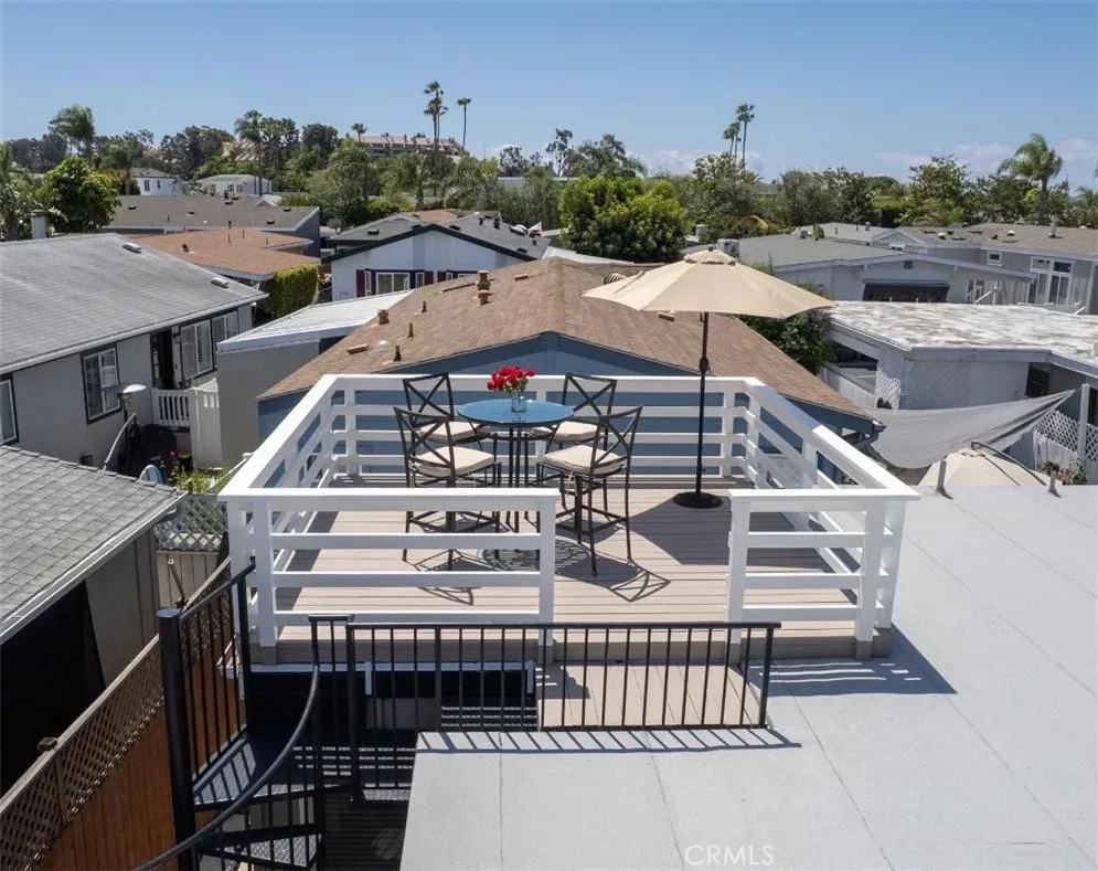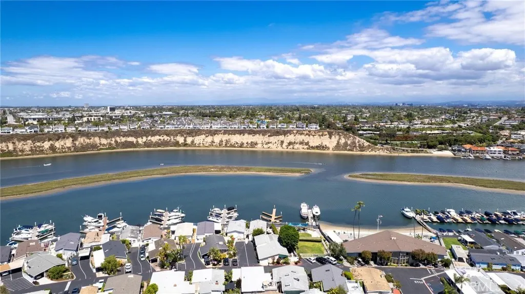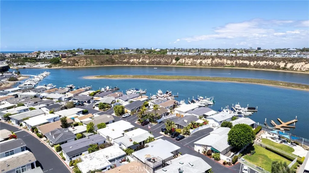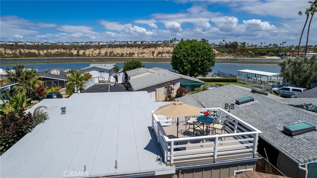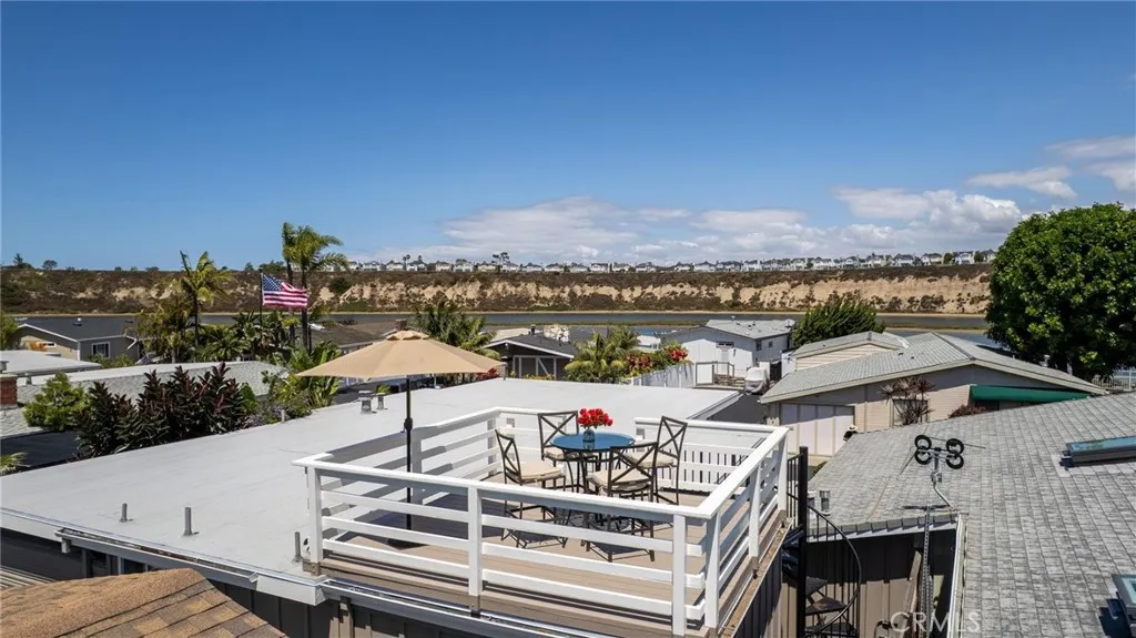 Bayside Village Cabana home! This one has a unique location, third row from the water picking up peak views of the Back bay and Castaways. Newly replaced roof top deck allows for incredible views and space for dining. This 2 bedroom 2 bath transitional style home offers a blend of living spaces. Large kitchen, adjoined by a full dining room area with ceiling to floor windows providing wonderful natural light. Large living room spaces provide for TV and sitting area. Master bedroom gives off a mid century modern vide with large attached bathroom, over sized bathtub and shower. Second bathroom has a separate soaking tub and easy to walk in shower. Other features include: Hardwood floors through out, track lighting, Inside Laundry area, Newly installed wall furnace, new roof installed 4/26, remodeled storage shed. Decretive and mature landscape. This home is located across from the main club house pool/spa, beach and dog park. Bayside Village is Newport's best kept secret and location is a 10. Walk to Balboa Island, Back bay trails and Fashion Island shops and restaurants.