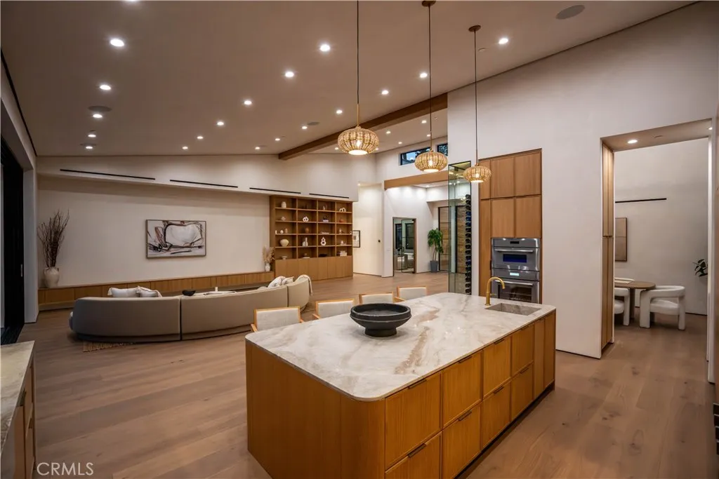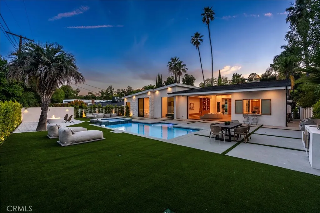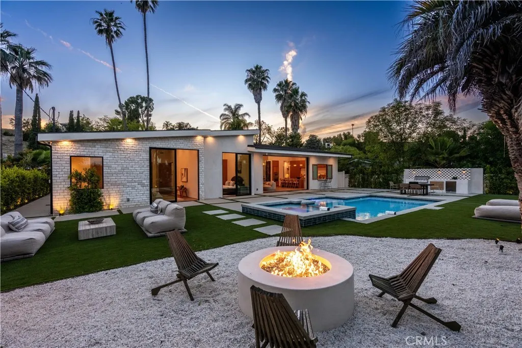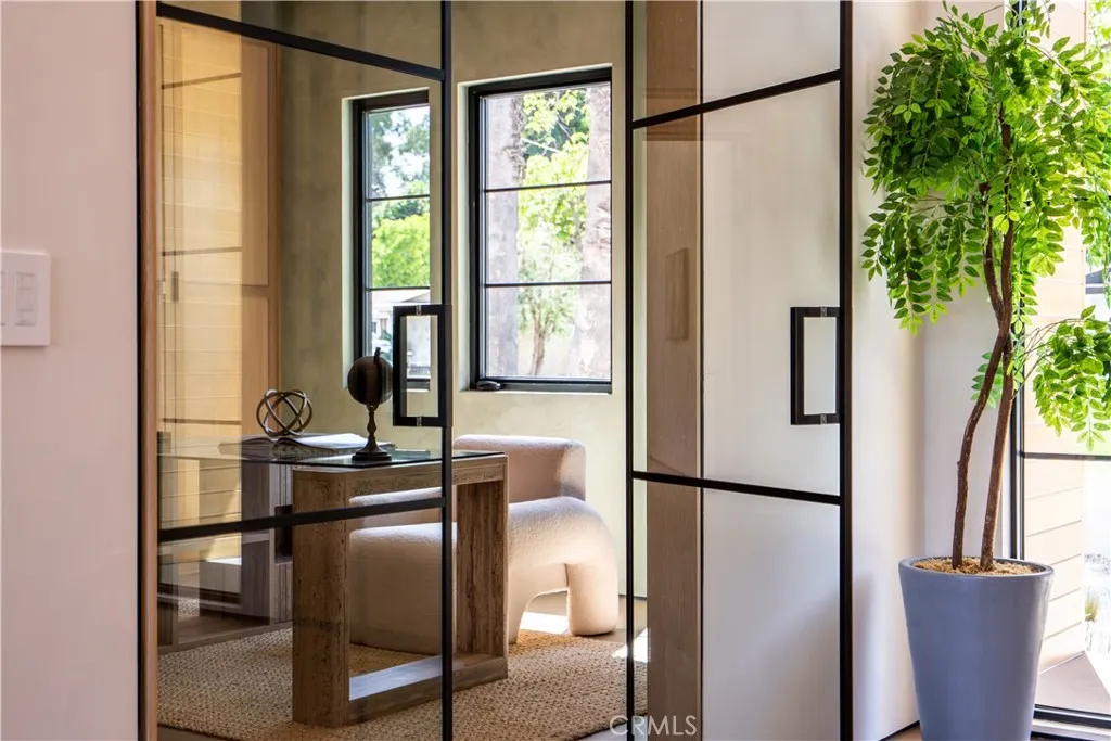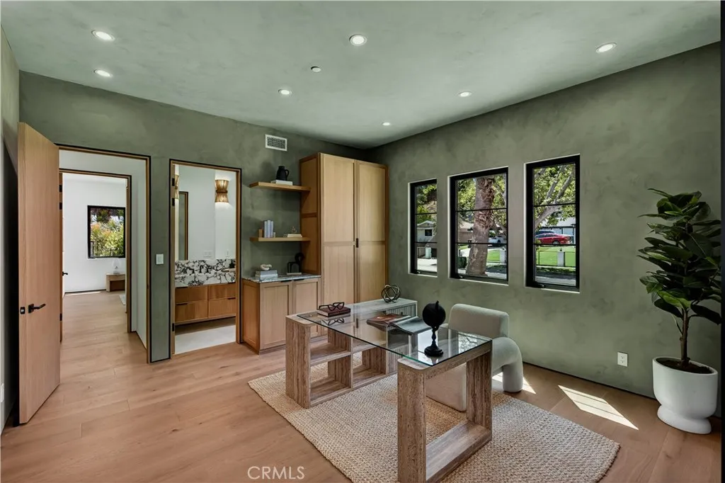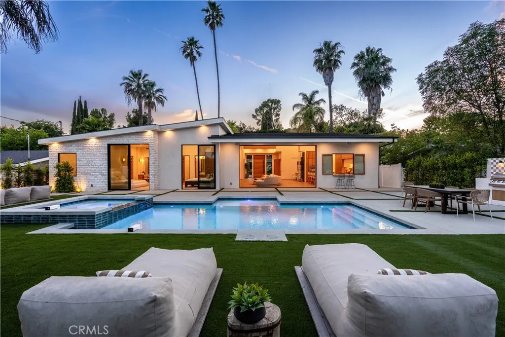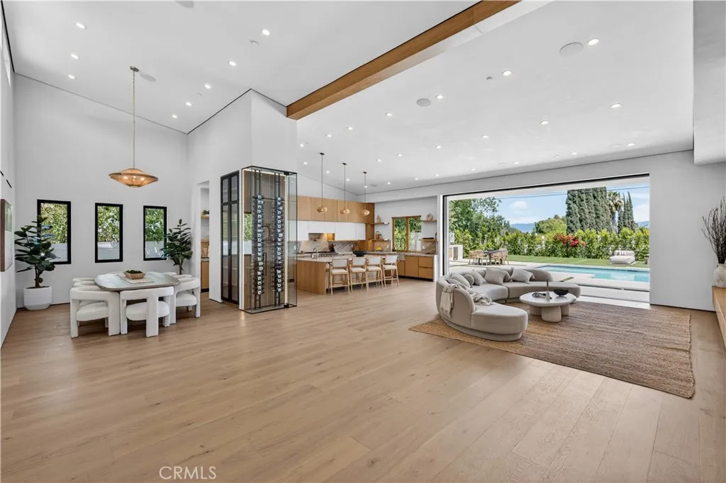 Experience elevated living in this single-story, 5en-suite-bedroom custom reimagined modern masterpiece, set on a large flat lot where design, comfort, and emotion come together in harmony. From the moment you arrive, a sense of calm takes over, an effortless transition into a space defined by light, scale, and intention. Soaring ceilings, exposed beams, near-ceiling windows, and pocket sliding doors invite the outdoors in, filling the home with a soft natural glow that evolves throughout the day. The great living room sets the tone, refined yet welcoming, with textured lime wash walls that add warmth and depth, creating a grounded, serene atmosphere perfect for both quiet mornings and intimate evenings. At the heart of the home, the kitchen and great room serve as a natural gathering place. Taj stone countertops, an oversized island, and Thermador appliances anchor the space, while a stunning glass-enclosed wine room adds a dramatic focal point for everyday living or entertaining. A private office or guest room, wrapped in soft lime wash textures, offers a peaceful retreat for focus and creativity. The primary suite is a true sanctuary with direct outdoor access. The spa-like bath showcases Calacatta countertops and sculptural Kohler fixtures, blending artistry with indulgence. An additional en-suite bedroom also features private outdoor access, offering flexibility for guests or multigenerational living. All five bedrooms are thoughtfully designed with custom closets and refined finishes. Through pocket doors, indoor living opens to a resort-style backyard with a pool, waterfall spa, outdoor kitchen, fire pit, and elevated views, perfect for relaxed evenings and memorable gatherings. With a timeless smooth stucco exterior, this home is more than a residence, it is a feeling, where every detail invites you to live beautifully and with intention.