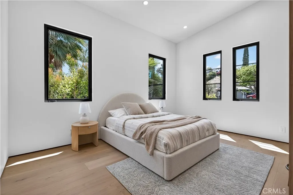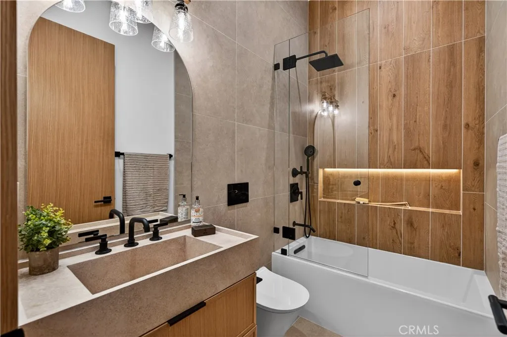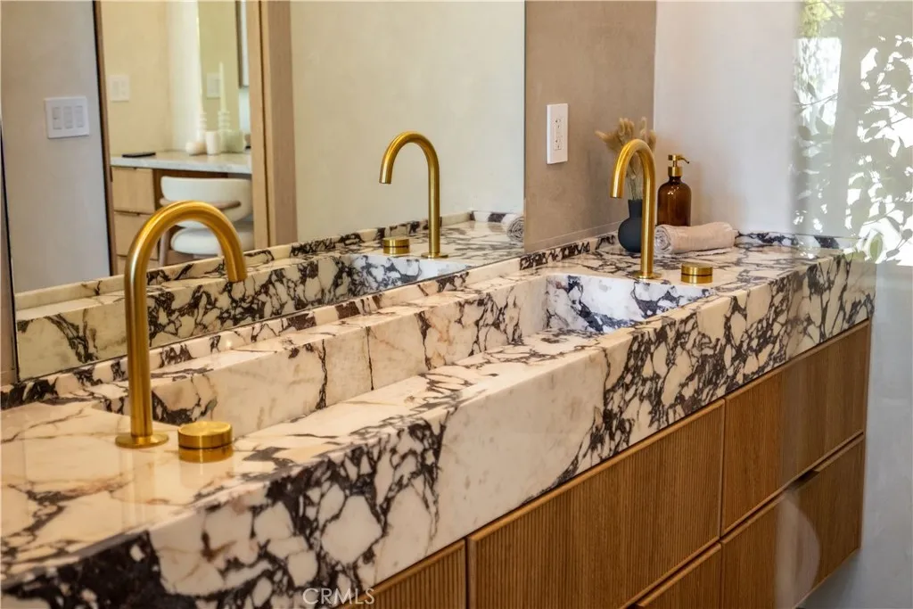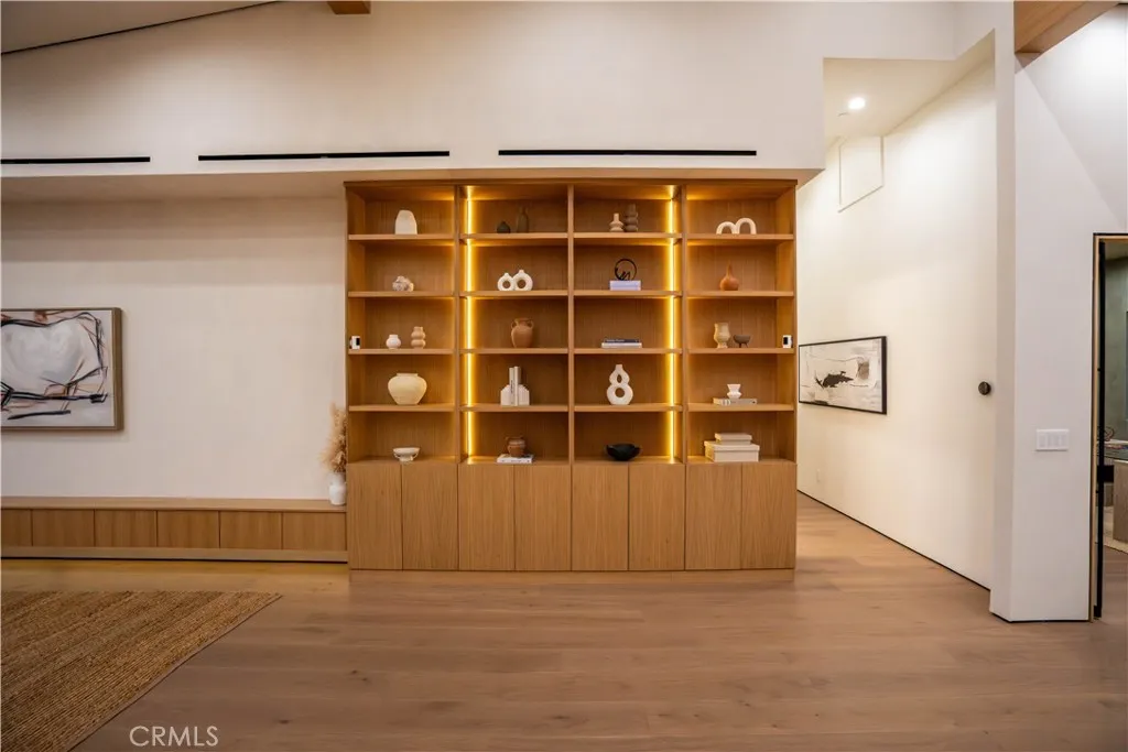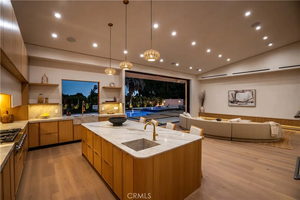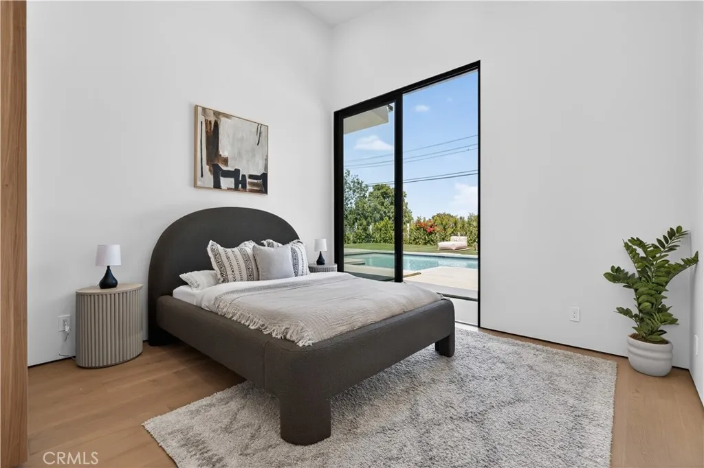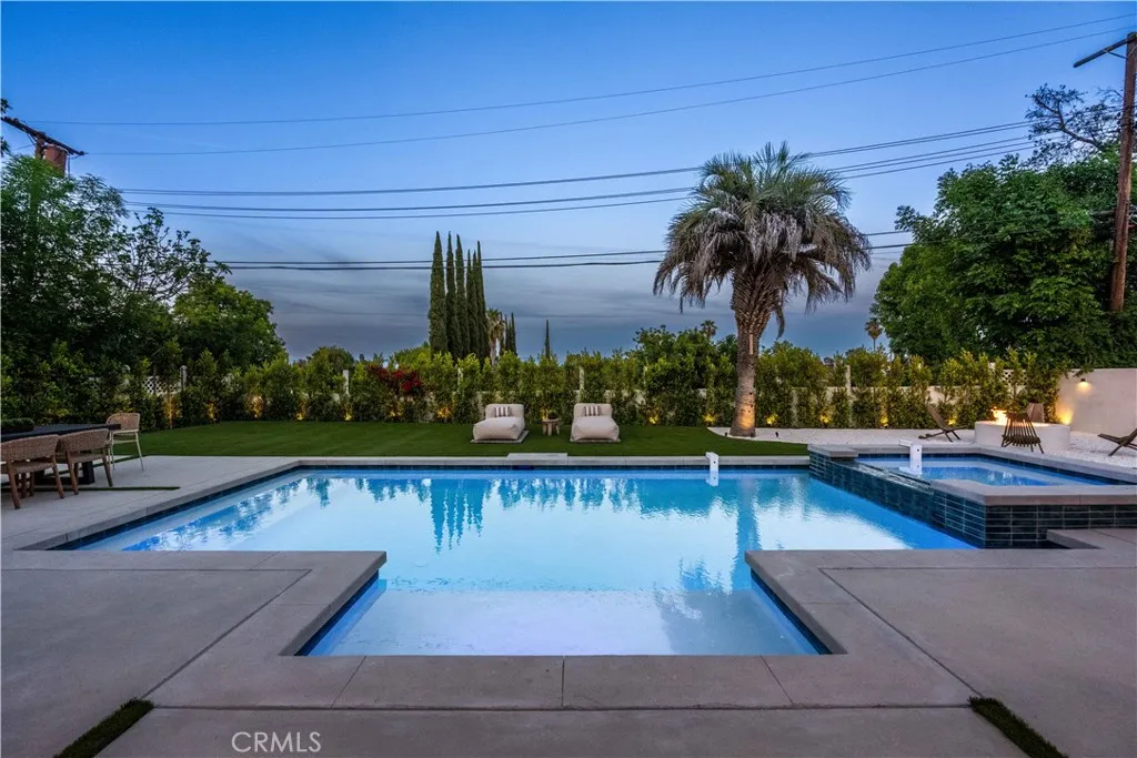 Experience elevated living in this single-story, 5en-suite-bedroom custom reimagined modern masterpiece, set on a large flat lot where design, comfort, and emotion come together in harmony. From the moment you arrive, a sense of calm takes over, an effortless transition into a space defined by light, scale, and intention. Soaring ceilings, exposed beams, near-ceiling windows, and pocket sliding doors invite the outdoors in, filling the home with a soft natural glow that evolves throughout the day. The great living room sets the tone, refined yet welcoming, with textured lime wash walls that add warmth and depth, creating a grounded, serene atmosphere perfect for both quiet mornings and intimate evenings. At the heart of the home, the kitchen and great room serve as a natural gathering place. Taj stone countertops, an oversized island, and Thermador appliances anchor the space, while a stunning glass-enclosed wine room adds a dramatic focal point for everyday living or entertaining. A private office or guest room, wrapped in soft lime wash textures, offers a peaceful retreat for focus and creativity. The primary suite is a true sanctuary with direct outdoor access. The spa-like bath showcases Calacatta countertops and sculptural Kohler fixtures, blending artistry with indulgence. An additional en-suite bedroom also features private outdoor access, offering flexibility for guests or multigenerational living. All five bedrooms are thoughtfully designed with custom closets and refined finishes. Through pocket doors, indoor living opens to a resort-style backyard with a pool, waterfall spa, outdoor kitchen, fire pit, and elevated views, perfect for relaxed evenings and memorable gatherings. With a timeless smooth stucco exterior, this home is more than a residence, it is a feeling, where every detail invites you to live beautifully and with intention.