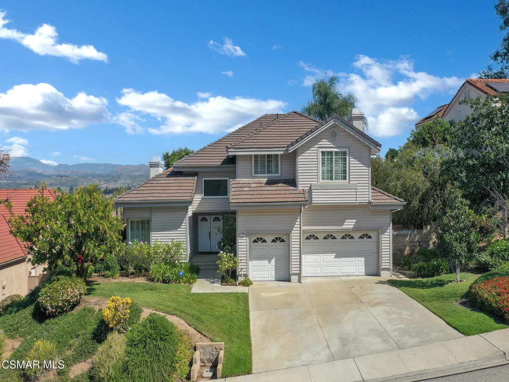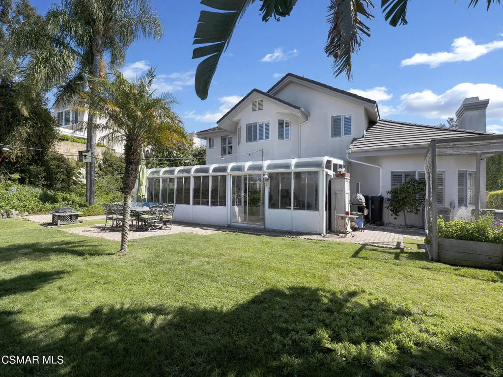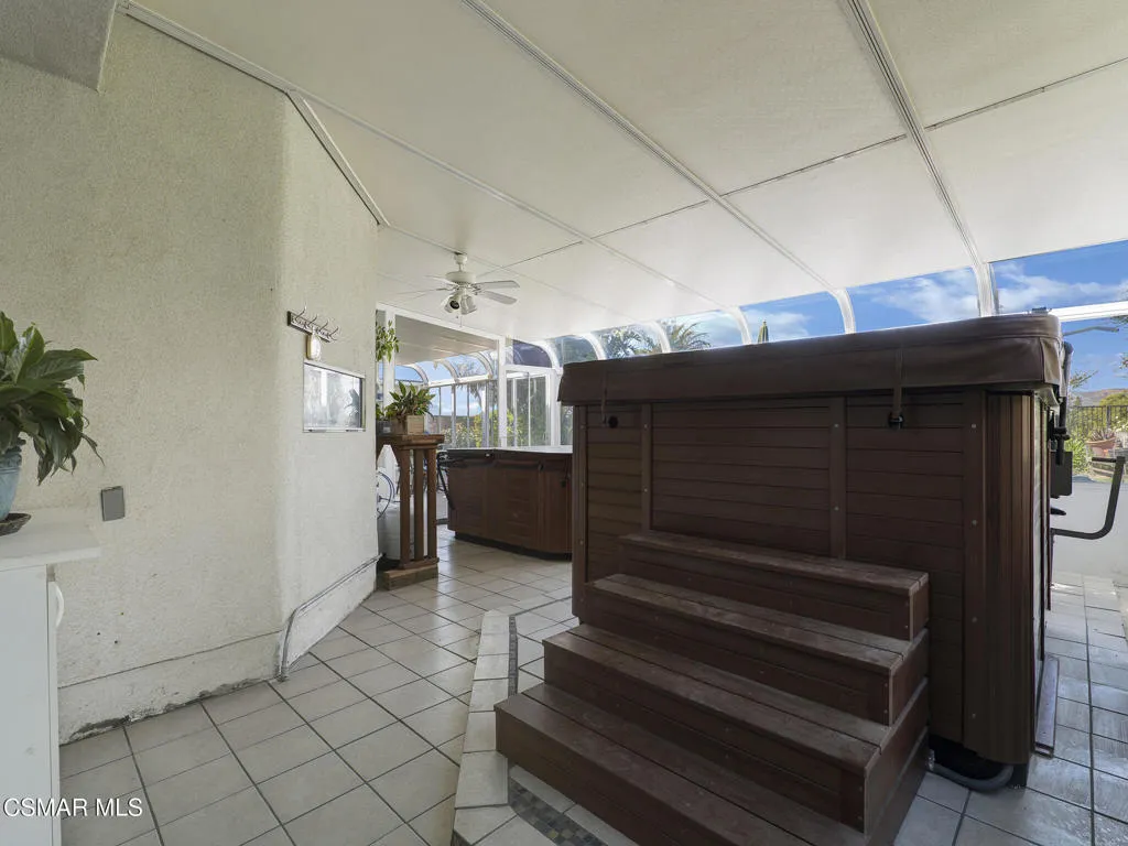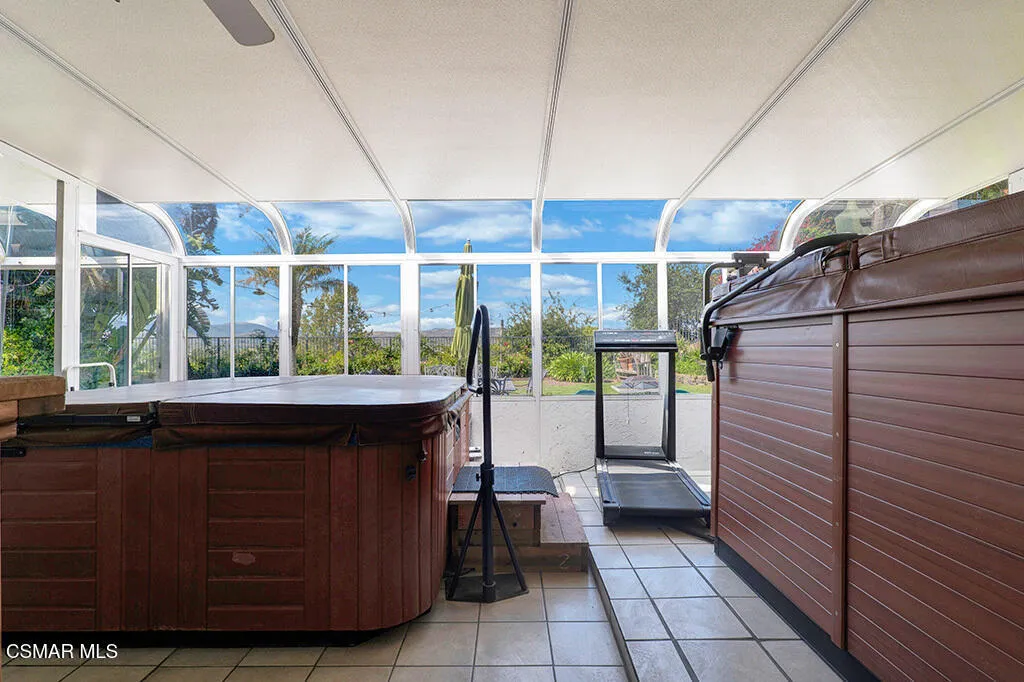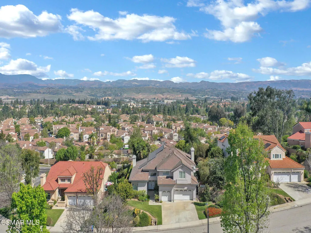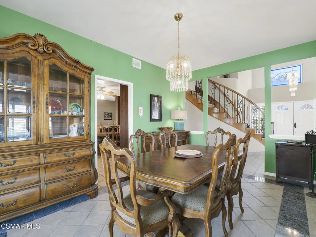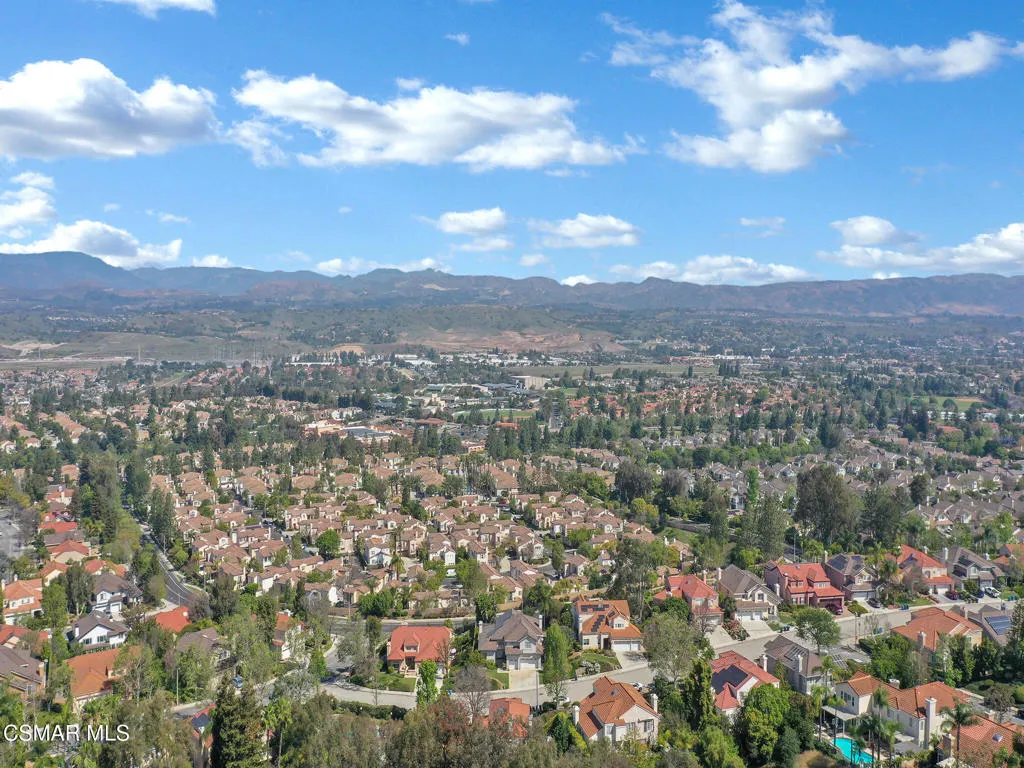 Set within the Buttercreek Estates neighborhood in Moorpark's desirable Mountain Meadows area, this 2-story home offers 5 bedrooms, 4.5 bathrooms, 3,603 sq. ft. of living space on a 13,155 sq. ft. lot, with multiple living areas, a main-level bedroom, and a backyard positioned to showcase views across Moorpark. A landscaped front yard maintained by the HOA, mature rose bushes, and a concrete driveway create a welcoming approach. Double entry doors are framed by a stained-glass window above and a side window, opening to Italian tile flooring with a decorative inlay at the entry, while Italian tile continues through most of the downstairs. Just off the entry, a secondary bedroom with mirrored closet doors and access to a full bathroom offers flexibility for guests, multi-generational living, or a home office. Living and dining areas feature vaulted ceilings, a white gas fireplace, and windows that bring in natural light and backyard views. Italia Murano glass chandeliers are featured at both the entry and dining area, where a half wall defines the dining space with Italian tile flooring, marble inlay, and French doors connecting to the sunroom. Granite countertops and a center island--offering generous storage and a slide-out spice rack--anchor the kitchen, while an L-shaped counter defines the dining nook with a lighted ceiling fan. Separate built-in Viking refrigerator and freezer units sit side-by-side, along with a Viking 6-burner range plus a built-in griddle, double oven, pot filler, built-in ice maker, and newer dishwasher. A farmhouse-style stone sink is positioned beneath windows with stained glass accents on each side, overlooking the sunroom and backyard. A separate prep area includes a slide-out spice rack, a stainless sink, and etched glass cabinetry. Open to the kitchen, the family room features high ceilings, a lighted ceiling fan, and a stone fireplace with a detailed mantle. French doors lead into the fully enclosed sunroom, where tile flooring, surrounding windows, and multiple sliders bring in natural light and connect to the backyard--well-suited for a home gym, office, or additional living space. The sunroom is not included in the listed square footage, yet adds meaningful versatility to the home. Views across Moorpark and the wide-reaching Topatopa Mountains define the backyard setting--also enjoyed from the kitchen sink, offering a peaceful start to the day as the morning sun rises over the hills. Iron fencing lines the rear, with block walls on the sides for added privacy. A covered BBQ area with sink, paver patio, storage shed, and garden boxes are supported by mature landscaping and a 6-zone sprinkler system. Two spa units--one for exercise and one for relaxation--may be included in the sale. Upstairs, a landing connects three secondary bedrooms with mirrored closet doors and lighted ceiling fans. One secondary bedroom includes an en suite bathroom, while the hall bathroom with dual sinks and a tub/shower combination serves the remaining two bedrooms. The primary suite offers a double door entry, sitting area, pitched ceiling, and multiple windows. The en suite bathroom includes a granite vanity with makeup station, soaking tub, glass-enclosed shower, private toilet area, and a walk-in closet. All bathrooms throughout the home have been custom designed. Additional features include paid solar, a tankless water heater, plantation shutters, water filtration system, dual-pane windows with grids, wired for an alarm system, and Ring doorbell. The community pool is conveniently located just across the street, along with close proximity to Tierra Rejada Park, Arroyo Vista schools, and local shopping and dining. The HOA includes access to the association pool, spa, clubhouse, and BBQ area, along with front lawn maintenance and water for the front landscaping.