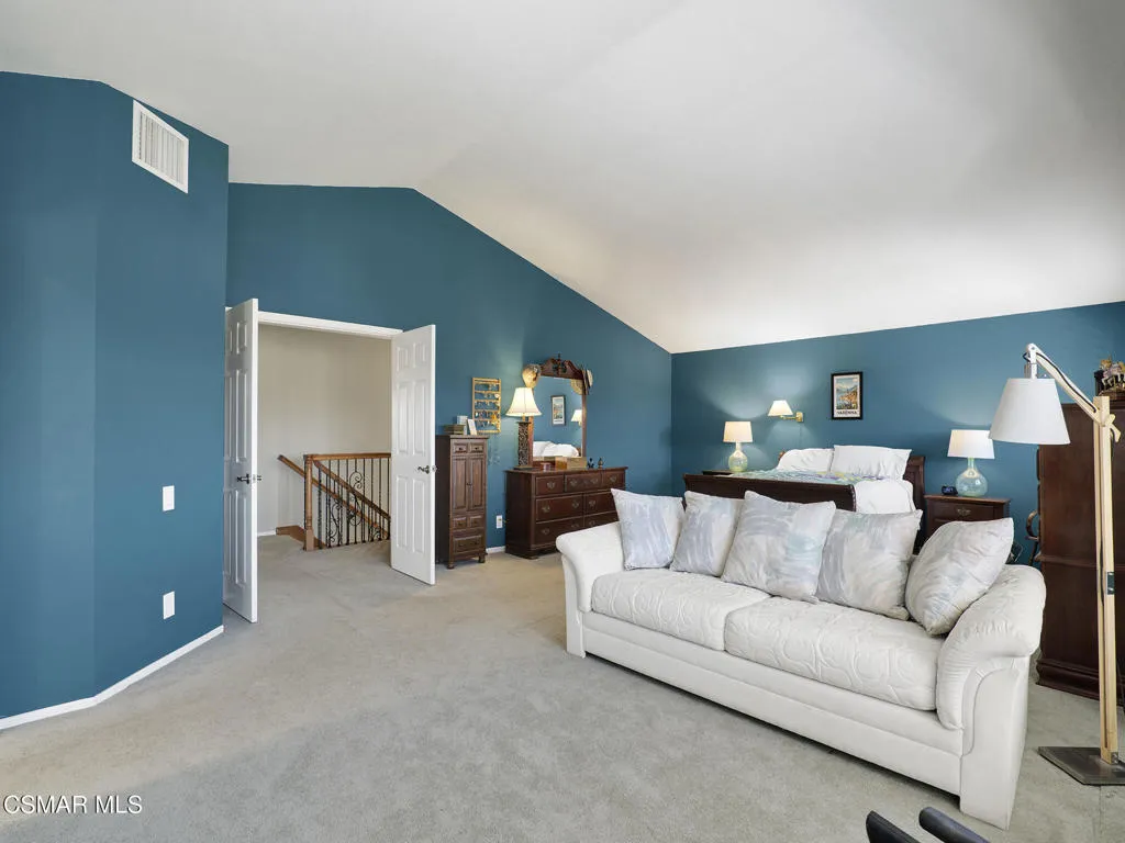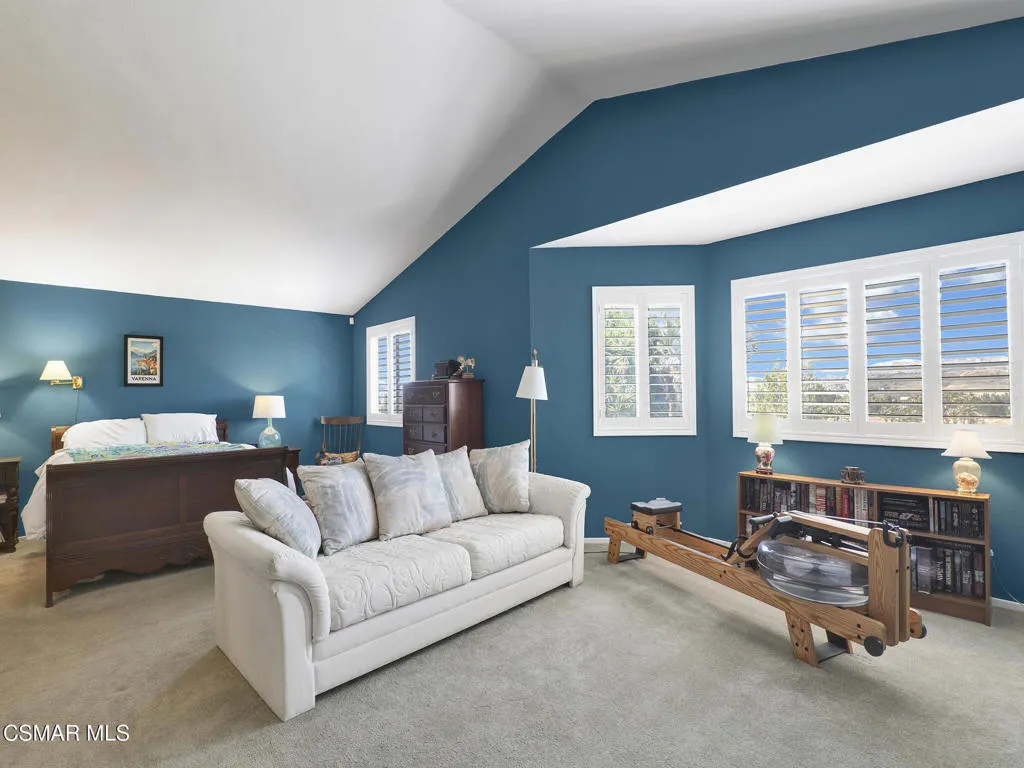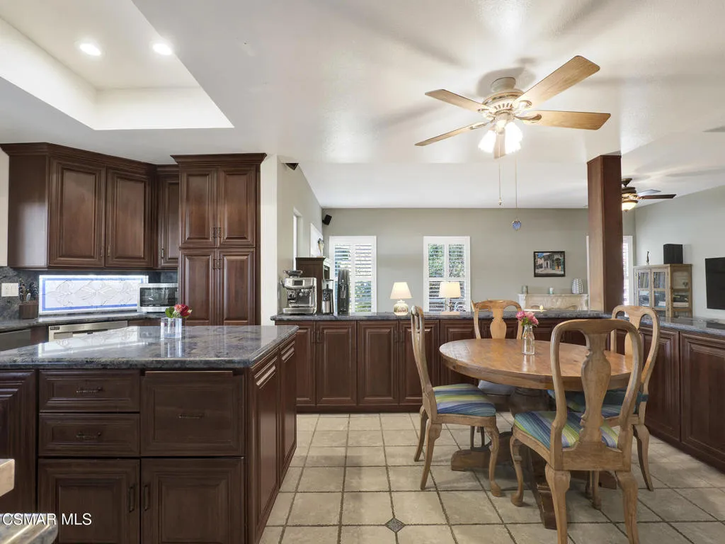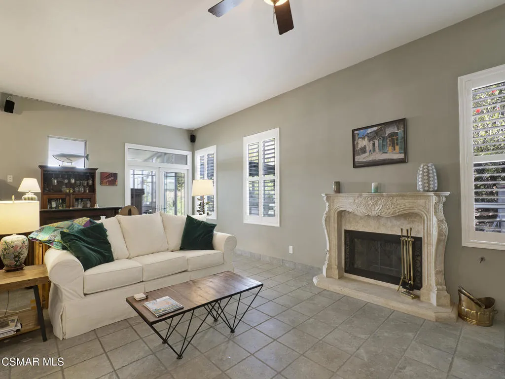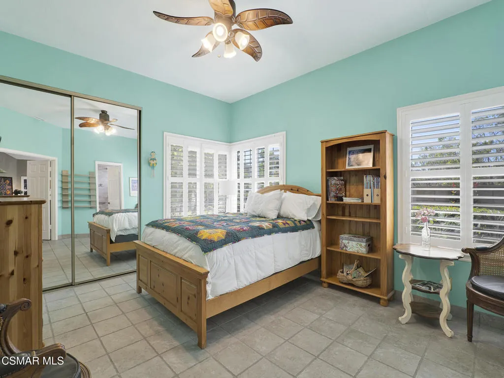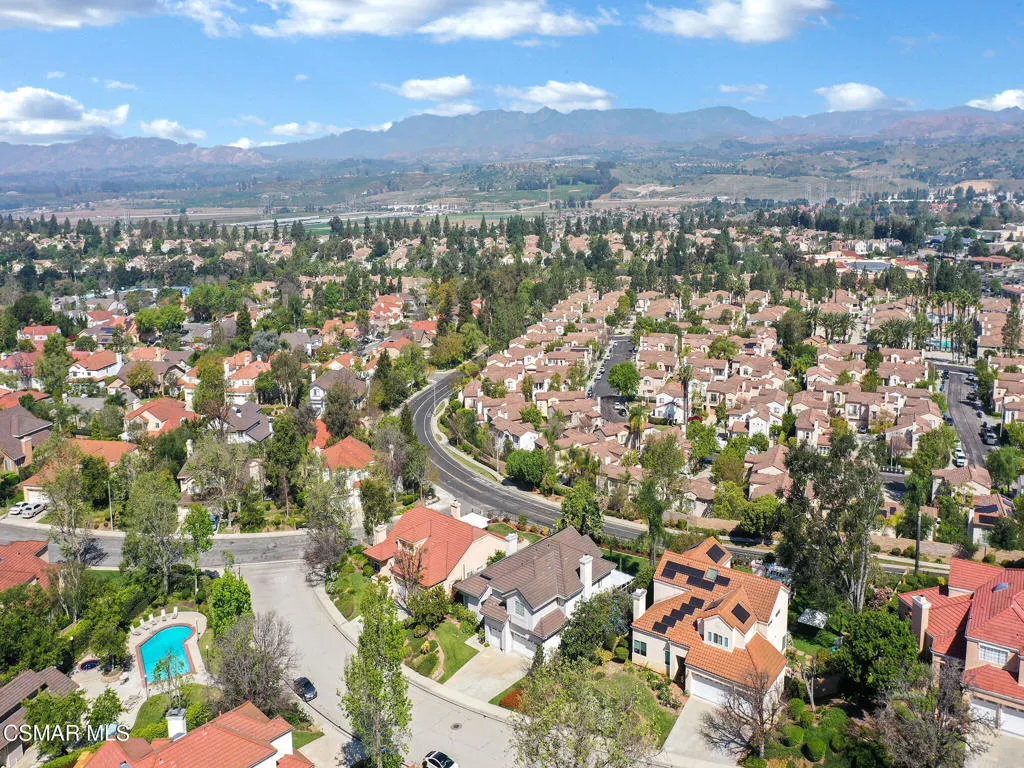 Set within the Buttercreek Estates neighborhood in Moorpark's desirable Mountain Meadows area, this 2-story home offers 5 bedrooms, 4.5 bathrooms, 3,603 sq. ft. of living space on a 13,155 sq. ft. lot, with multiple living areas, a main-level bedroom, and a backyard positioned to showcase views across Moorpark. A landscaped front yard maintained by the HOA, mature rose bushes, and a concrete driveway create a welcoming approach. Double entry doors are framed by a stained-glass window above and a side window, opening to Italian tile flooring with a decorative inlay at the entry, while Italian tile continues through most of the downstairs. Just off the entry, a secondary bedroom with mirrored closet doors and access to a full bathroom offers flexibility for guests, multi-generational living, or a home office. Living and dining areas feature vaulted ceilings, a white gas fireplace, and windows that bring in natural light and backyard views. Italia Murano glass chandeliers are featured at both the entry and dining area, where a half wall defines the dining space with Italian tile flooring, marble inlay, and French doors connecting to the sunroom. Granite countertops and a center island--offering generous storage and a slide-out spice rack--anchor the kitchen, while an L-shaped counter defines the dining nook with a lighted ceiling fan. Separate built-in Viking refrigerator and freezer units sit side-by-side, along with a Viking 6-burner range plus a built-in griddle, double oven, pot filler, built-in ice maker, and newer dishwasher. A farmhouse-style stone sink is positioned beneath windows with stained glass accents on each side, overlooking the sunroom and backyard. A separate prep area includes a slide-out spice rack, a stainless sink, and etched glass cabinetry. Open to the kitchen, the family room features high ceilings, a lighted ceiling fan, and a stone fireplace with a detailed mantle. French doors lead into the fully enclosed sunroom, where tile flooring, surrounding windows, and multiple sliders bring in natural light and connect to the backyard--well-suited for a home gym, office, or additional living space. The sunroom is not included in the listed square footage, yet adds meaningful versatility to the home. Views across Moorpark and the wide-reaching Topatopa Mountains define the backyard setting--also enjoyed from the kitchen sink, offering a peaceful start to the day as the morning sun rises over the hills. Iron fencing lines the rear, with block walls on the sides for added privacy. A covered BBQ area with sink, paver patio, storage shed, and garden boxes are supported by mature landscaping and a 6-zone sprinkler system. Two spa units--one for exercise and one for relaxation--may be included in the sale. Upstairs, a landing connects three secondary bedrooms with mirrored closet doors and lighted ceiling fans. One secondary bedroom includes an en suite bathroom, while the hall bathroom with dual sinks and a tub/shower combination serves the remaining two bedrooms. The primary suite offers a double door entry, sitting area, pitched ceiling, and multiple windows. The en suite bathroom includes a granite vanity with makeup station, soaking tub, glass-enclosed shower, private toilet area, and a walk-in closet. All bathrooms throughout the home have been custom designed. Additional features include paid solar, a tankless water heater, plantation shutters, water filtration system, dual-pane windows with grids, wired for an alarm system, and Ring doorbell. The community pool is conveniently located just across the street, along with close proximity to Tierra Rejada Park, Arroyo Vista schools, and local shopping and dining. The HOA includes access to the association pool, spa, clubhouse, and BBQ area, along with front lawn maintenance and water for the front landscaping.