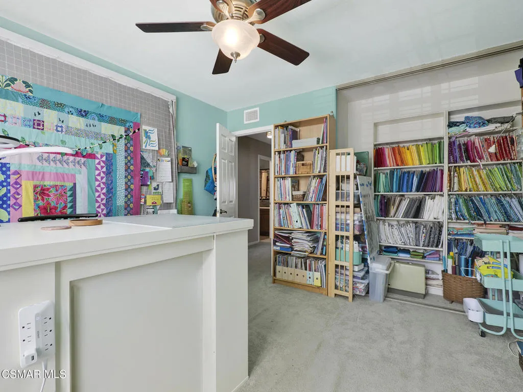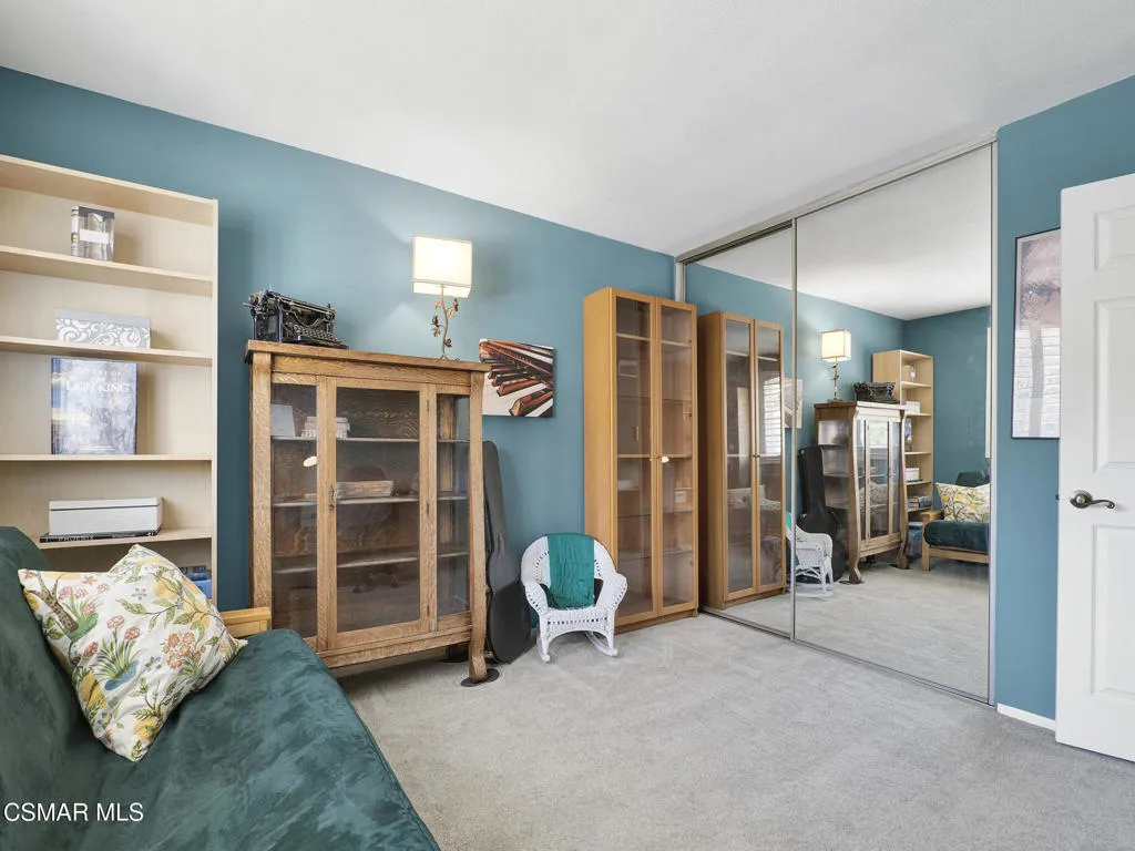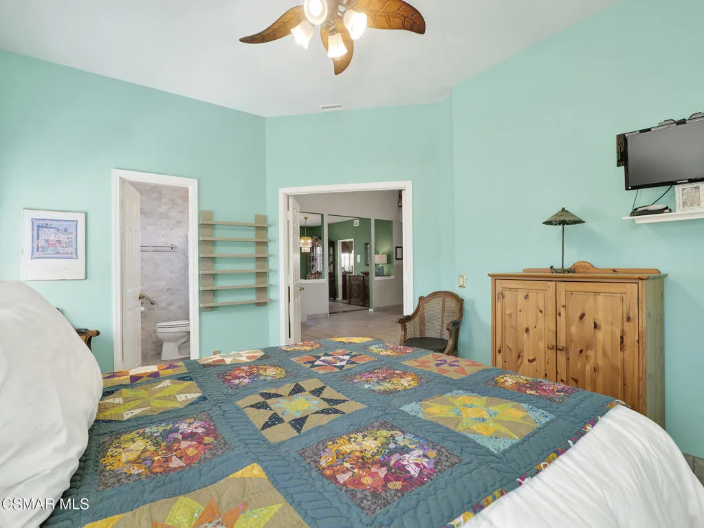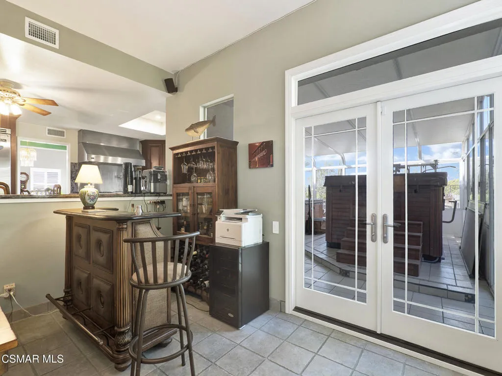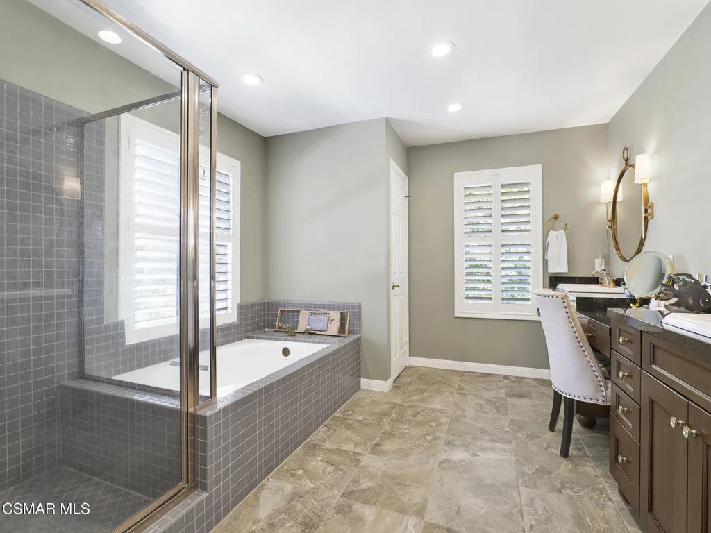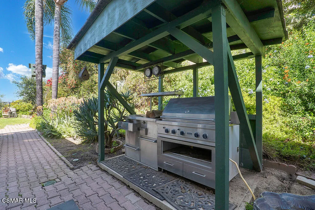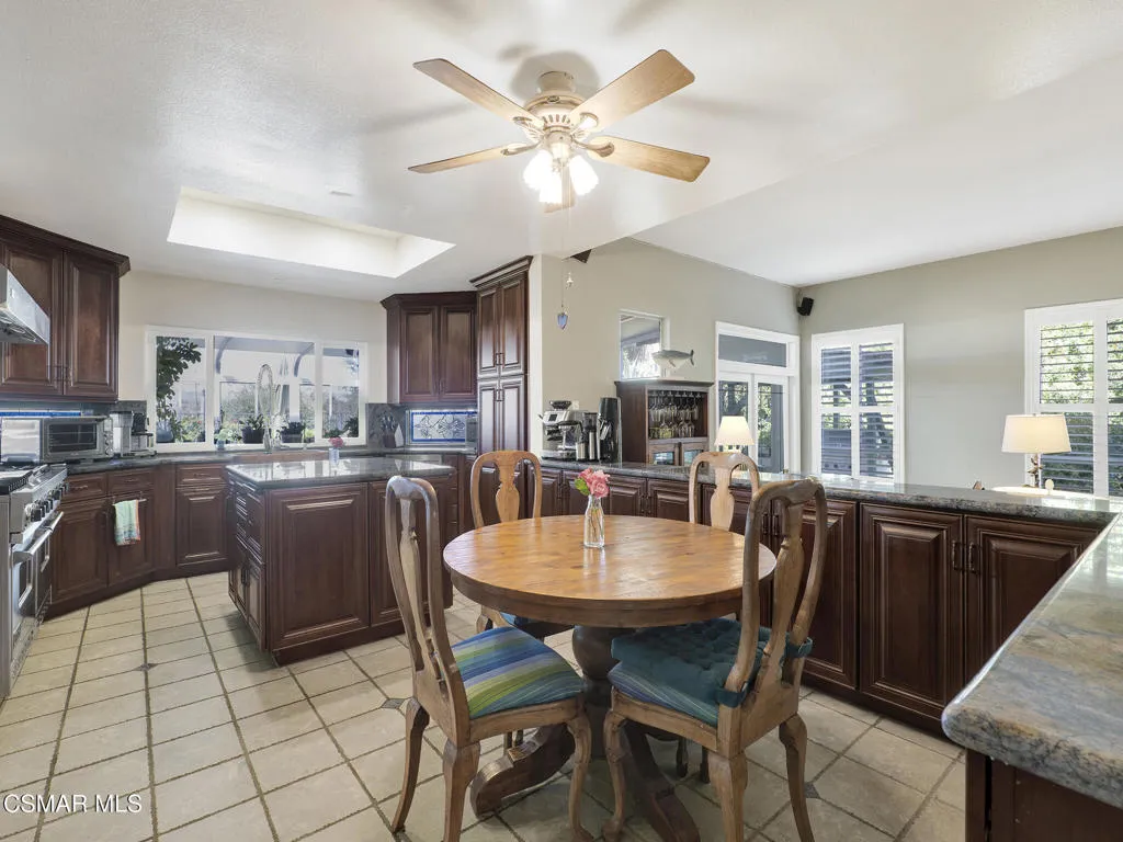 Set within the Buttercreek Estates neighborhood in Moorpark's desirable Mountain Meadows area, this 2-story home offers 5 bedrooms, 4.5 bathrooms, 3,603 sq. ft. of living space on a 13,155 sq. ft. lot, with multiple living areas, a main-level bedroom, and a backyard positioned to showcase views across Moorpark. A landscaped front yard maintained by the HOA, mature rose bushes, and a concrete driveway create a welcoming approach. Double entry doors are framed by a stained-glass window above and a side window, opening to Italian tile flooring with a decorative inlay at the entry, while Italian tile continues through most of the downstairs. Just off the entry, a secondary bedroom with mirrored closet doors and access to a full bathroom offers flexibility for guests, multi-generational living, or a home office. Living and dining areas feature vaulted ceilings, a white gas fireplace, and windows that bring in natural light and backyard views. Italia Murano glass chandeliers are featured at both the entry and dining area, where a half wall defines the dining space with Italian tile flooring, marble inlay, and French doors connecting to the sunroom. Granite countertops and a center island--offering generous storage and a slide-out spice rack--anchor the kitchen, while an L-shaped counter defines the dining nook with a lighted ceiling fan. Separate built-in Viking refrigerator and freezer units sit side-by-side, along with a Viking 6-burner range plus a built-in griddle, double oven, pot filler, built-in ice maker, and newer dishwasher. A farmhouse-style stone sink is positioned beneath windows with stained glass accents on each side, overlooking the sunroom and backyard. A separate prep area includes a slide-out spice rack, a stainless sink, and etched glass cabinetry. Open to the kitchen, the family room features high ceilings, a lighted ceiling fan, and a stone fireplace with a detailed mantle. French doors lead into the fully enclosed sunroom, where tile flooring, surrounding windows, and multiple sliders bring in natural light and connect to the backyard--well-suited for a home gym, office, or additional living space. The sunroom is not included in the listed square footage, yet adds meaningful versatility to the home. Views across Moorpark and the wide-reaching Topatopa Mountains define the backyard setting--also enjoyed from the kitchen sink, offering a peaceful start to the day as the morning sun rises over the hills. Iron fencing lines the rear, with block walls on the sides for added privacy. A covered BBQ area with sink, paver patio, storage shed, and garden boxes are supported by mature landscaping and a 6-zone sprinkler system. Two spa units--one for exercise and one for relaxation--may be included in the sale. Upstairs, a landing connects three secondary bedrooms with mirrored closet doors and lighted ceiling fans. One secondary bedroom includes an en suite bathroom, while the hall bathroom with dual sinks and a tub/shower combination serves the remaining two bedrooms. The primary suite offers a double door entry, sitting area, pitched ceiling, and multiple windows. The en suite bathroom includes a granite vanity with makeup station, soaking tub, glass-enclosed shower, private toilet area, and a walk-in closet. All bathrooms throughout the home have been custom designed. Additional features include paid solar, a tankless water heater, plantation shutters, water filtration system, dual-pane windows with grids, wired for an alarm system, and Ring doorbell. The community pool is conveniently located just across the street, along with close proximity to Tierra Rejada Park, Arroyo Vista schools, and local shopping and dining. The HOA includes access to the association pool, spa, clubhouse, and BBQ area, along with front lawn maintenance and water for the front landscaping.