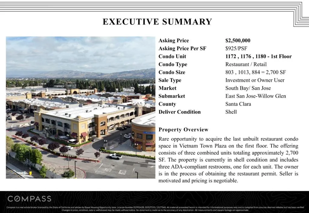 Rare opportunity to acquire the last unbuilt restaurant condo space in Vietnam Town Plaza on the first floor. The offering consists of three combined units (1172, 1176, 1180) totaling approximately 2,700 SF. The property is currently in shell condition and includes three ADA-compliant restrooms, one for each unit. The owner is in the process of obtaining the restaurant permit.