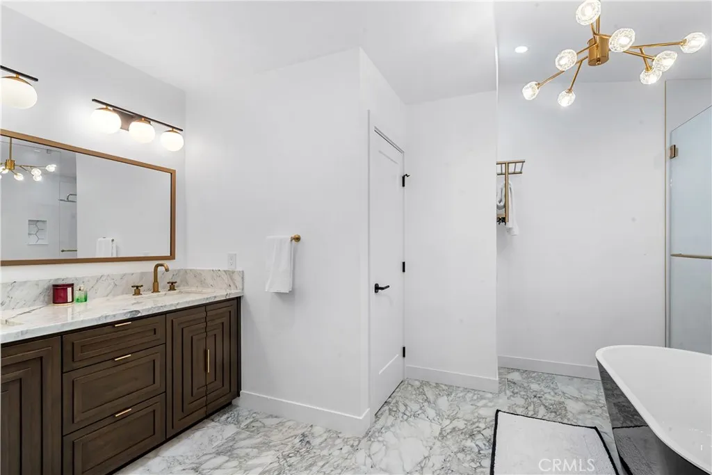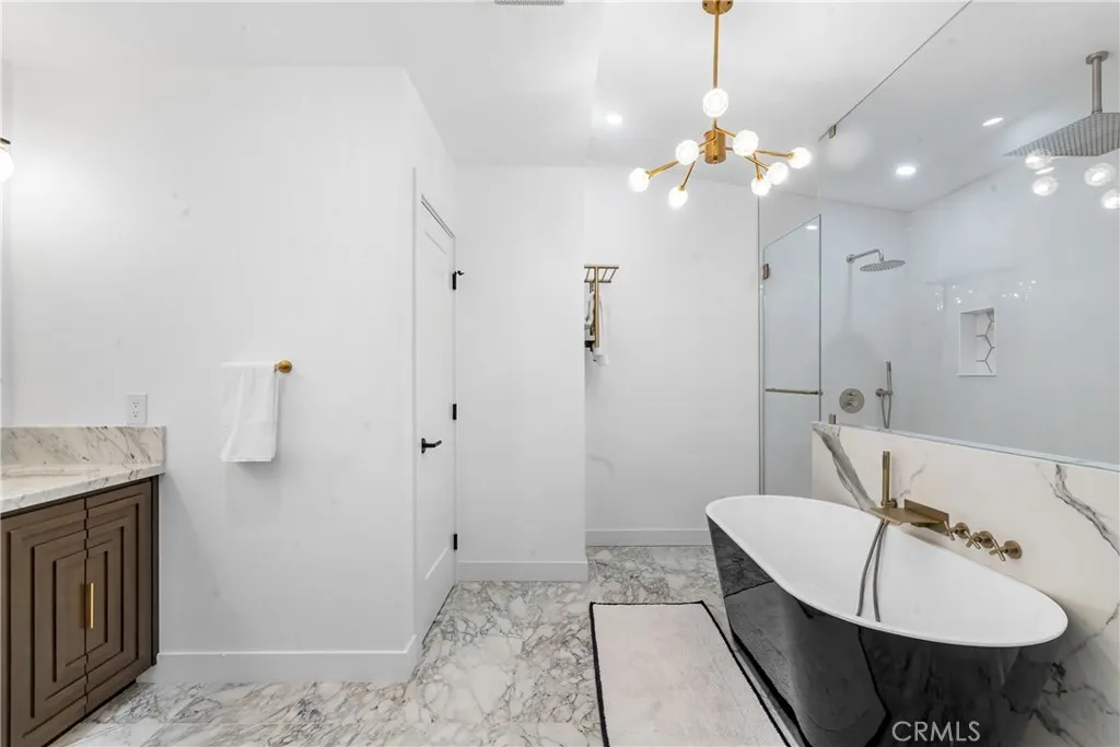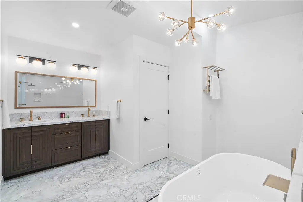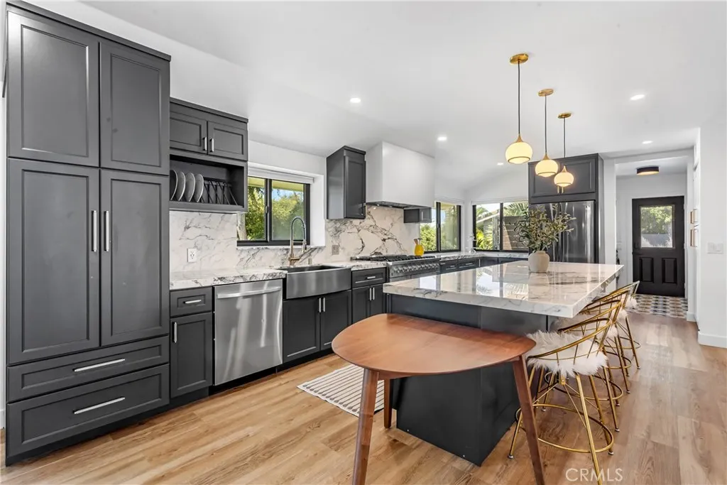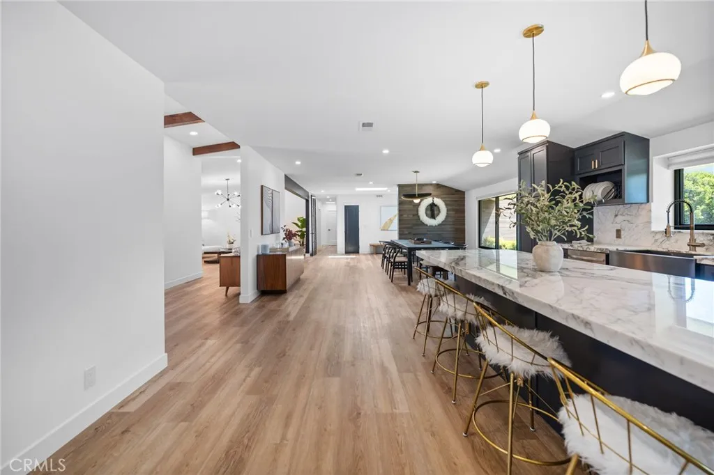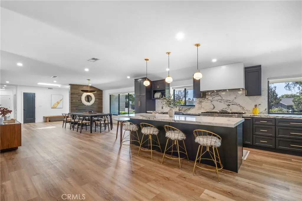 This reimagined residence offers a refined living experience in North Tustin, one of Orange County’s most established communities. The location provides a rare balance of convenience and lifestyle, situated just five minutes from Fairmont Private School and within the award-winning Tustin Unified School District, with nearby access to Peters Canyon regional trails and local international dining. The interior is defined by an open, light-filled floor plan characterized by beamed wood ceilings and extensive marble finishes. A central kitchen—anchored by an oversized island, 48" premium range, and integrated Viking refrigeration—serves as the functional heart of the home, connecting seamlessly to the dining and living areas. Secondary spaces, including a pantry and laundry room with custom tilework and dedicated storage, emphasize a focus on everyday utility. The primary suite is designed for privacy and scale, featuring a custom-built dressing area with his and her closets and a make-up vanity. A marble-finished en-suite equipped with a multi-head oversized walk-in shower and standalone tub. Additional bedrooms offer generous proportions, accented by individualized built-ins and bay windows. Set on a 14,000-square-foot lot, the grounds include stone-paved patios, a resort-style pool, and a detached exercise room. The lawn area is thoughtfully positioned for future RV access. An oversized, drywalled garage with cathedral ceilings adds significant utility to the property or a possible ADU for extended living. This home is a thorough exercise in quality and detail; we invite your most discerning clients to experience the craftsmanship firsthand.