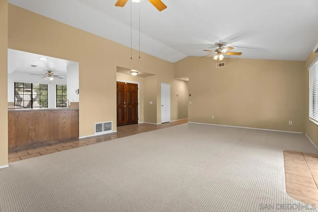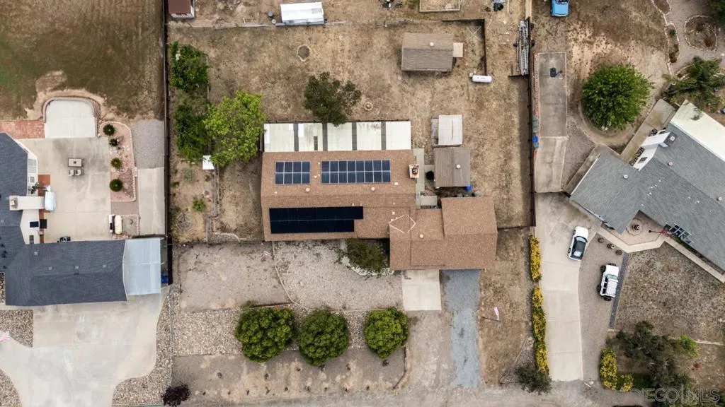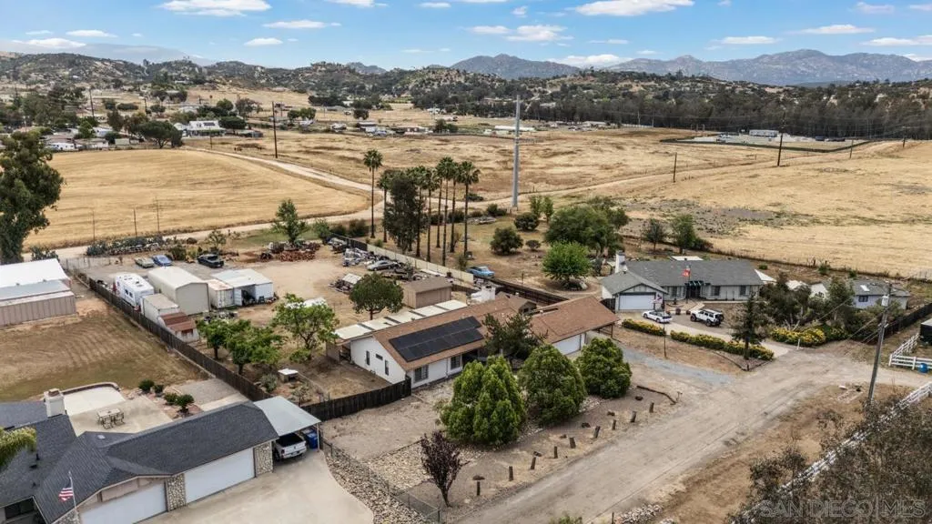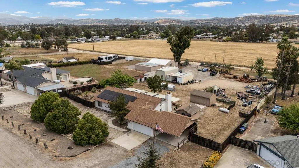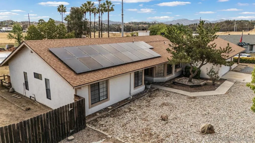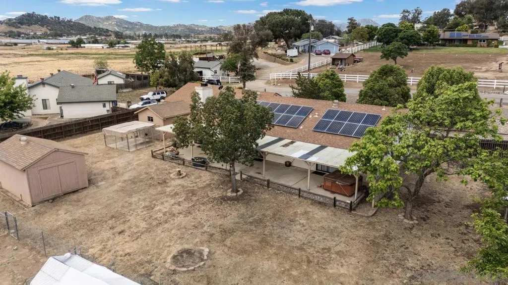 Located in the Heart of Ramona, close to Elementary, Middle and High Schools. This 3 bed, 2 bath country ranch-style home sits on 1.14 level acres with front and rear road access. Solar adds efficiency, and the open layout offers abundant natural light, vaulted ceilings, and ceiling fans throughout, with a spacious living room, formal dining, and a family room with wood-burning stove insert. The kitchen features Corian countertops, an eat-in area, large peninsula, and a second prep sink. New carpet and fresh interior paint make it move-in ready, and both bathrooms include dual sink vanities. The primary suite opens to a private covered patio. The property offers excellent versatility with a garage, carport, detached office with power and A/C, and a separate shop. Additional features include a dog run, RV parking, and usable land. The rear portion of the lot is currently rented, offering optional income potential.