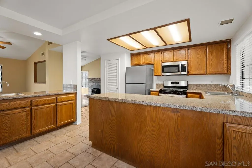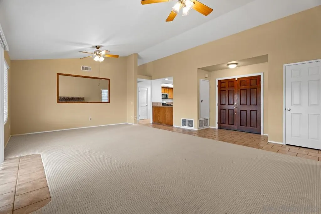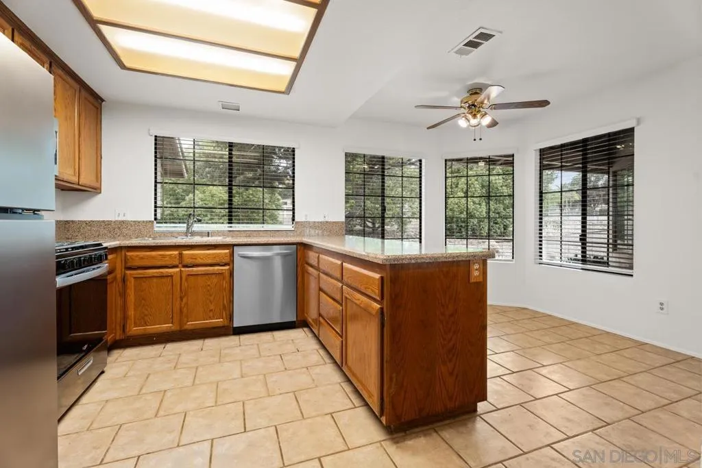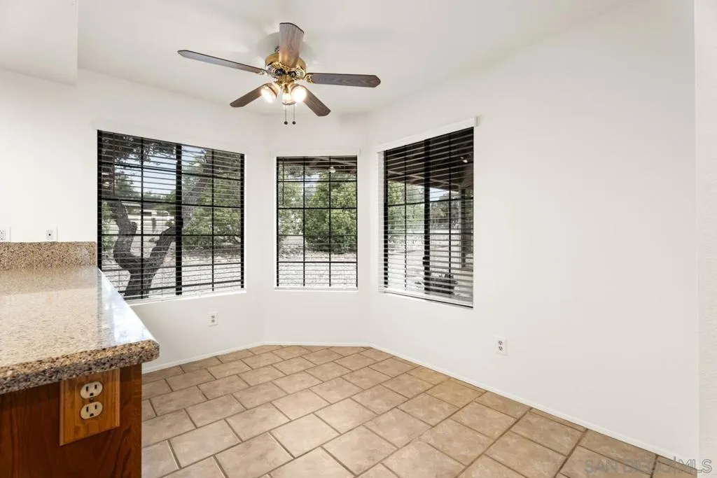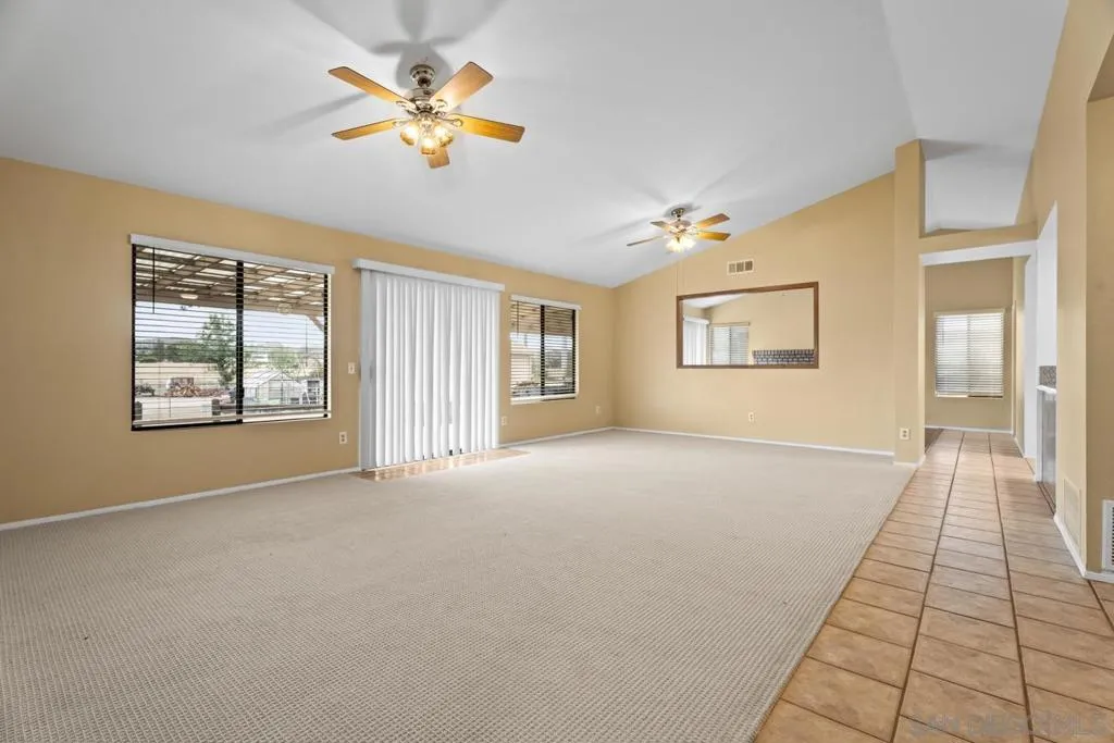 Located in the Heart of Ramona, close to Elementary, Middle and High Schools. This 3 bed, 2 bath country ranch-style home sits on 1.14 level acres with front and rear road access. Solar adds efficiency, and the open layout offers abundant natural light, vaulted ceilings, and ceiling fans throughout, with a spacious living room, formal dining, and a family room with wood-burning stove insert. The kitchen features Corian countertops, an eat-in area, large peninsula, and a second prep sink. New carpet and fresh interior paint make it move-in ready, and both bathrooms include dual sink vanities. The primary suite opens to a private covered patio. The property offers excellent versatility with a garage, carport, detached office with power and A/C, and a separate shop. Additional features include a dog run, RV parking, and usable land. The rear portion of the lot is currently rented, offering optional income potential.
